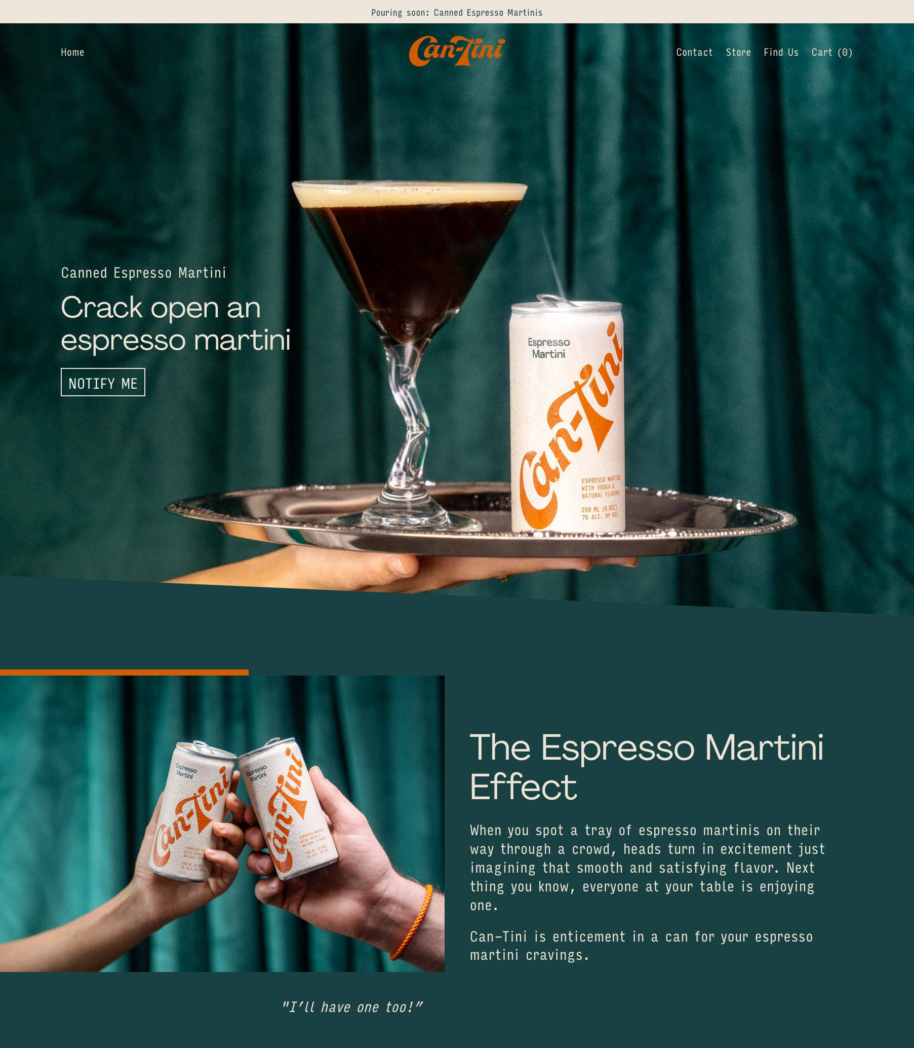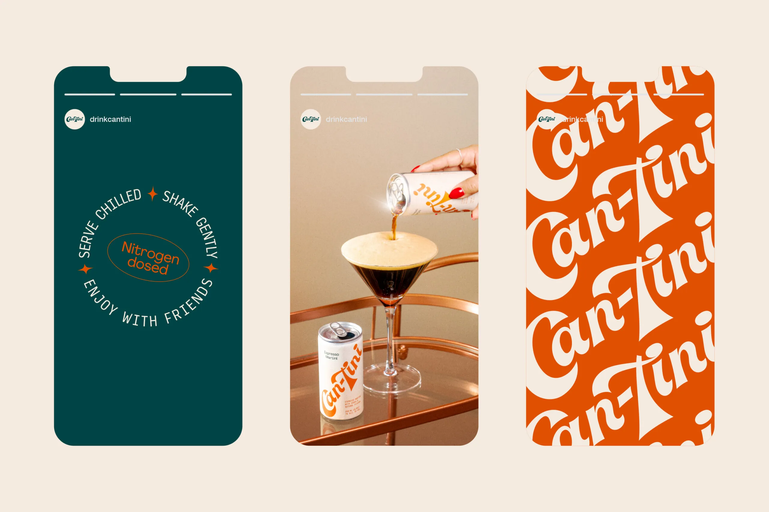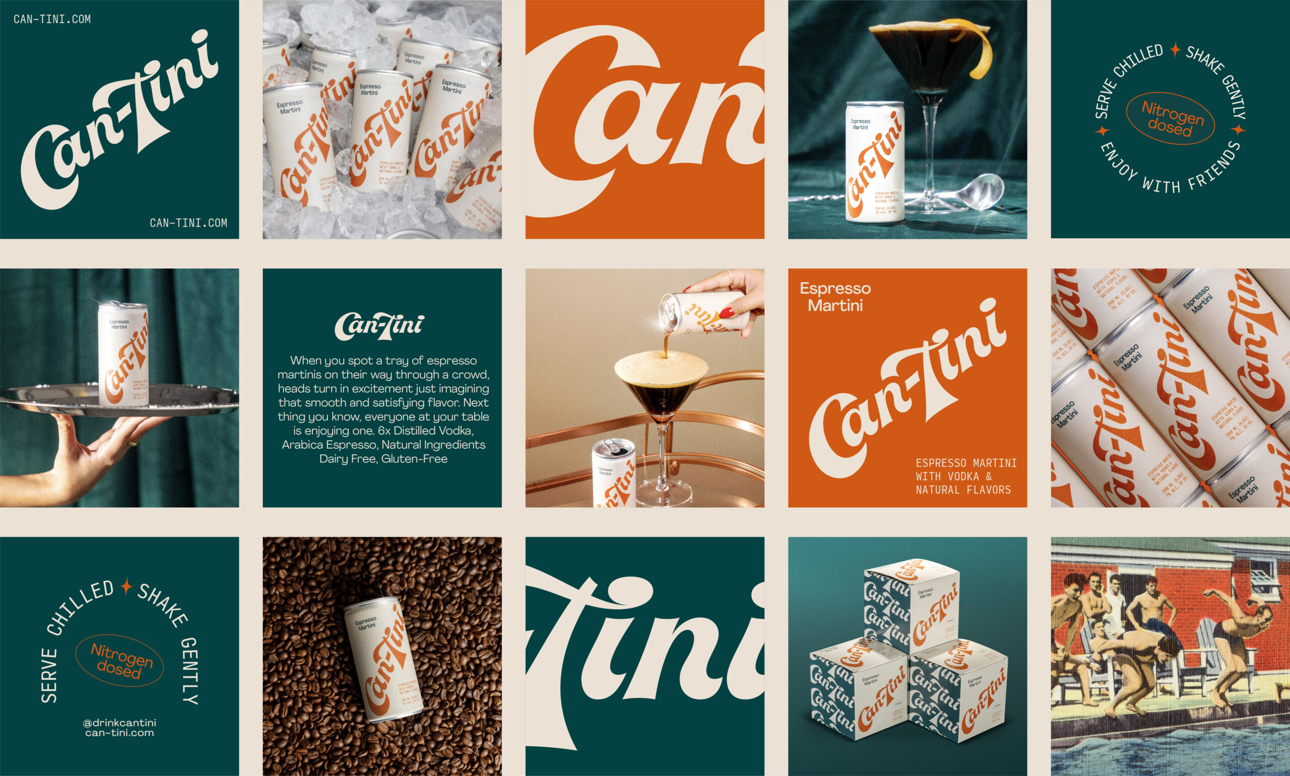 Can-Tini is a new ready-to-drink cocktail brand specializing in Espresso Martinis. With the iconic drink experiencing a massive revival, the folks at Can-Tini approached us with a clear goal: Capture the fun yet sophisticated feeling of ordering an Espresso Martini at a cool bar — and can it. Starting with our clients’ Wes Anderson meets 60s James Bond inspiration, we were tasked with creating a brand identity, packaging system, and animation style that felt retro, bold, fun, and timelessly stylish while appealing to a younger generation of sartorial drinkers.