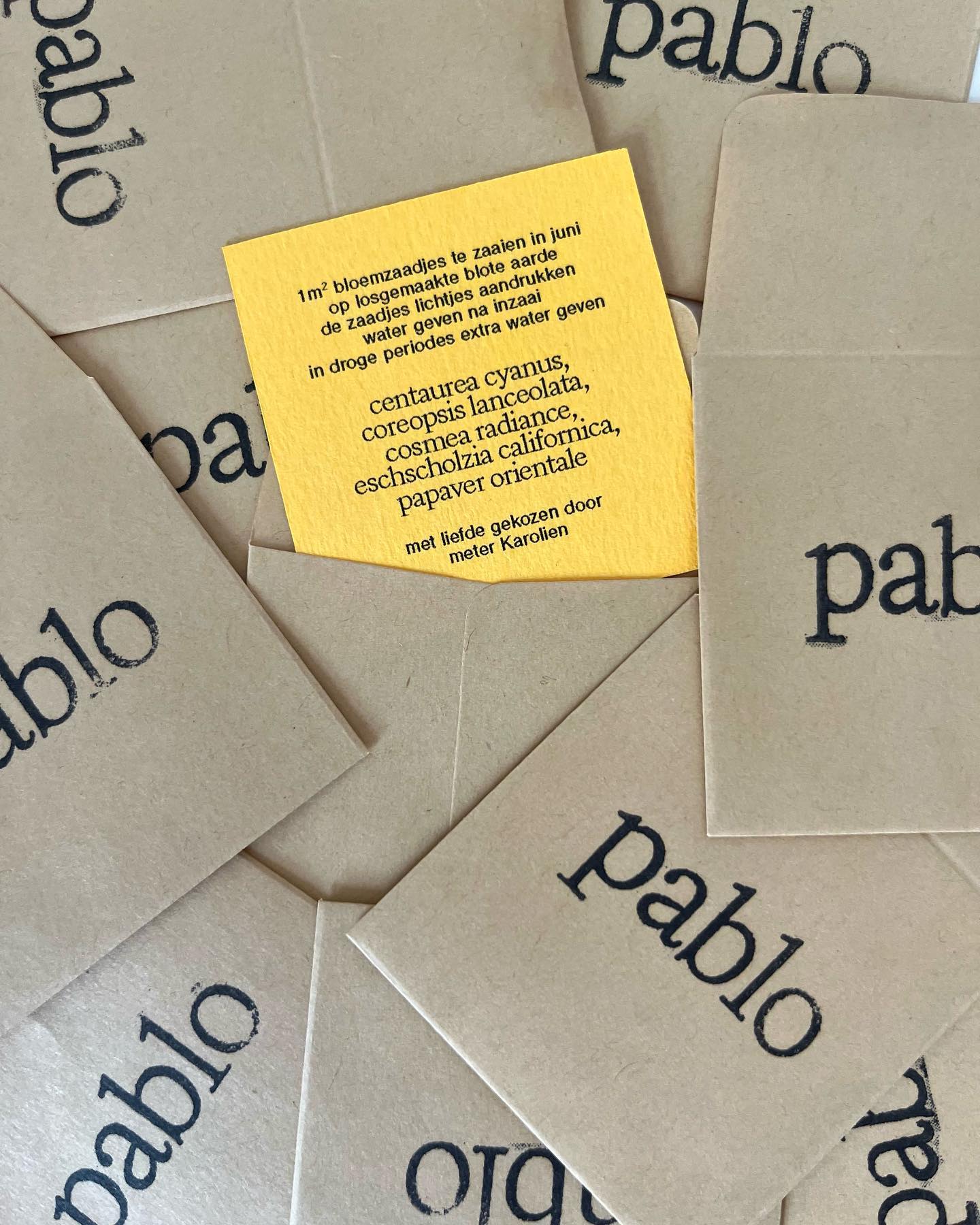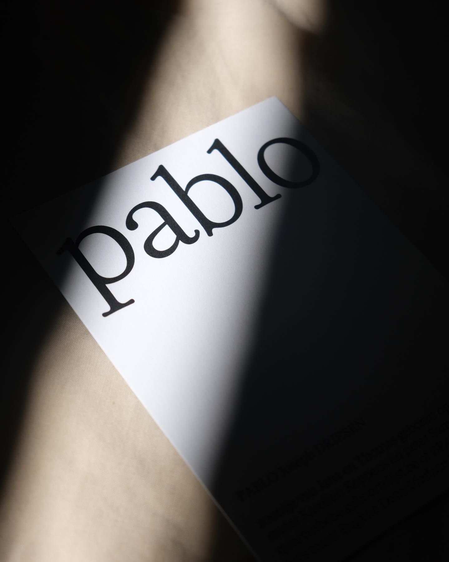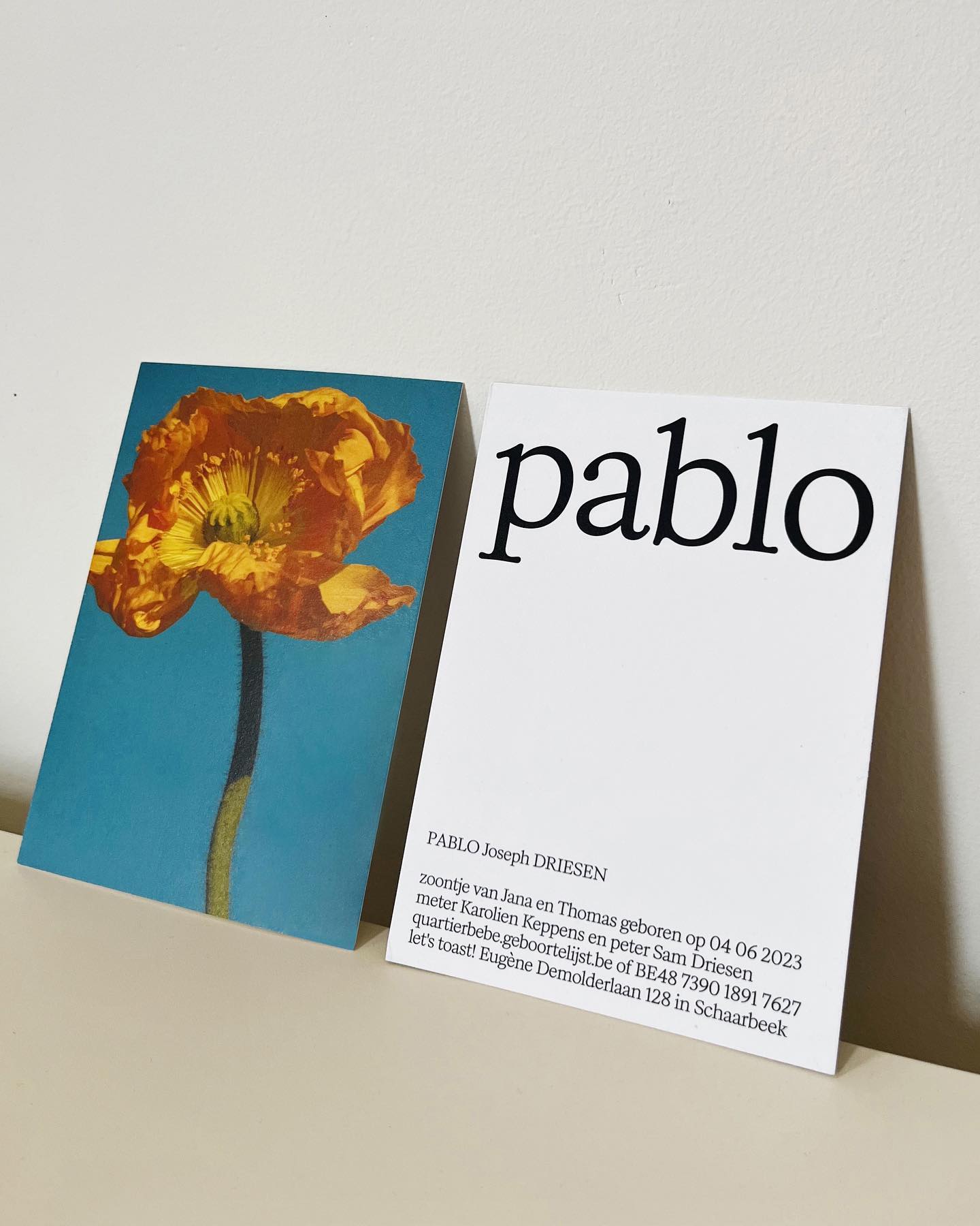 Jana Keppens designed and Thomas Driesen photographed the birth announcement of their own child, Pablo Joseph Driesen, using Kalice by Margot Lévêque and a yet unidentified sans serif.