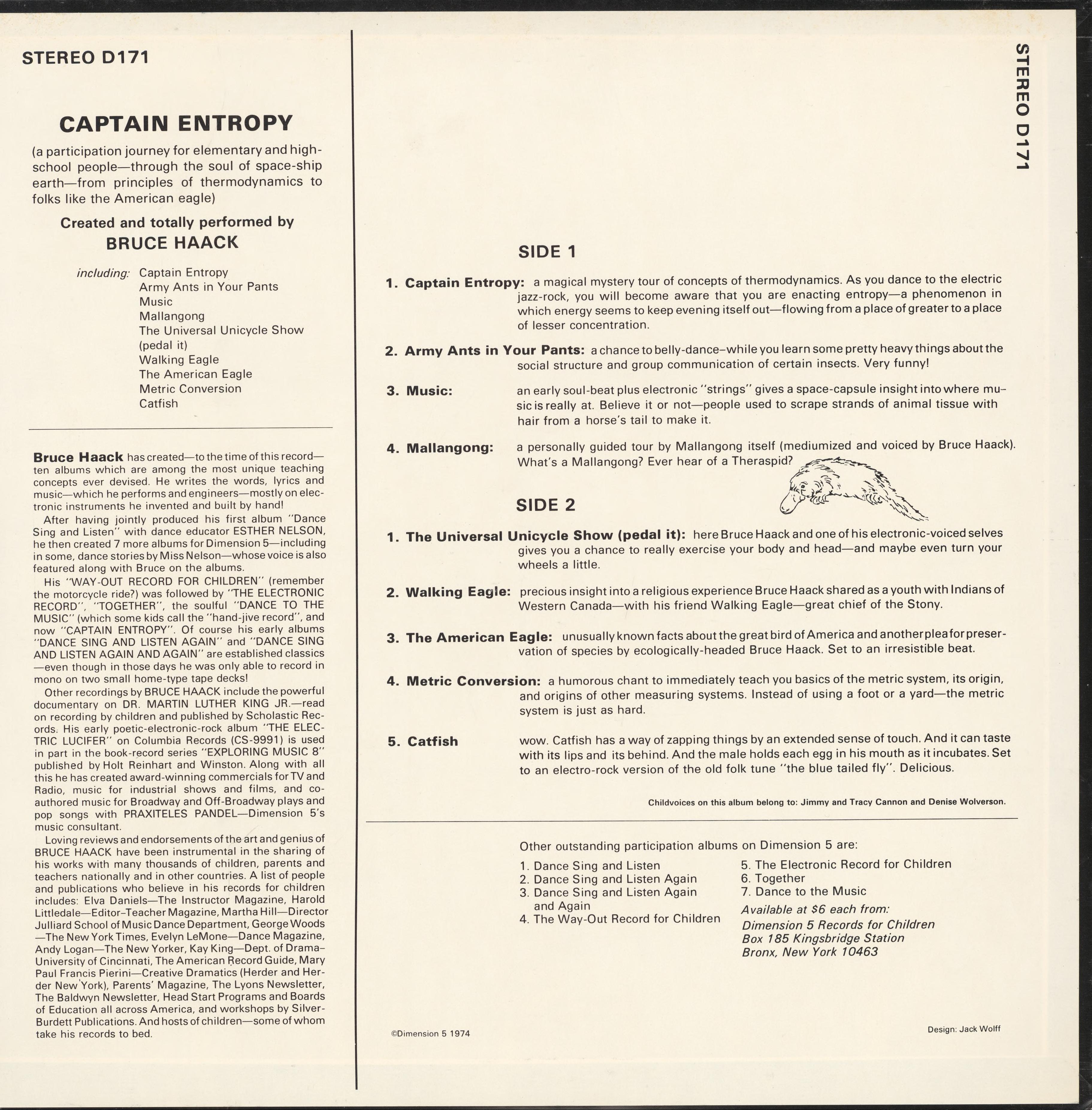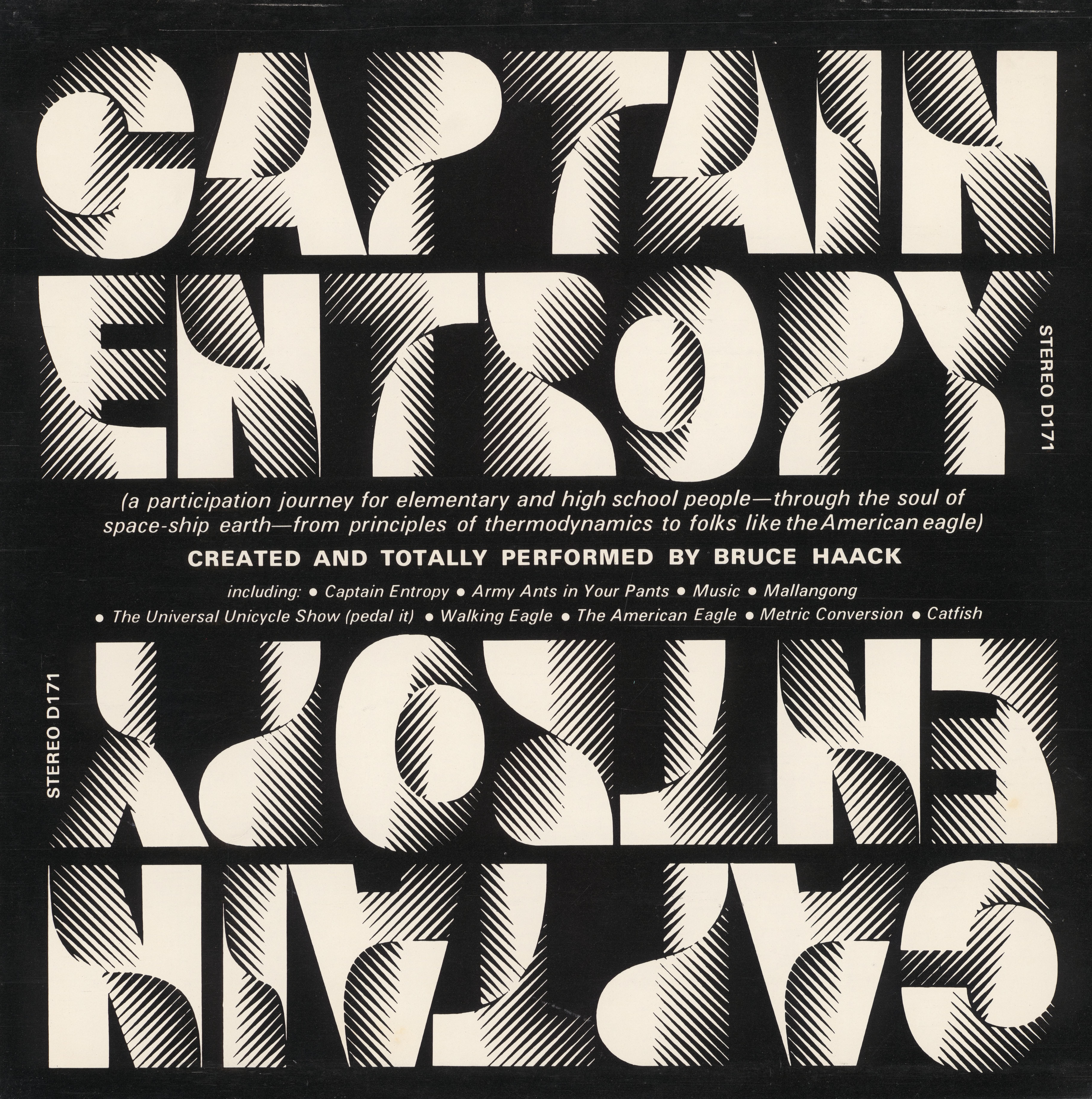 Captain Entropy is a children’s album by Canadian musician and composer Bruce Haack (1931–1988). The spectacular three-dimensional letterforms on this album cover were not custom drawn by designer Jack Wolff. They are from a ready-made alphabet named Allen Stingray.