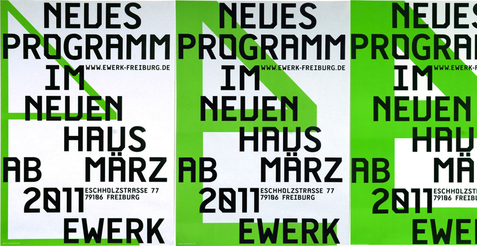 E-Werk Freiburg Posters Contributed by Nouvelle Noire on Dec 18th, 2013. Artwork published in 2011. Source: www.nouvellenoire.ch Nouvelle Noire, Clovis Vallois. License: All Rights Reserved. The posters for E-Werk Freiburg use NN Ernesto, designed in 2010–11 by Clovis Vallois and published by Nouvelle Noire. Source: www.nouvellenoire.ch Nouvelle Noire, Clovis Vallois. License: All Rights Reserved. Source: www.nouvellenoire.ch Nouvelle Noire, Clovis Vallois. License: All Rights Reserved. Typefaces More about NN ErnestoGet NN Ernesto Formats Posters/Flyers (5872) Topics Event (3287) Music (6454) Performing Arts (1013) Designers/Agencies Clovis Vallois (3) Tagged withposters (1444)series (1189)concerts (121)dance (223)theater (340)programs (650)one typeface, one size (415)one word per line (206)all caps (7798)green (784) Artwork location Switzerland (1133) Germany (3924) Zürich (311) Freiburg (17) Post a comment Name Email – will not be published Website Your response Submit Comment More in Music Daddy – Myself album art2021Daniele RiccitelliAlessandro PaolettiNot Found StudioContributed by TYPE01 Staff Pick Tommy Roe – “Dizzy” / “The You I Need” German single cover1969KochlowskiContributed by Garrison Martin Spacemen 3 – Playing With Fire album art1989Robert Winterman Design GroupSpacemen 3Contributed by John O'Reilly Sponsor More in Posters/Flyers Place Internationale Hellersdorf2023Leon LechnerContributed by Inès Davodeau Copies / Multiples exhibition posters, Quintal Éditions2018Oscar GinterContributed by Oscar Ginter Jeremiah Johnson movie posters and lobby cards1972unknownContributed by Garrison Martin Staff Pick Yaloo Lim Experimental Animation Visiting Artist posters2026Sen ParkContributed by Sen Park More Fonts In Use St. Leo visual identity2020Alex Hunting StudioContributed by Alex Hunting Studio Staff Pick Eddie Chacon – Sundown album art and singles2023Justin SloaneContributed by Florian Hardwig Staff Pick Issy Wood – Study For No at Lafayette Anticipations2023Pierre VanniContributed by Production Type Staff Pick Bokhari2020Tank Design OsloContributed by Mihail Mihaylov Staff Pick Jazz Sur le Grill, 5e édition2019Brest Brest BrestContributed by Benoît Bodhuin Staff Pick Doe Maar – Skunk album art1981Contributed by Nick Sherman Staff Pick Éditions Galaade book fair brochure2009Hey HoContributed by Tânia Raposo Staff Pick Tulipes posters, Jardin botanique Genèvec. 1979Line GuibentifSaskia Pernin-WikströmSuzanne Van HoveContributed by Mathieu Christe Staff Pick