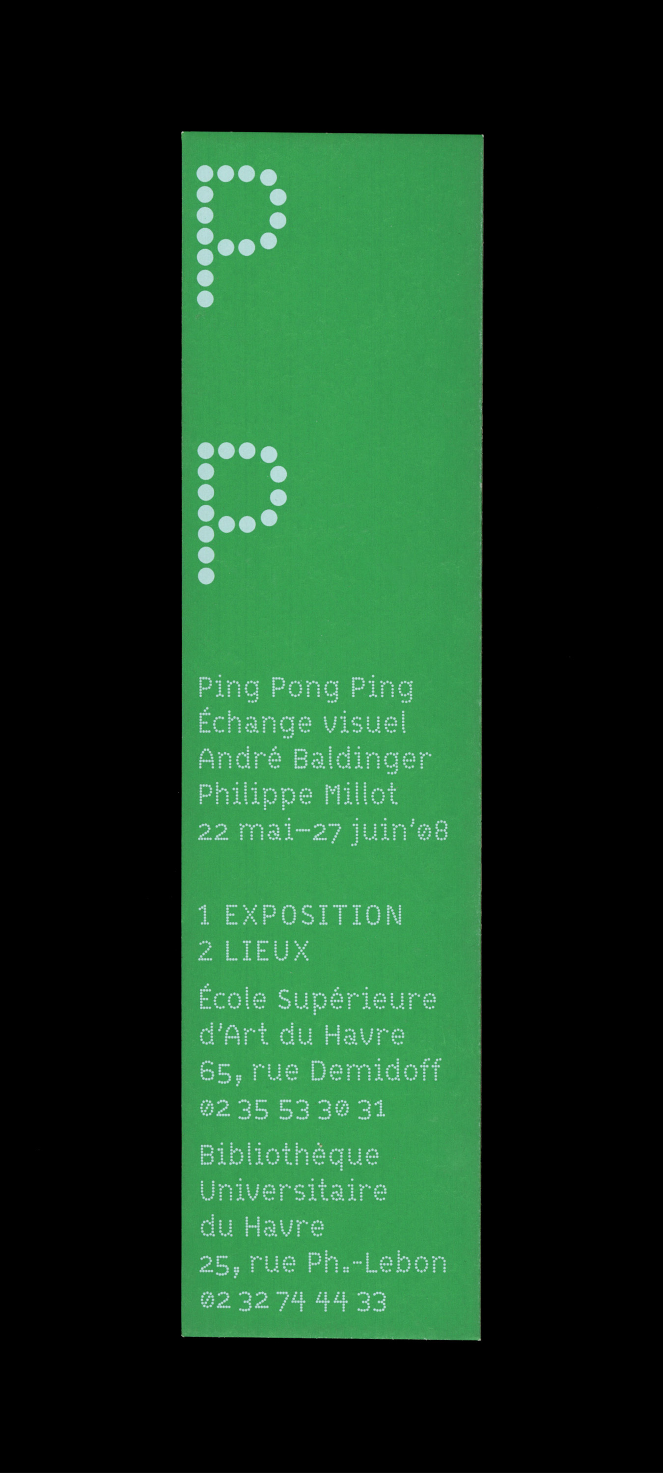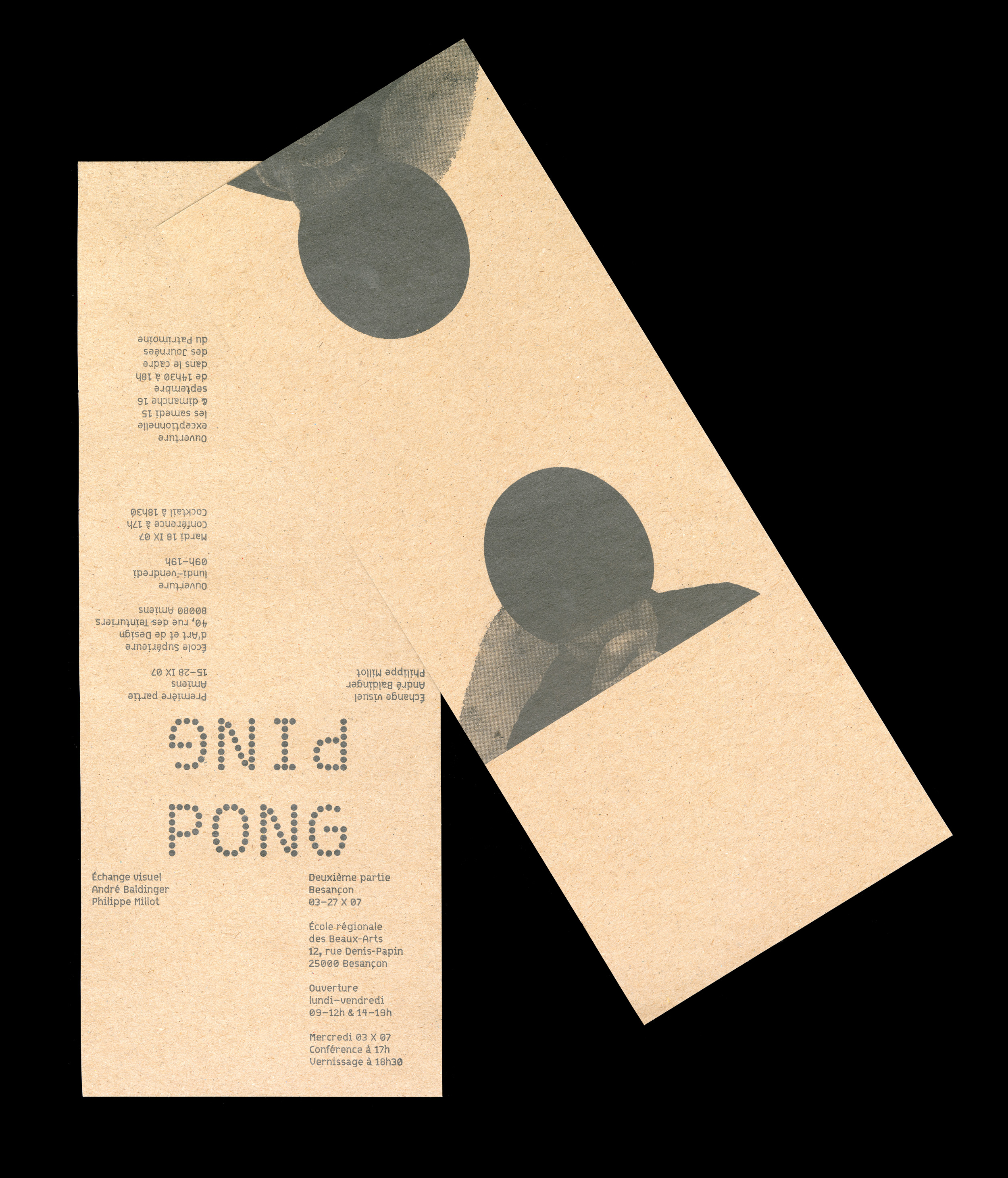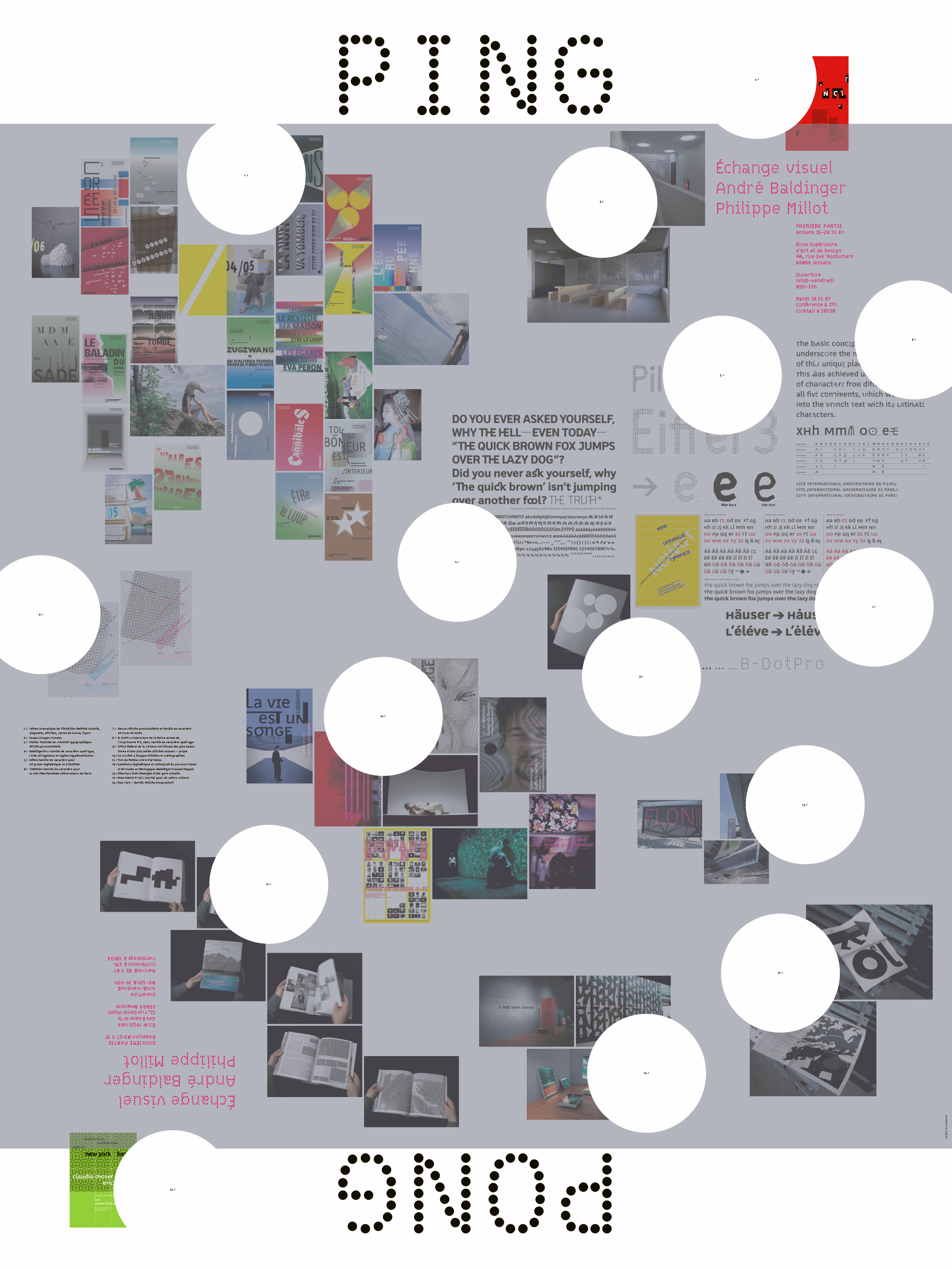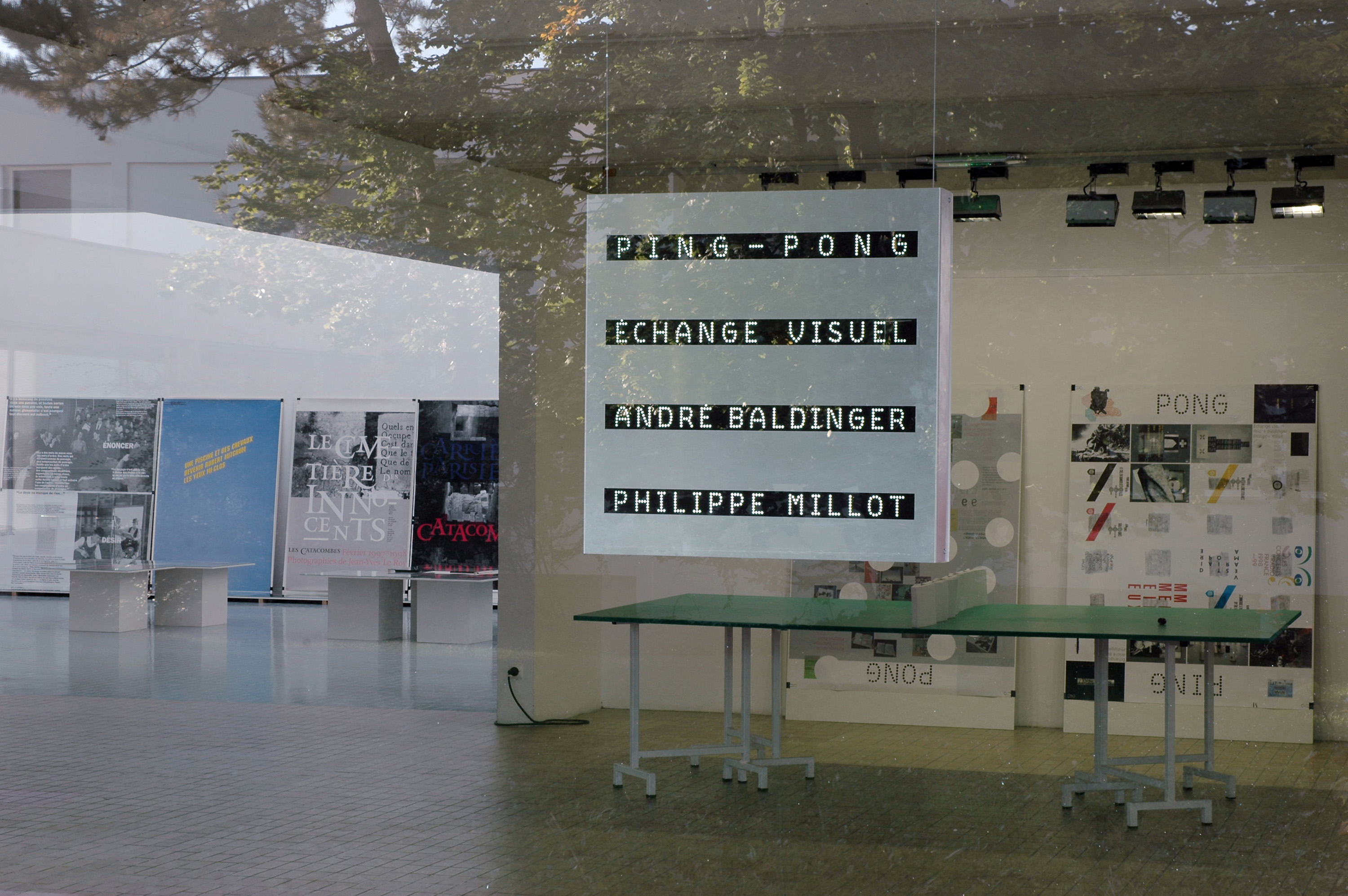 In 2007, an exhibition in three parts was organized around the work of André Baldinger and Philippe Millot. The exhibition, named Ping-Pong, Échange visuel presented a selection of their work from the last ten years. From type design to signage, through visual identity or the design of books and posters or scenography, their work covers a wide spectrum of visual expression and is regularly the subject of publications, awards and distinctions.
