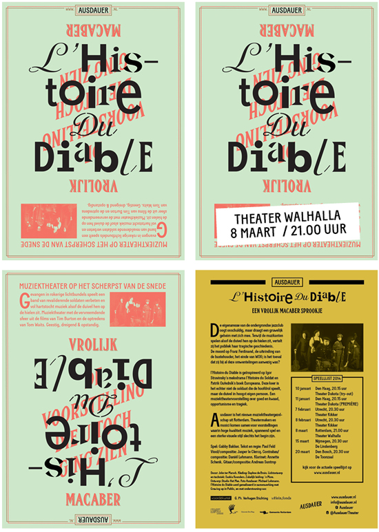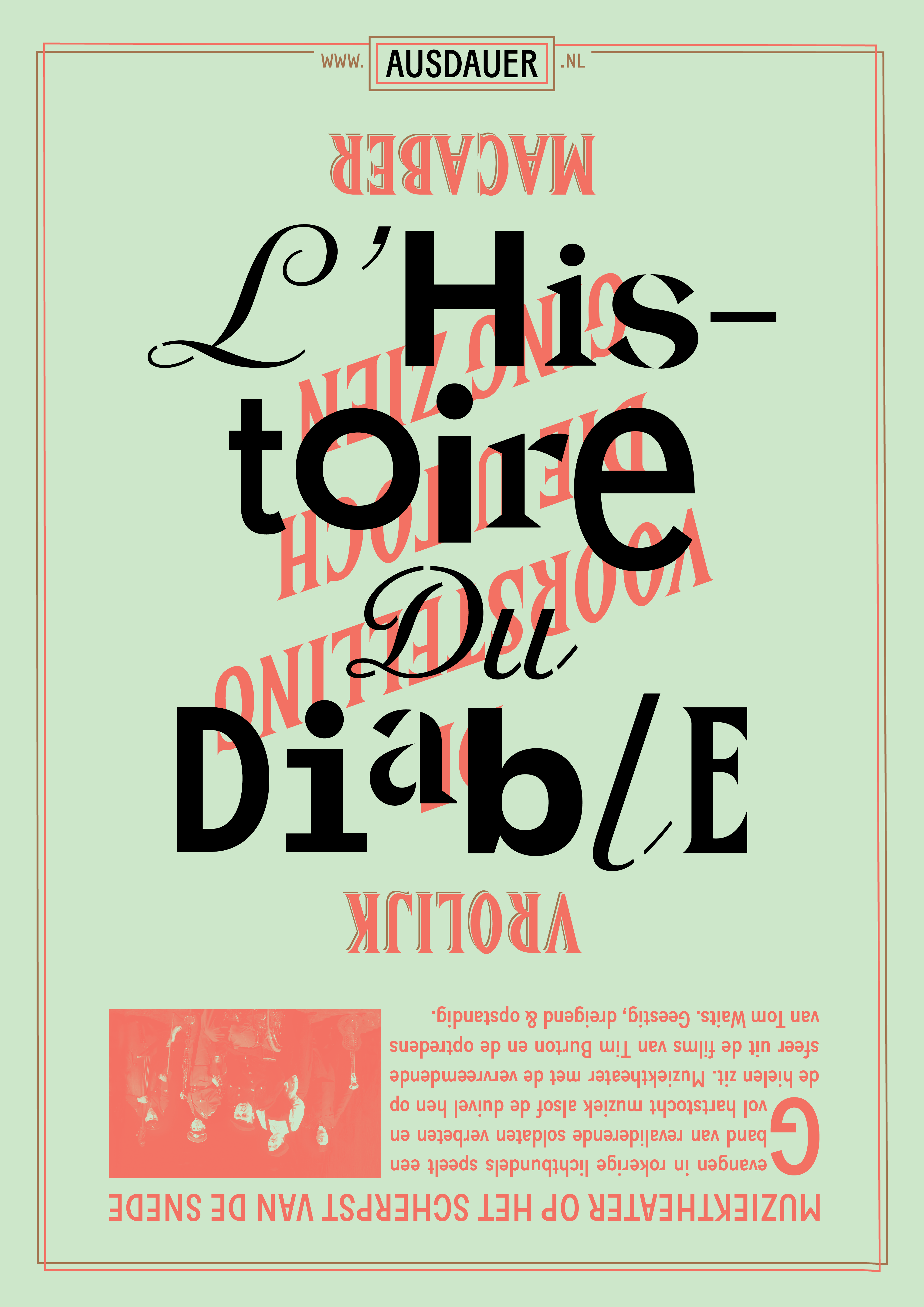 Visual identity for music theatre group Ausdauer. L’Histoire du Diable is a remake of Strawinsky’s l’Histoire du Soldat (1918). The play is situated in a smoky bar in Paris, right after WWI. A group of soldiers play an alienating mix of Strawinsky, Jazz, marching music, as the innkeeper tells her story. She was there when things went wrong in WWI. Moreso, she was decisive, maybe she was the devil in person. Or so she claims.