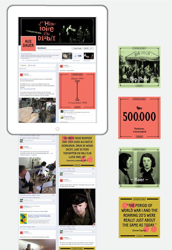 Describing events instead of actually showing the action onstage was the starting point for the posters, flyer and a small facebook campaign. A dadaïst lettering for the title is paired with vernacular, centered typography. The big words under the title say: “Funny. Macabre. The show you visited after all”. In referral to silent movies, a set of dialogue cards were made for Facebook. The cards show grotesk facts and numbers from the Big War, cameos from the play and newspaper quotes.