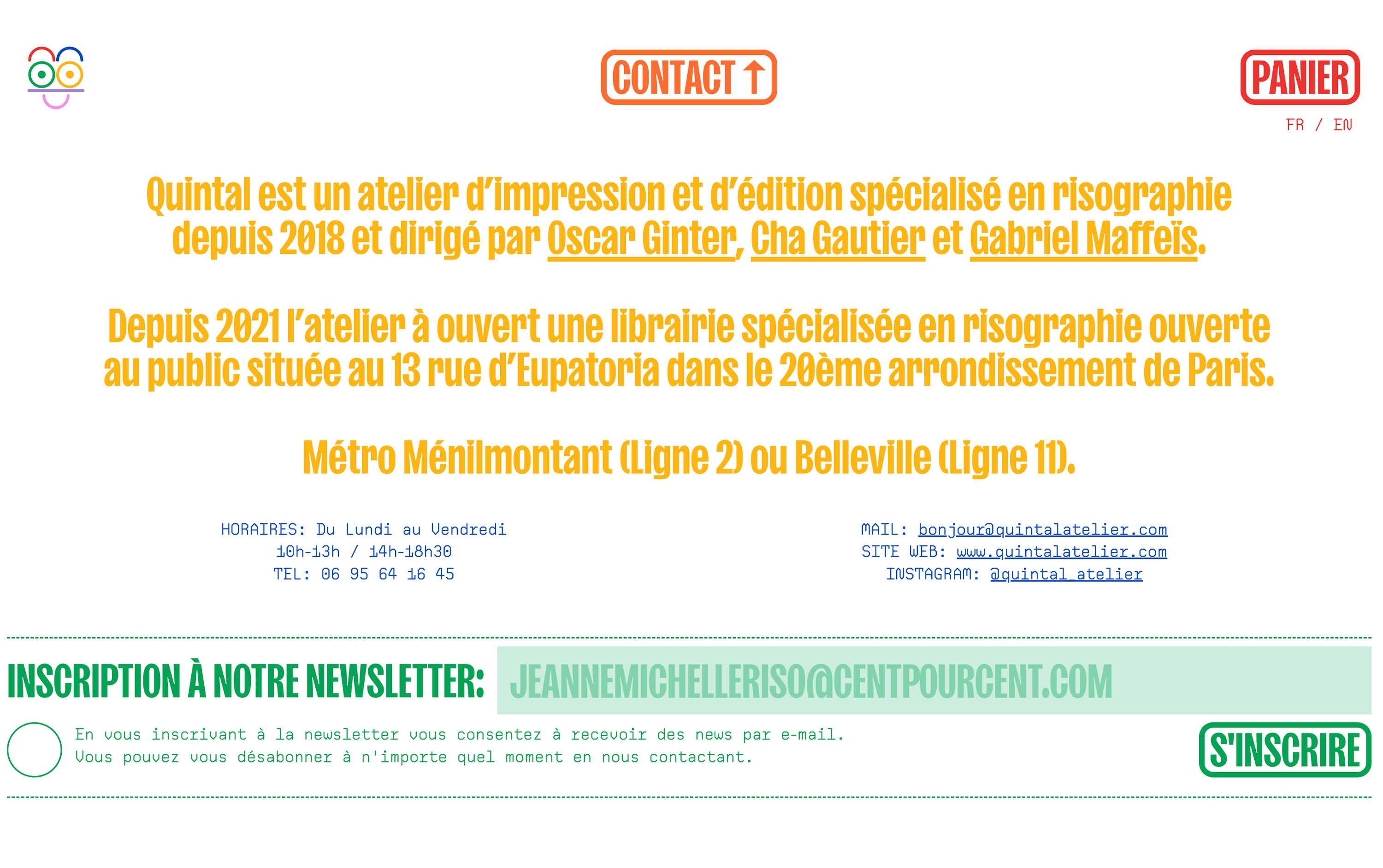 Quintal Atelier Contributed by Oudin Romain on Aug 29th, 2023. Artwork published in December 2022. Source: www.instagram.com License: All Rights Reserved. Atelier Choque Le Goff created a colored visual identity based on a pair of expressive fonts – Sans Plomb (from lift-type) and Numerical Edition (from Elias Hanzer) – for Quintal Atelier: Quintal is a printing and publishing workshop specializing in risograph printing. It has opened a bookstore specializing in risography open to the public located at 13 rue d’Eupatoria in the 20th arrondissement of Paris. Source: www.instagram.com License: All Rights Reserved. Source: www.instagram.com License: All Rights Reserved. Source: www.instagram.com License: All Rights Reserved. Source: www.instagram.com License: All Rights Reserved. Source: www.instagram.com License: All Rights Reserved. Source: quintalatelier.com License: All Rights Reserved. Source: quintalatelier.com License: All Rights Reserved. Source: quintalatelier.com License: All Rights Reserved. Source: www.instagram.com License: All Rights Reserved. Typefaces More about Sans PlombGet Sans PlombMore about Numerical EditionGet Numerical Edition Formats Web (5638) Branding/Identity (8474) Posters/Flyers (5780) Topics Services (1559) Graphic Design (3015) Retail/Shopping (1113) Art (4703) Designers/Agencies Atelier Choque Le Goff (13) Tagged withRisograph printed (237)printing services (54)identities (2364)logos (5013)dotted I (82)enamel pins (19)French (language) (2549)colorful/multicolored (1079)type in a box (711)round corners (286)smileys (84)typeface combinations (3959)stationery (806)business cards (1541)monospaced (1248)type on type (532)anniversaries (359)websites (3580)web forms (53)borders and rules (1127)dotted lines (156)reversed type (3389)online shopping (390)early uses (2248)Quintal Éditions (3)Quintal Atelier (11) Artwork location France (2851) Paris (1322) In SetsLM (Amy Chen) (66)Favourites (Lucas Bevilaqua) (1150)Colors (Lucas Bevilaqua) (808)Pairings (Lucas Bevilaqua) (578)Freebird (Zixin Yeo) (11)Identidad (Juan Ortega) (233)bb (Leonardo de la Fuente) (1331) Post a comment Name Email – will not be published Website Your response Submit Comment More Sans Plomb in use La Société des Nouveaux commanditaires2023Studio des formesContributed by Oudin Romain Harris/Walz 2024 US Presidential Campaign2024Wide Eye CreativeAlayna CitrinTal LemingContributed by Stephen Coles Blog Théâtre de l’Union2022Studio BingoContributed by Oudin Romain Staff Pick Sponsor More in Retail/Shopping Galerie Perrie website2021ExhibeaContributed by Exhibea raye the store 08, Beauty Edition2023Studio BöreckContributed by Studio Böreck Staff Pick Niqo Co.2021BASContributed by Bureau Brut JAJU identity2019e-TypesContributed by Playtype Foundry More in Posters/Flyers Modus Coffeec. 2022Mira DesignContributed by Mira Mayne Bonker Bao2020Rubio & del AmoContributed by Julián Garnés García Van Morrison at Fox Theater Oakland concert poster2017Sean FreemanThere IsContributed by Andy Anzollitto They Are Why Ukraine Stands infographic posters2023Víctor OrtizContributed by Víctor Ortiz More Fonts In Use Asimov’s Choice series, Dale Books1977Jack GaughanFrank Kelly FreasContributed by Florian Hardwig Staff Pick NOS2014Wolff OlinsContributed by R-Typography Staff Pick NZZ Bellevue2016EdenspiekermannAnna Maria CiupkaCarolin SchnurrerContributed by Revolver Type Foundry Staff Pick Mille Bornes Card Game (1960 Parker Brothers Bilingual Edition)1960Joseph Le CallennecContributed by Chris Purcell Staff Pick