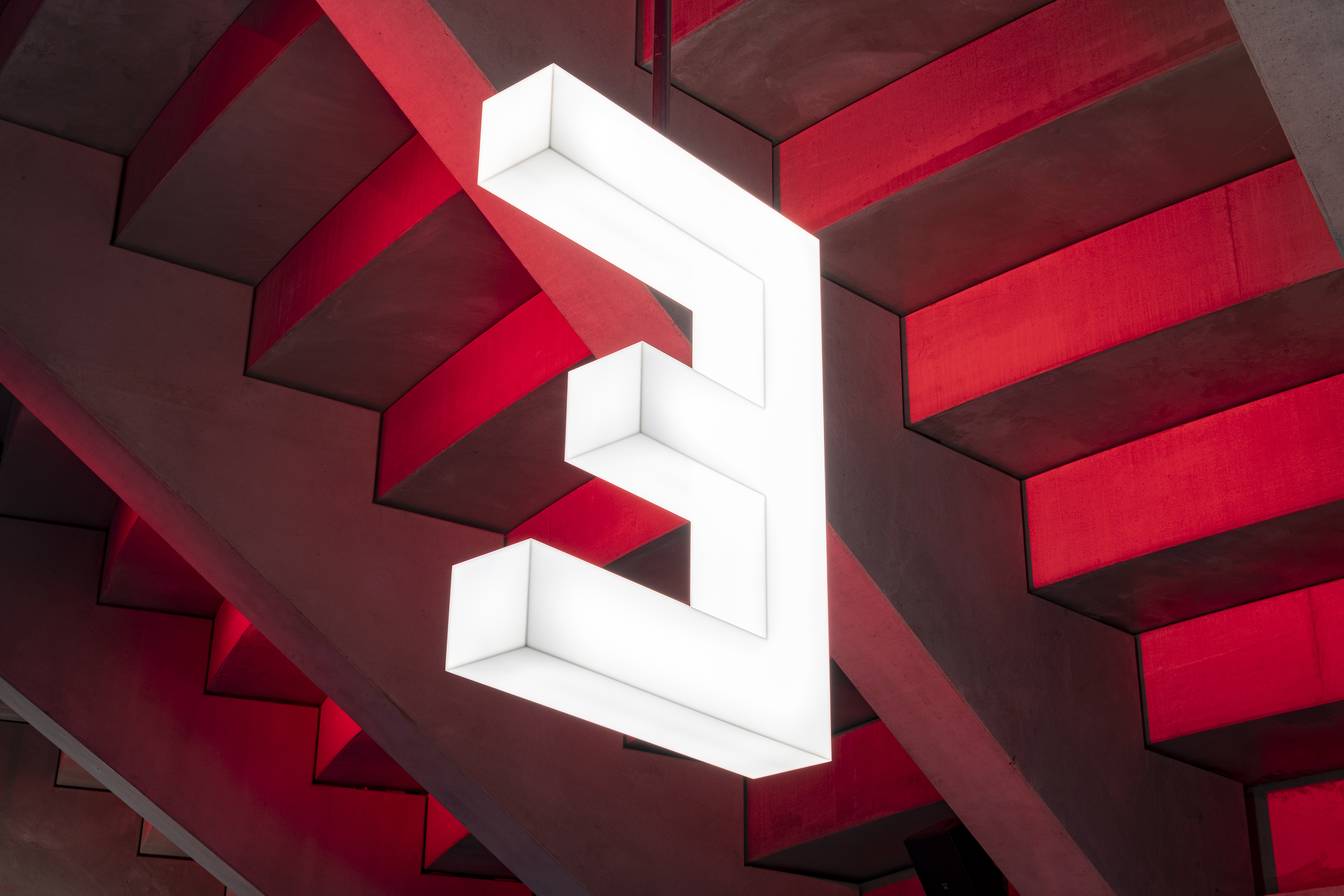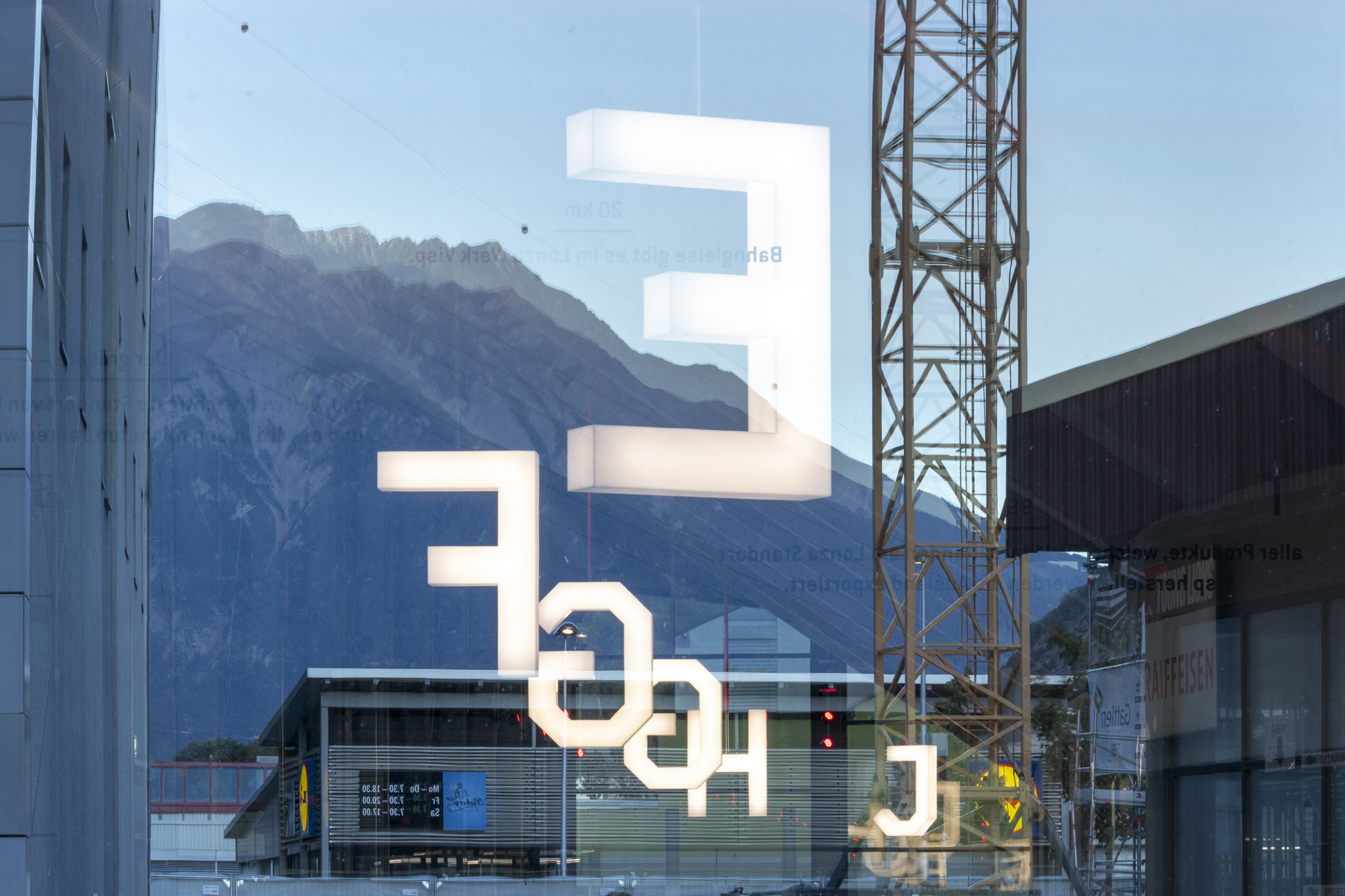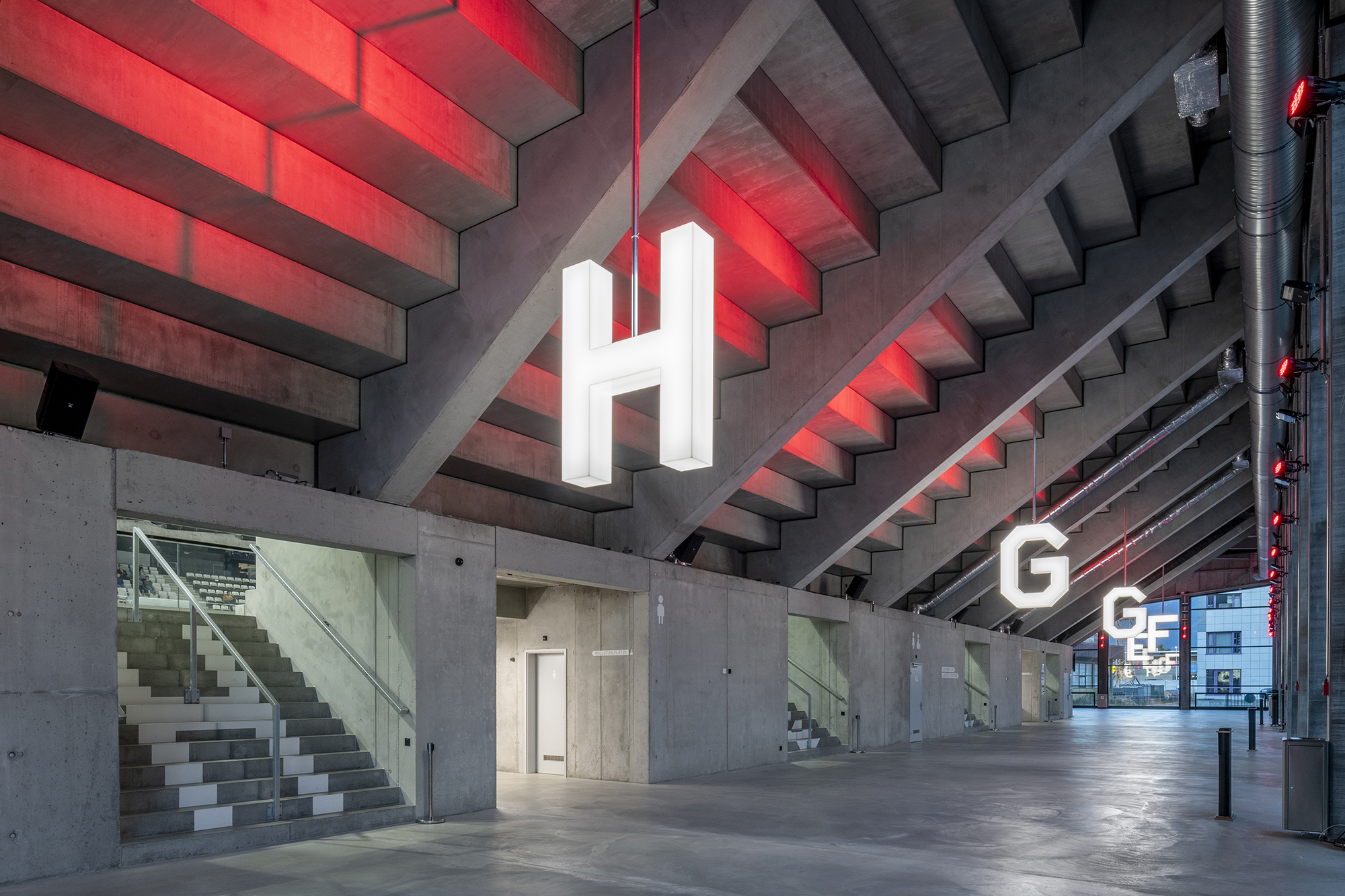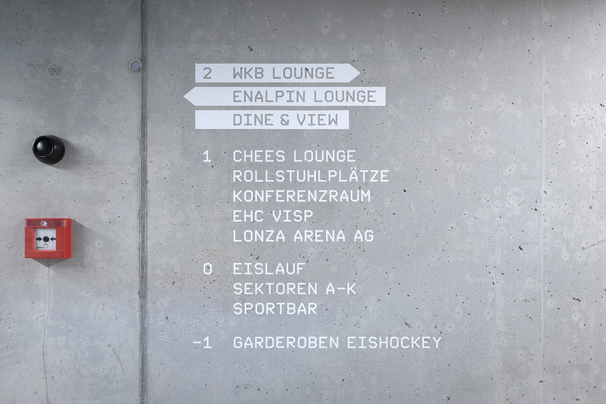 The Lonza Arena in Visp, Switzerland, was designed as an ice sports and event hall and is home to the EHC Visp. The large illuminated letters made of acrylic glass reinforce the spatial effect of sector access area. FRAC Lonza is a custom version of the FRAC typeface by Binnenland which complements the architectural design language. From the outside, the function as a sports facility is emphasised by the striking sector indicators.
