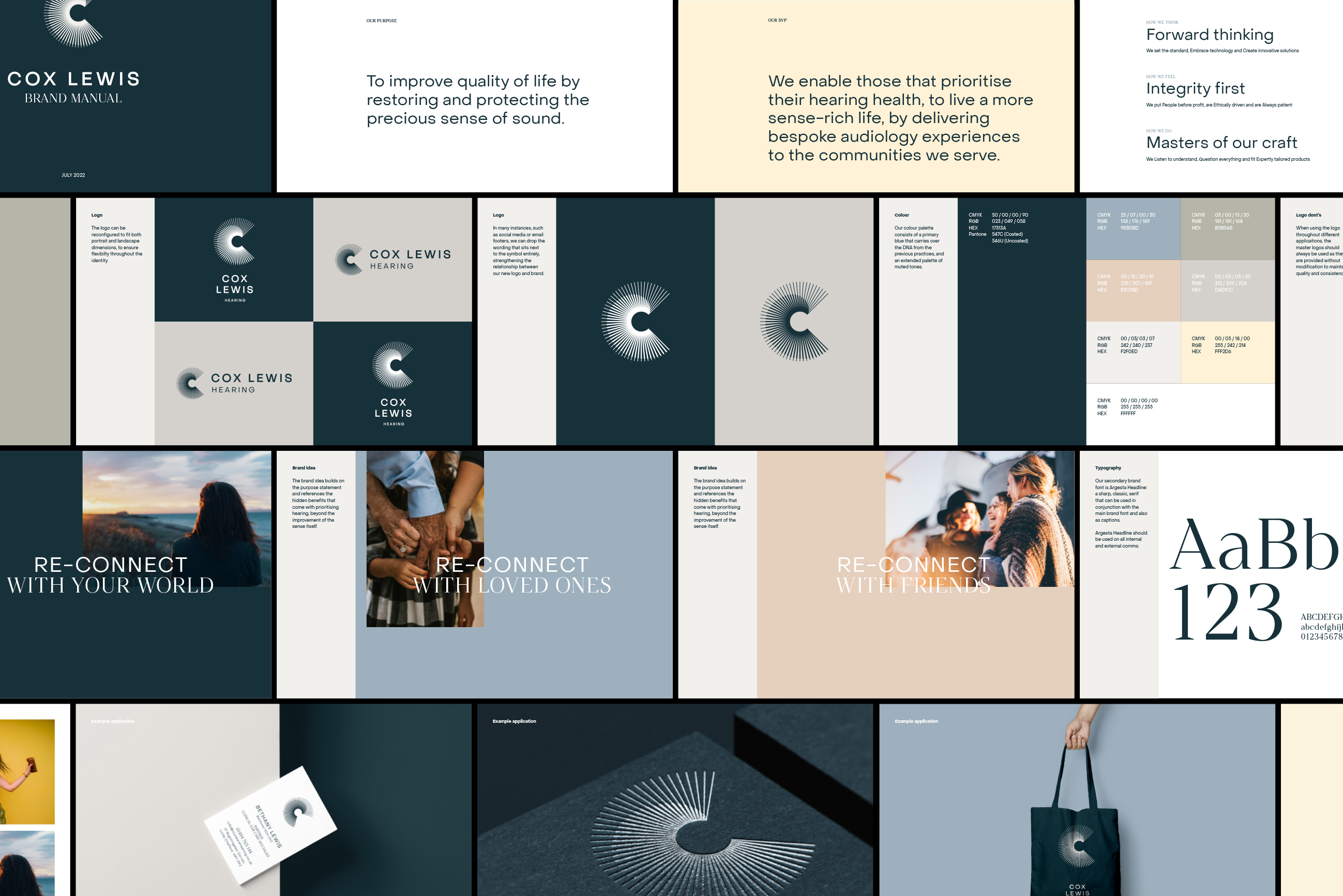 The logo of Cox Lewis Hearing uses Object Sans by Pangram Pangram, whilst the rest of the identity flexes between Object and Argesta by Atipo.