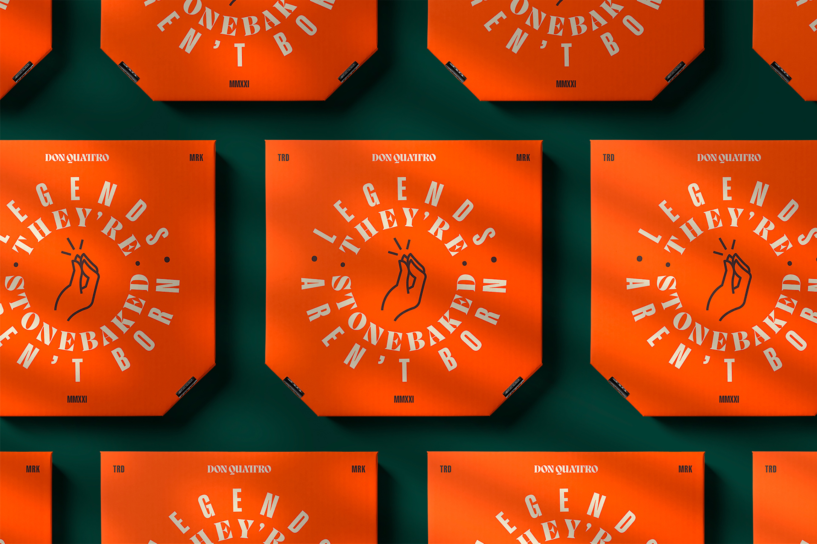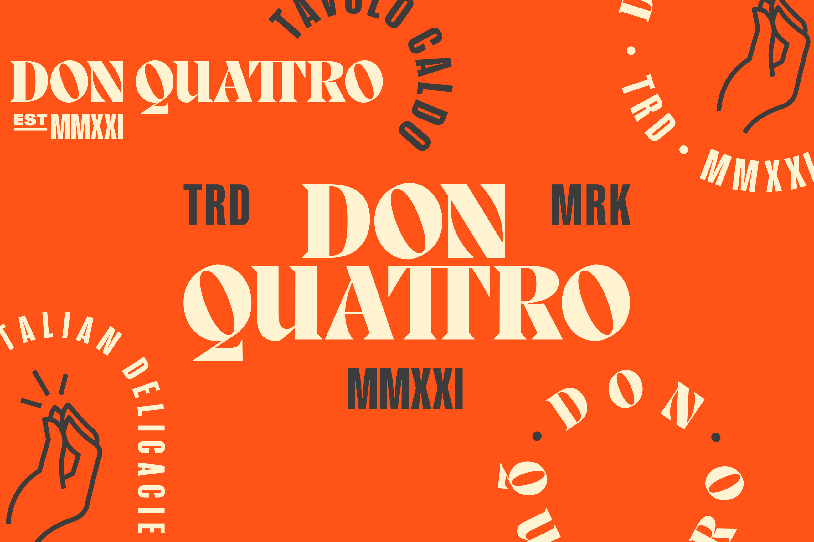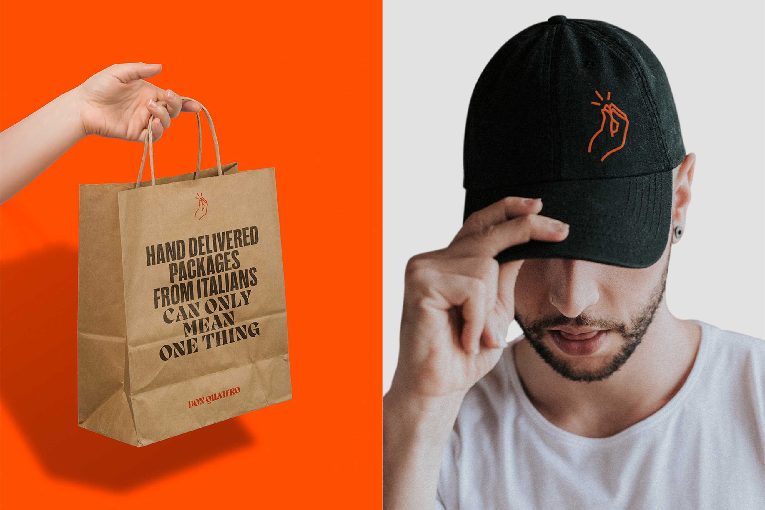 During the Covid-19 pandemic, Donatello, a renowned independent restaurant in Warrington, adapted their business by offering takeaway and delivery services. As restrictions eased, the demand remained high and Don Quattro was born. Serving as a separate entity from the parent restaurant, whilst leveraging two decades of a local institution, the new brand embraced the mystery and legend surrounding the original Donatello, incorporating bold graphics and clever copywriting to add humour and satire to traditions that had become clichés.