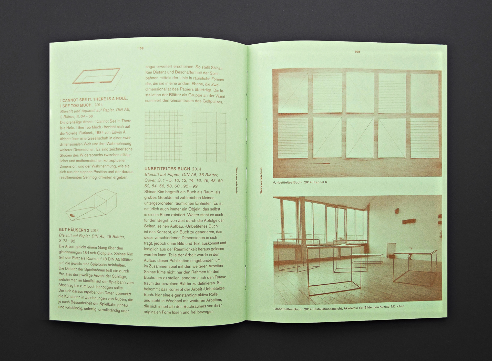 Sculptor Shinae Kim is fascinated by measuring her world. By recomposing these measurements, numbers turn into objects with a soul. Moreover, for her even a simple pencil line is a spatial object, as it leaves a tiny graphite layer on the paper. In consequence, the book was designed as a three-dimensional space on its own by arranging the original artworks into new layers and compositions.