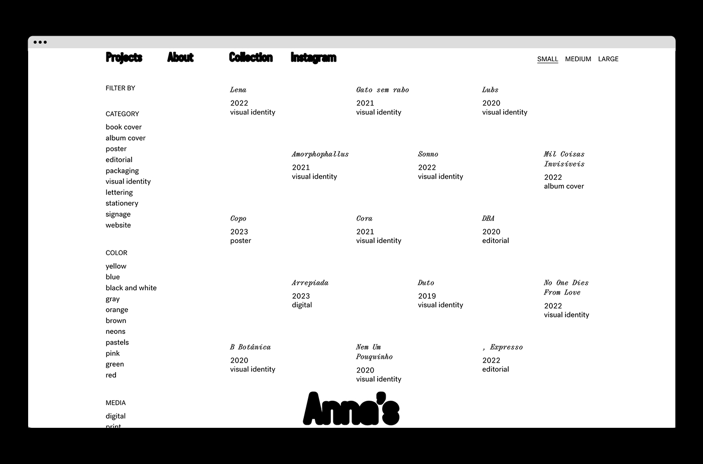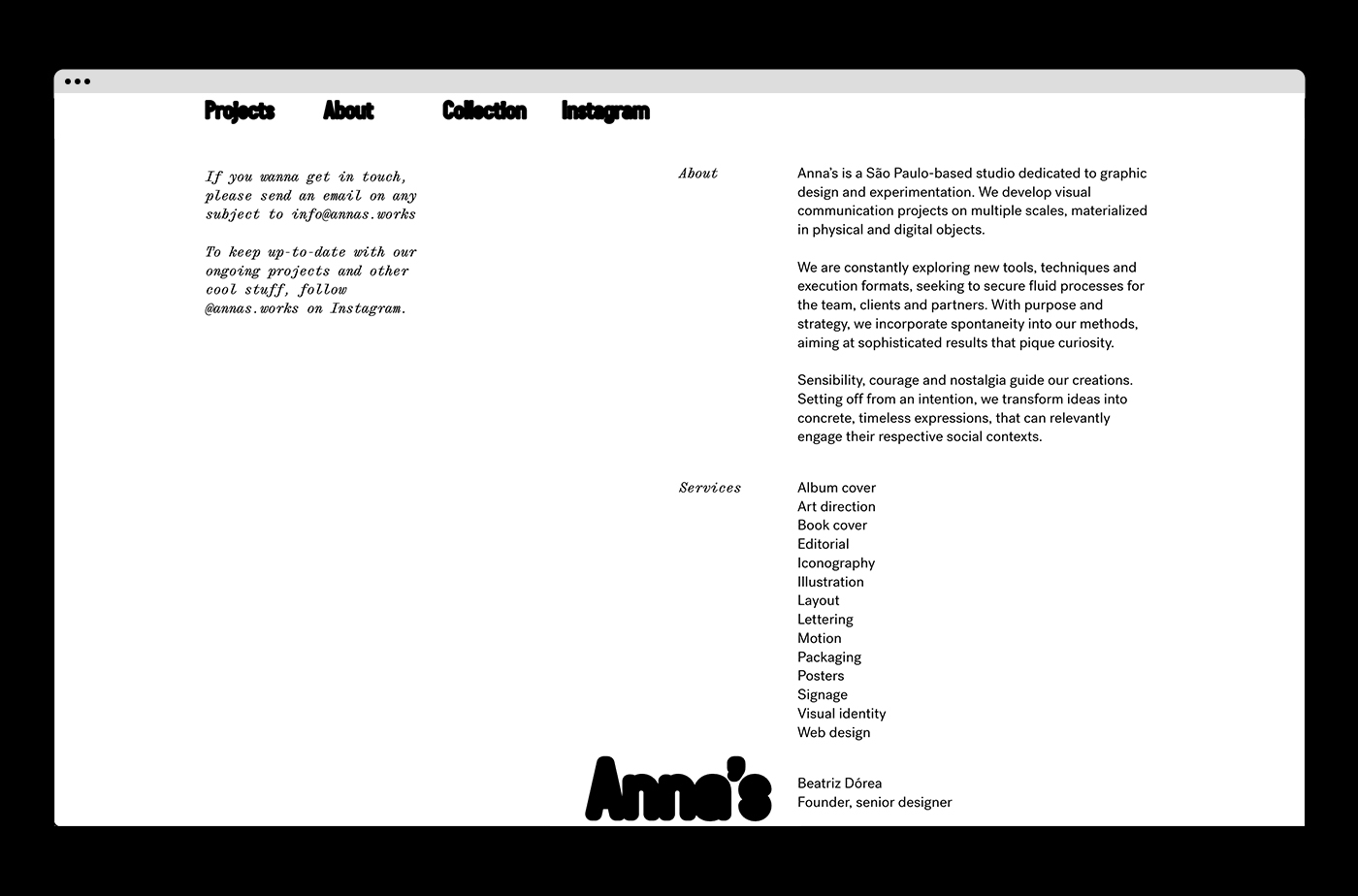 Anna’s is a São Paulo-based studio dedicated to graphic design and experimentation. Our visual identity features a concise black and white palette to make our vivid projects come to life, creating a clean result but with an edgy approach, featuring illustrations by Mateus Acioli.