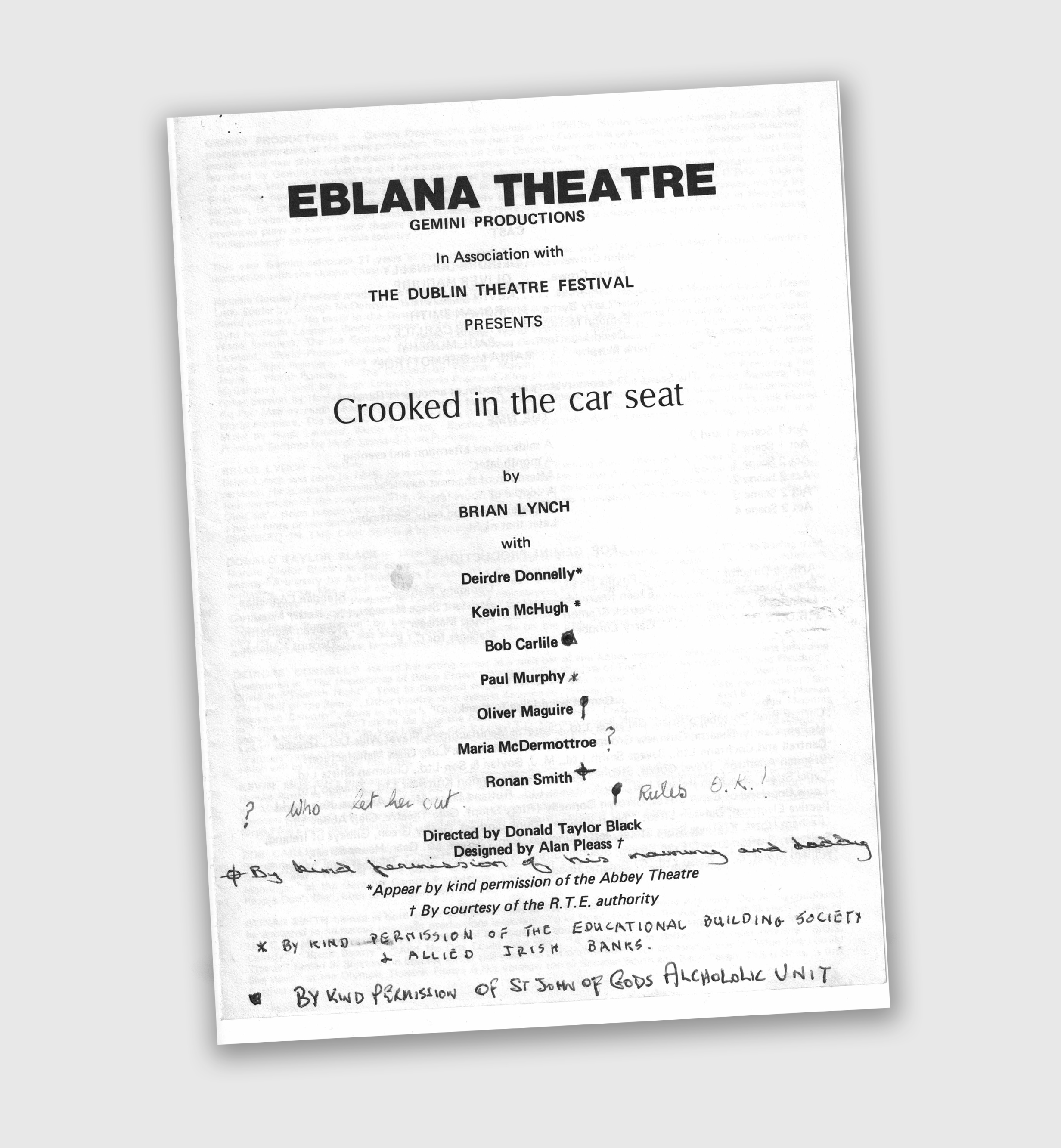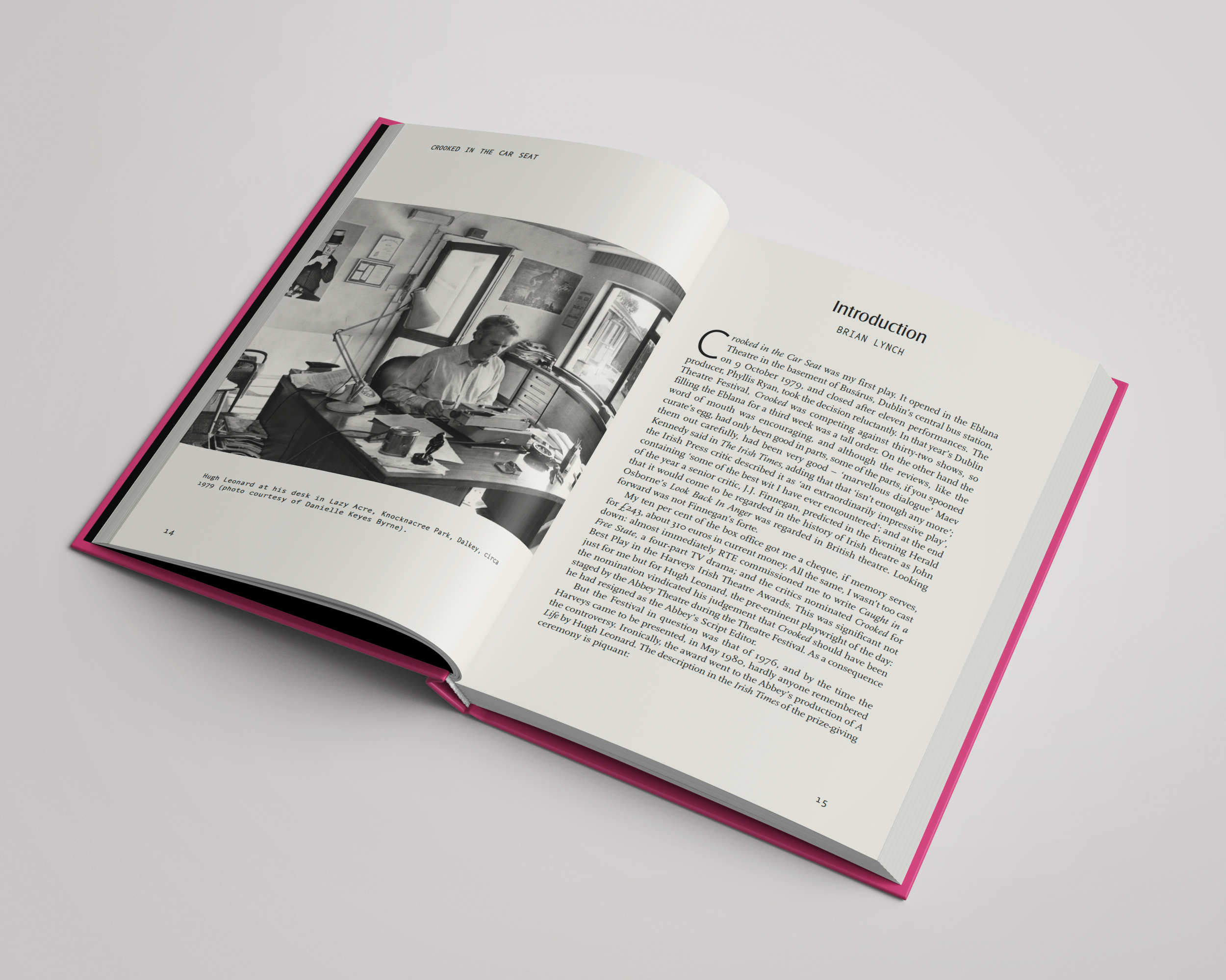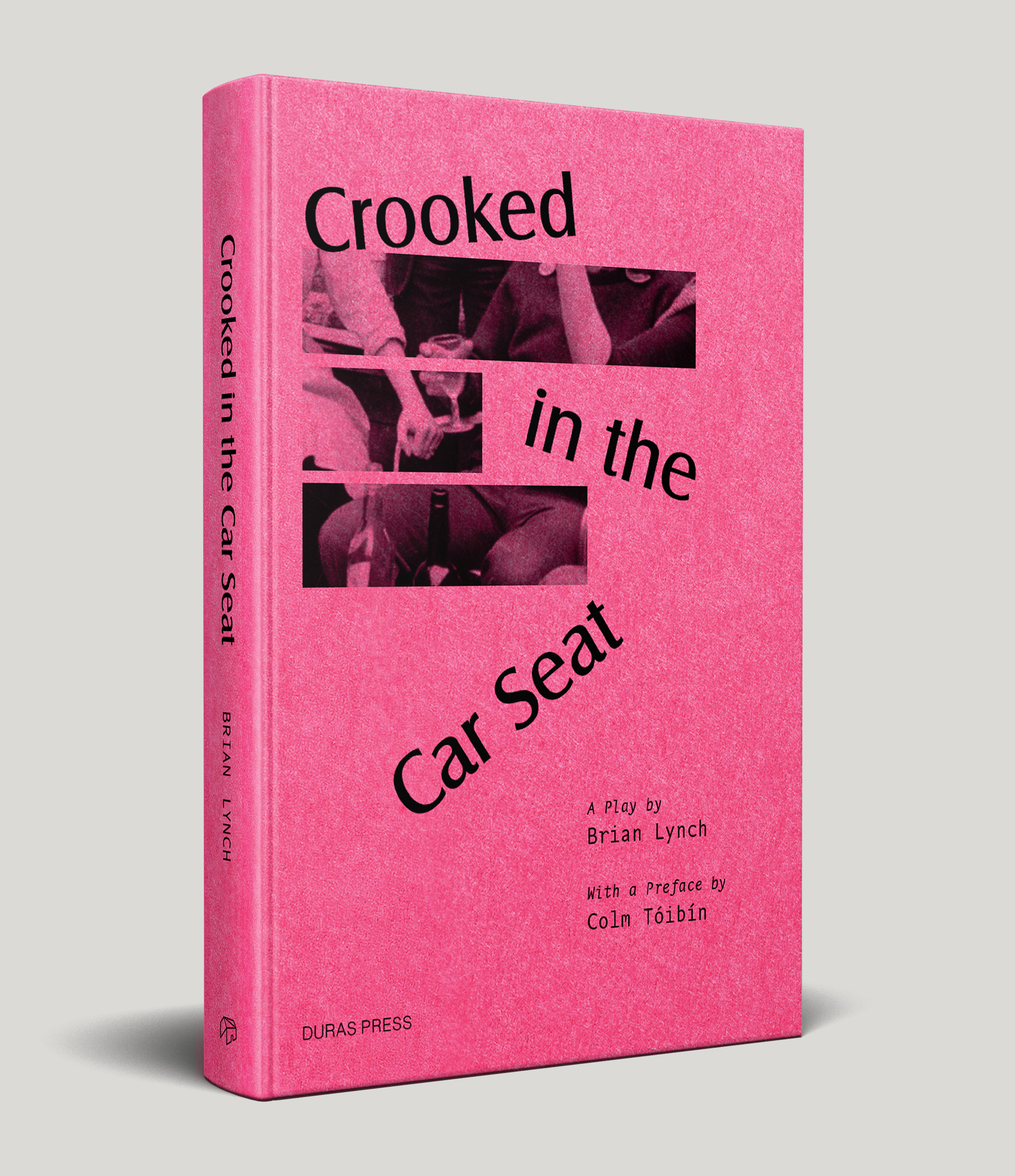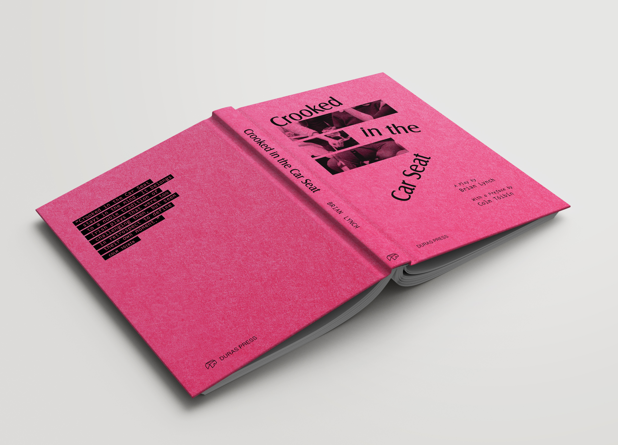 A limited edition hardback for the 2023 publication of Crooked in the Car Seat, a playscript that was written and staged in 1970s Ireland. The book was published by Duras Press and contains an introduction by the playwright Brian Lynch and a preface by the author Colm Tóibín. The cover was printed in single colour on Colourplan Hot Pink.