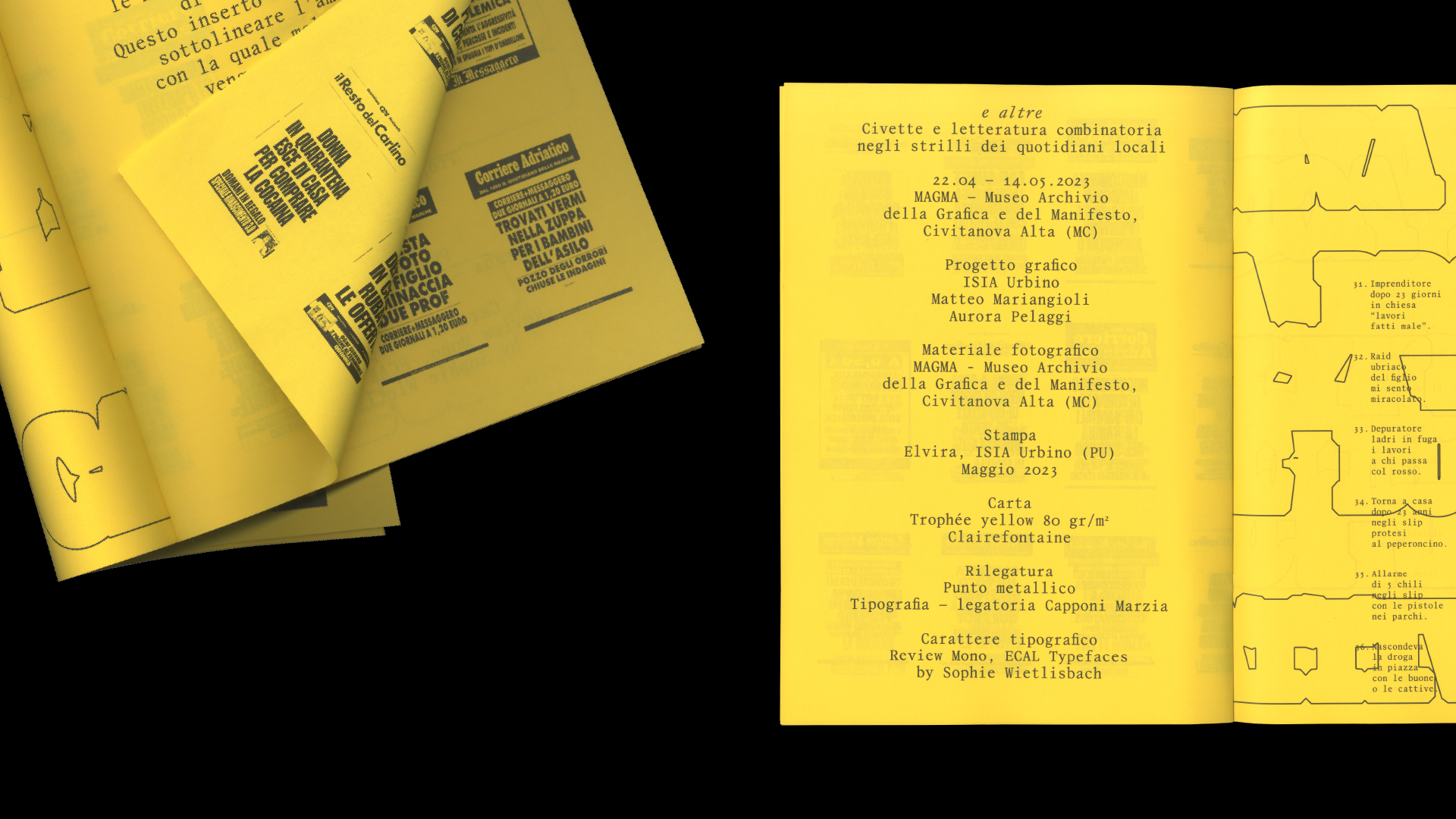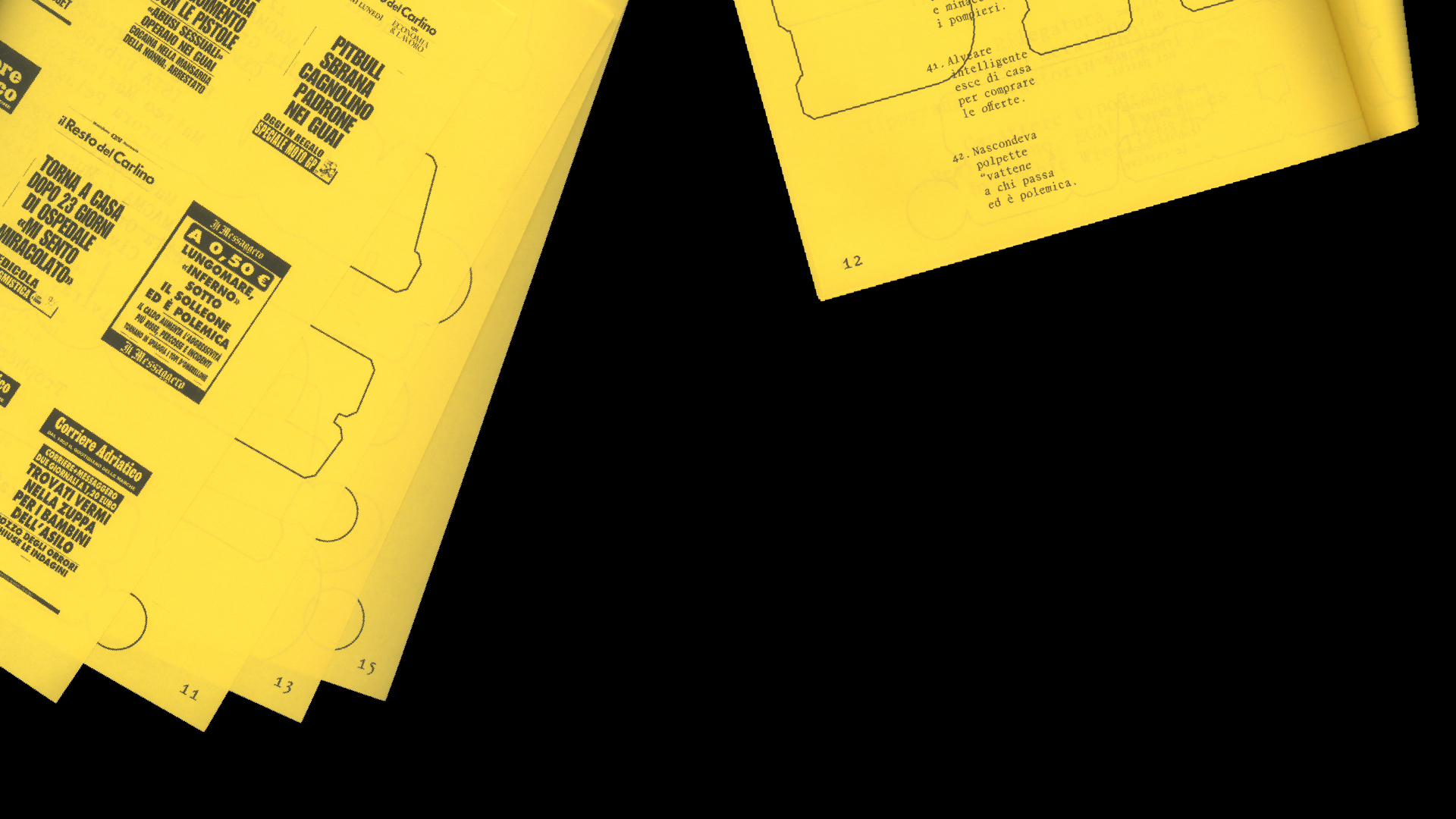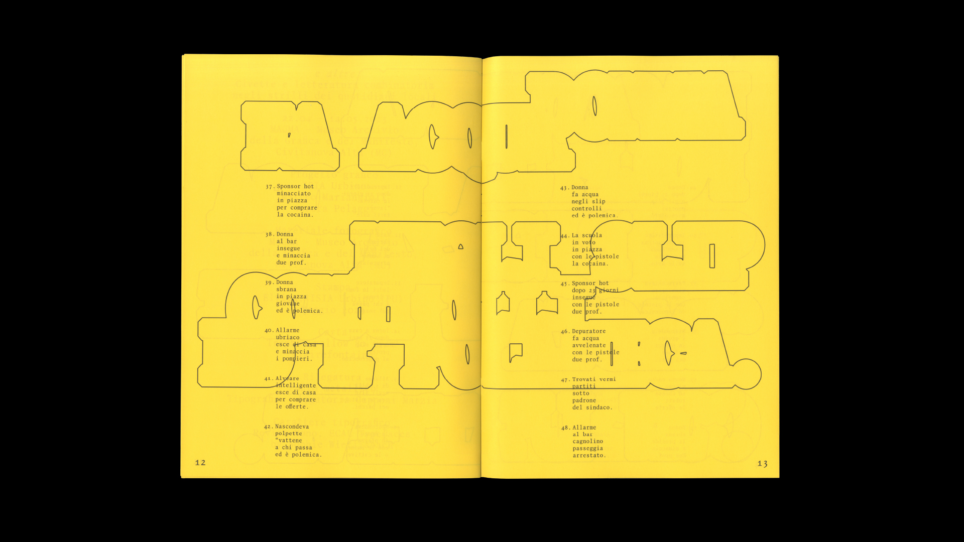 An object as well known as it is discussed, but perhaps not over-analyzed, “la civetta”, the sheet containing the headlines of the most important articles in a newspaper and displayed outside newsstands, becomes the protagonist of the volume, losing its function as a mere attraction and becoming the central element from which the tools are drawn to articulate a discourse entirely constructed from its textual components.