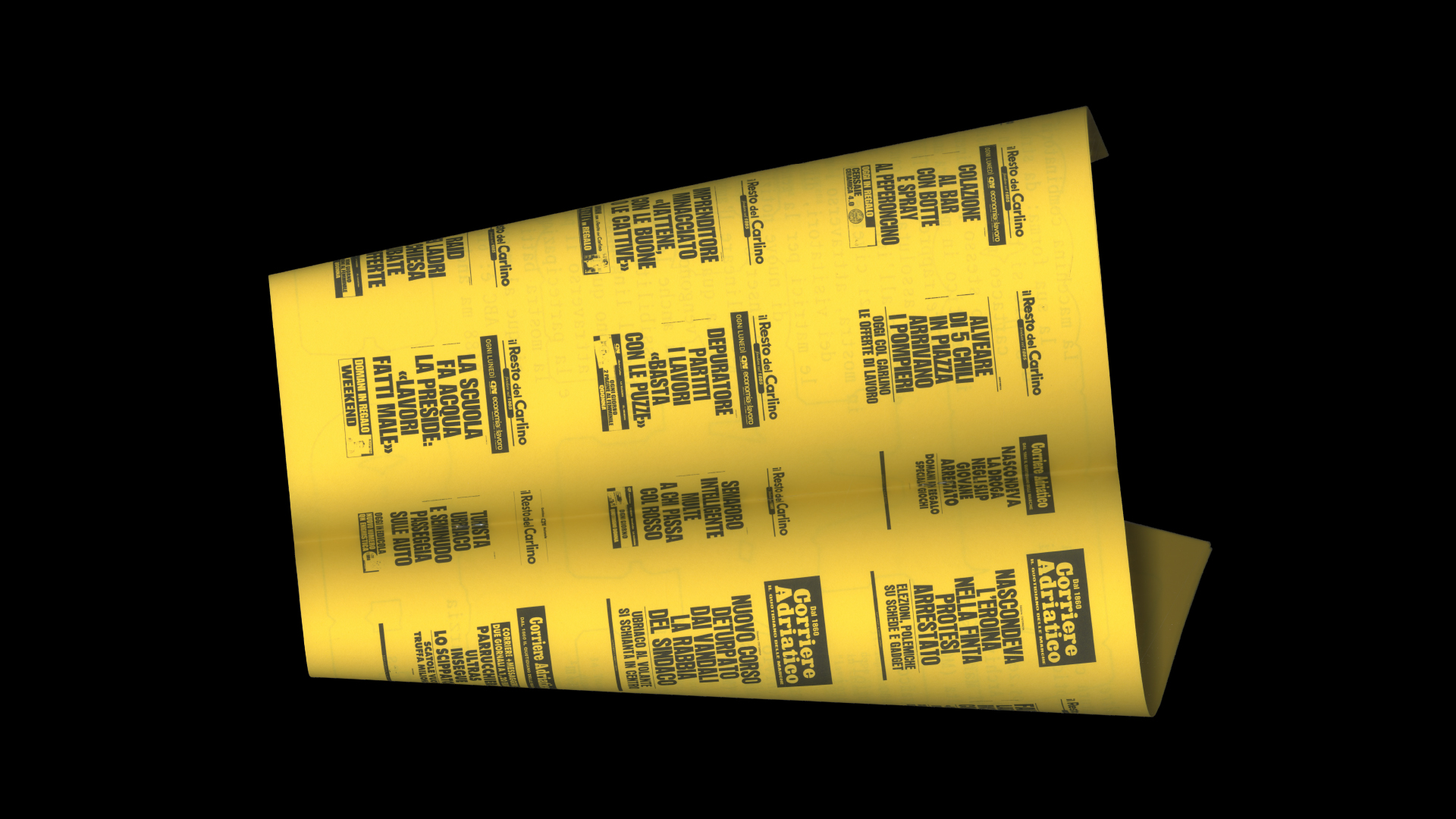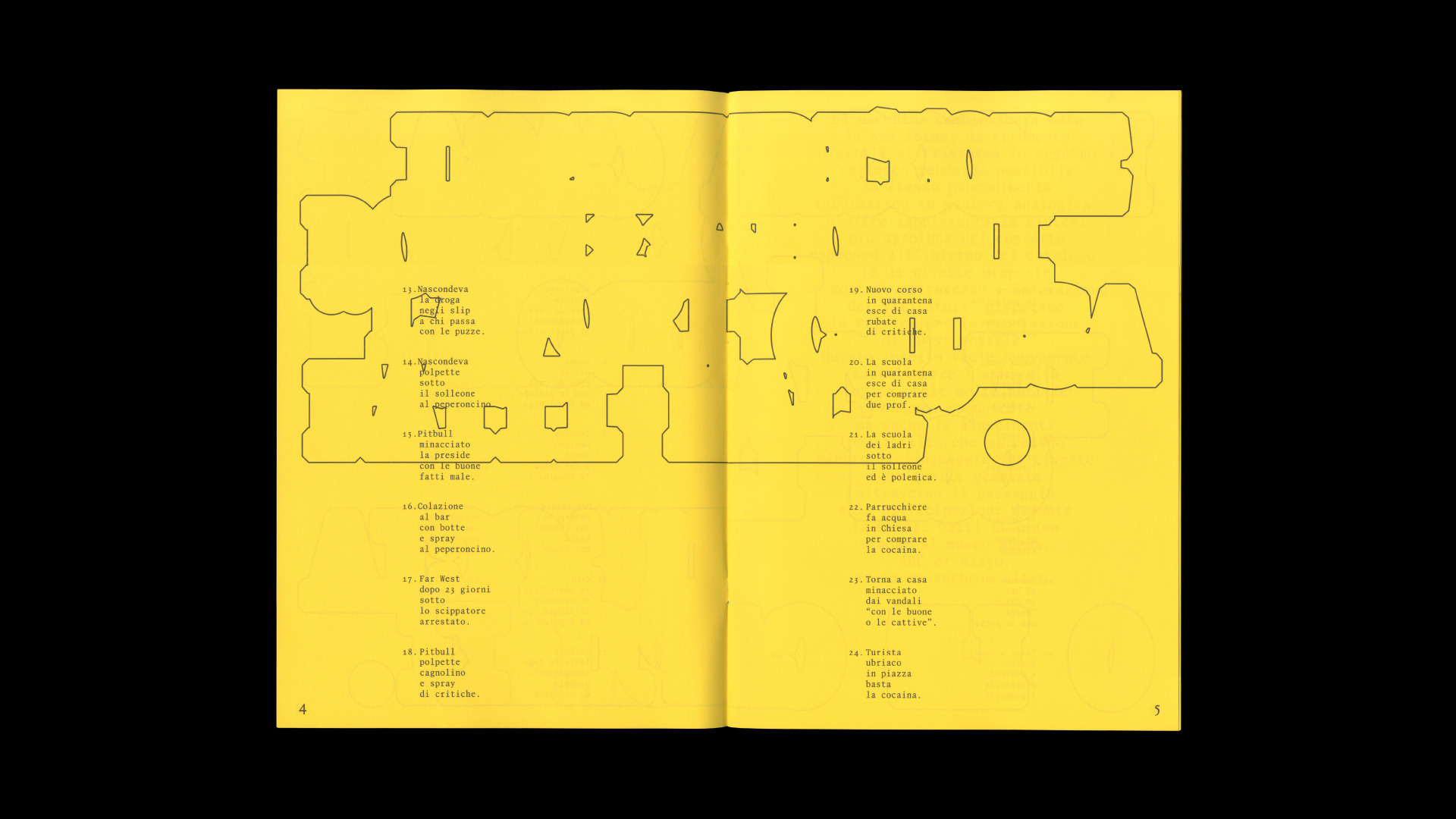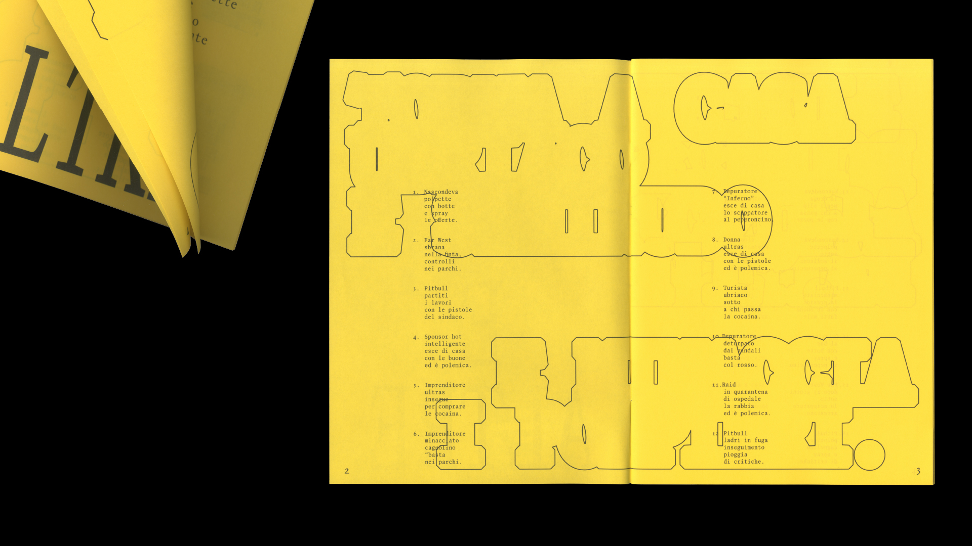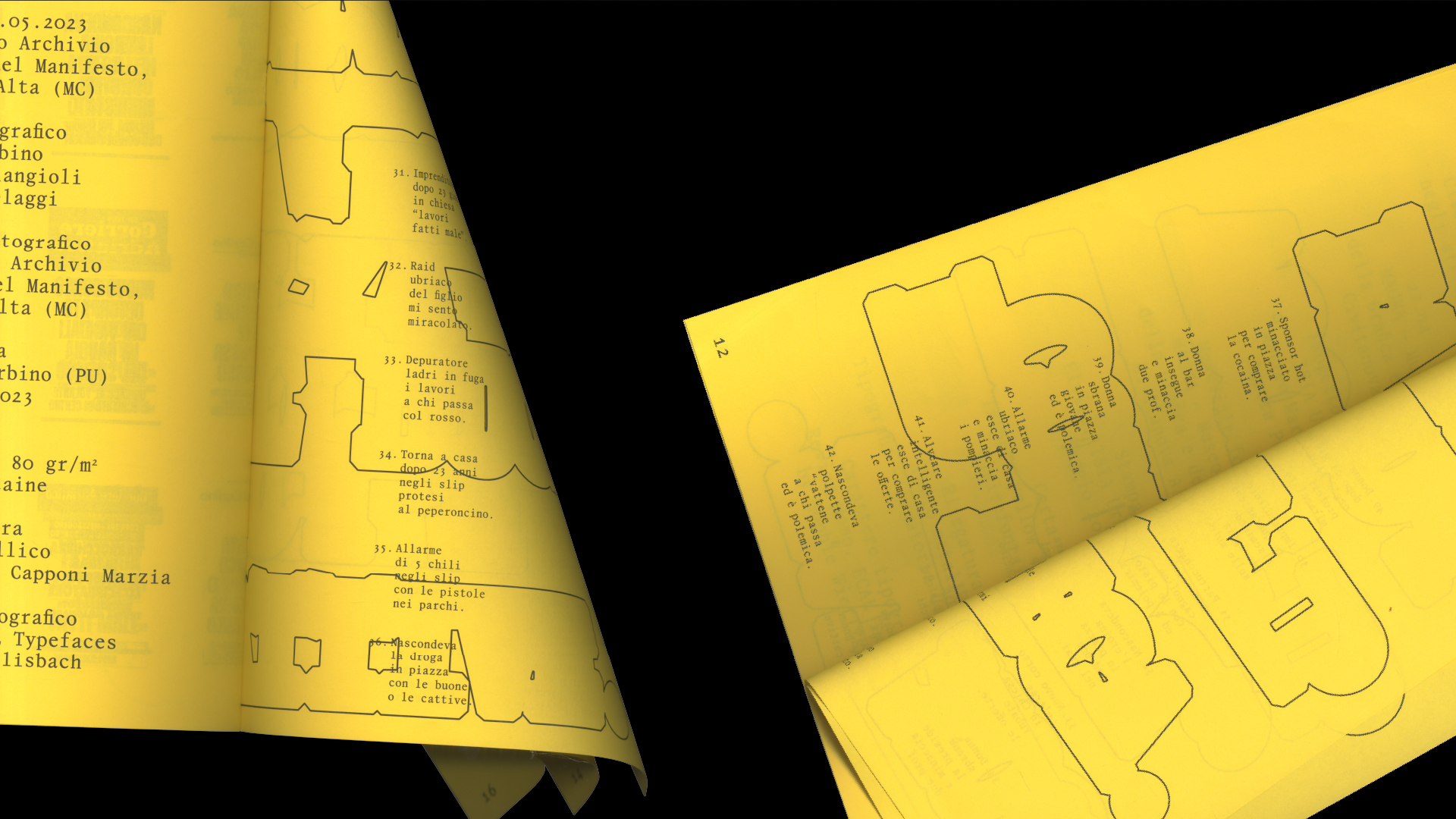 An object as well known as it is discussed, but perhaps not over-analyzed, “la civetta”, the sheet containing the headlines of the most important articles in a newspaper and displayed outside newsstands, becomes the protagonist of the volume, losing its function as a mere attraction and becoming the central element from which the tools are drawn to articulate a discourse entirely constructed from its textual components.