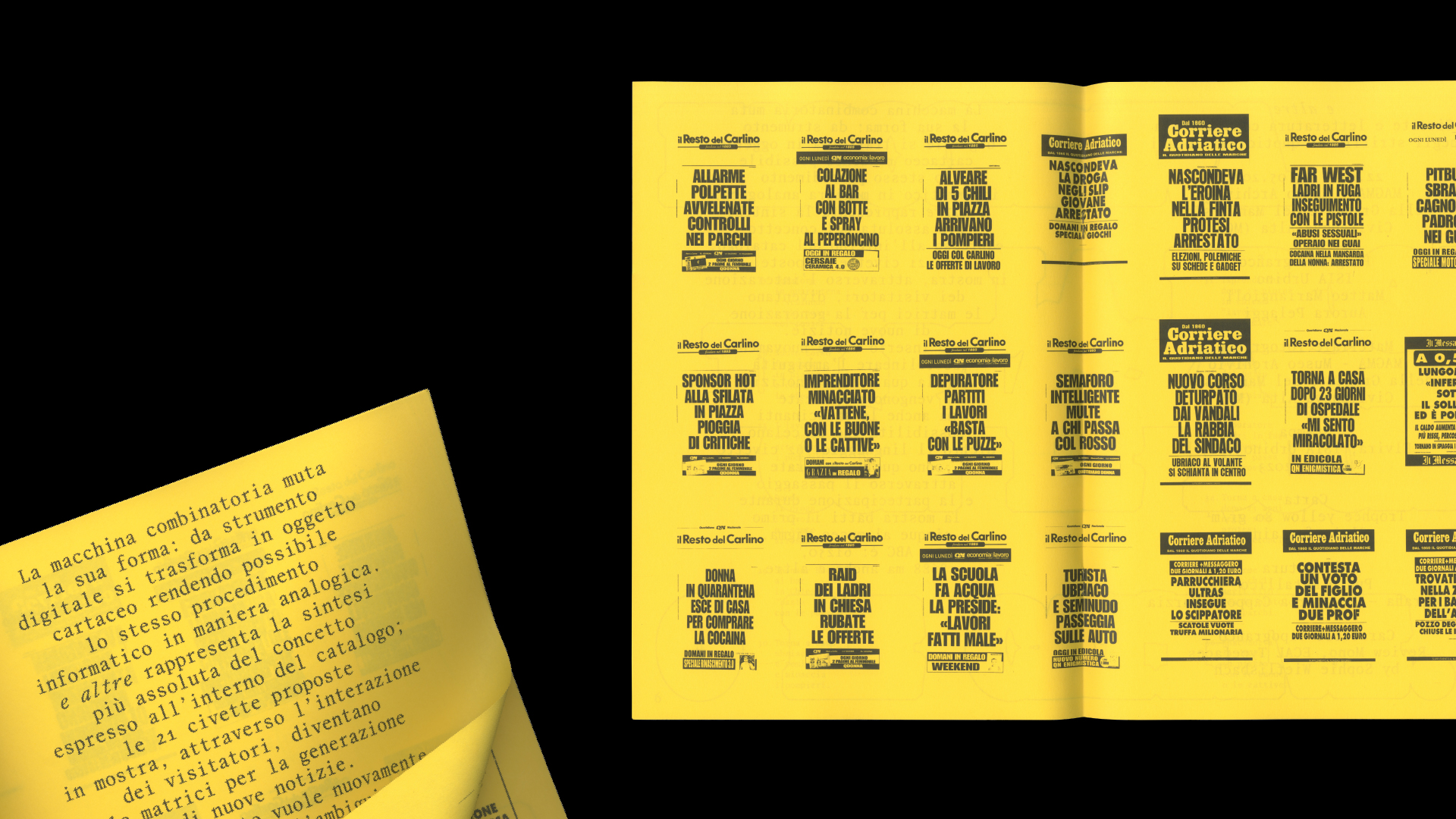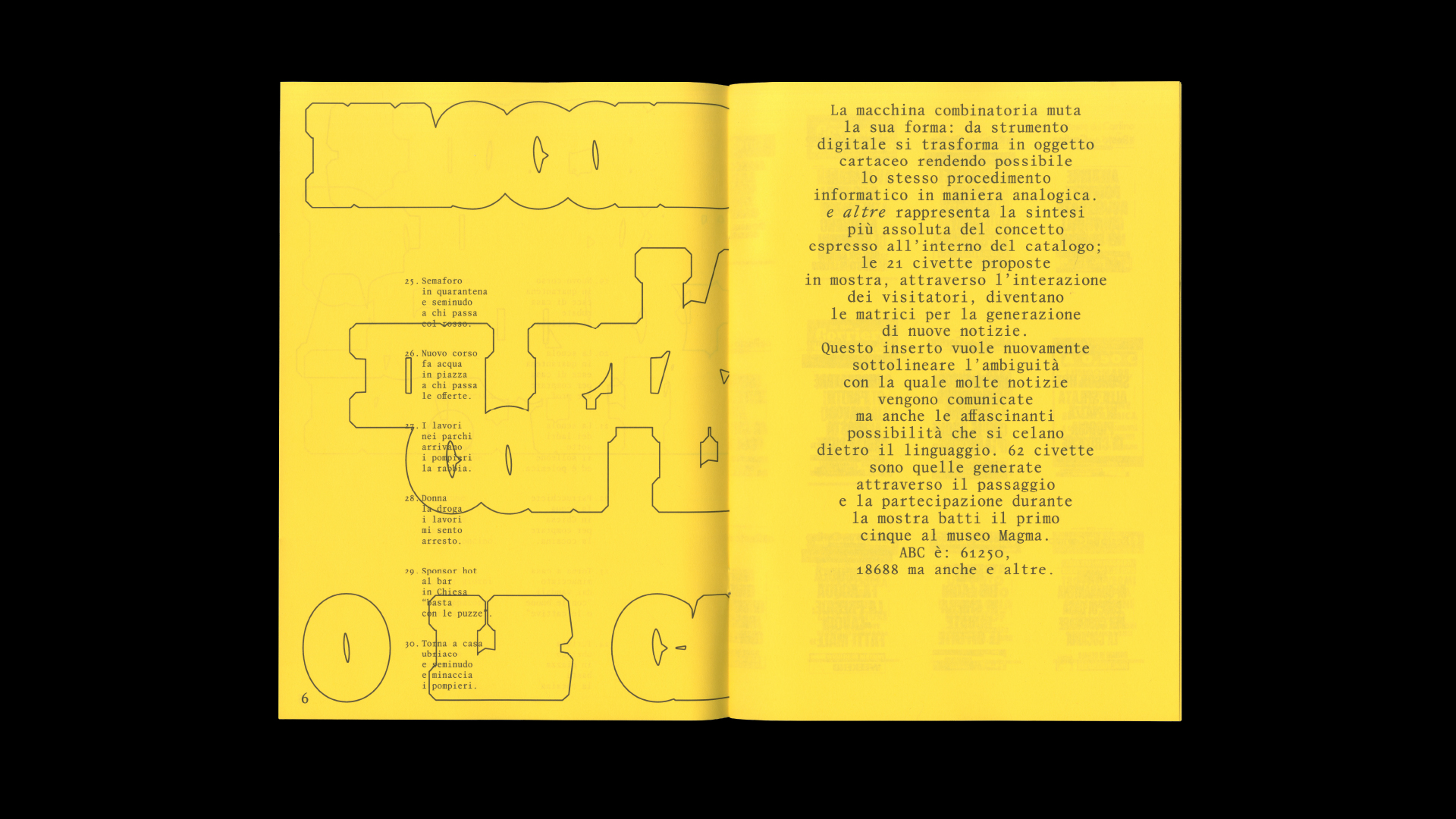 The combinatorial machine changes its form: from a digital tool it is transformed into a paper object, making the same computer process possible in an analog way. E Altre (“And others”) represents the most absolute synthesis of the concept expressed within the catalog; the 21 civette offered in the exhibition, through the interaction of visitors, become the matrices for the generation of new news. This insert again seeks to emphasize the ambiguity with which much news is communicated but also the fascinating possibilities behind the language. 62 civette are those generated through passage and participation during the Batti il primo cinque exhibition at the Magma Museum. ABC is: 61250, 18688 but also and others.