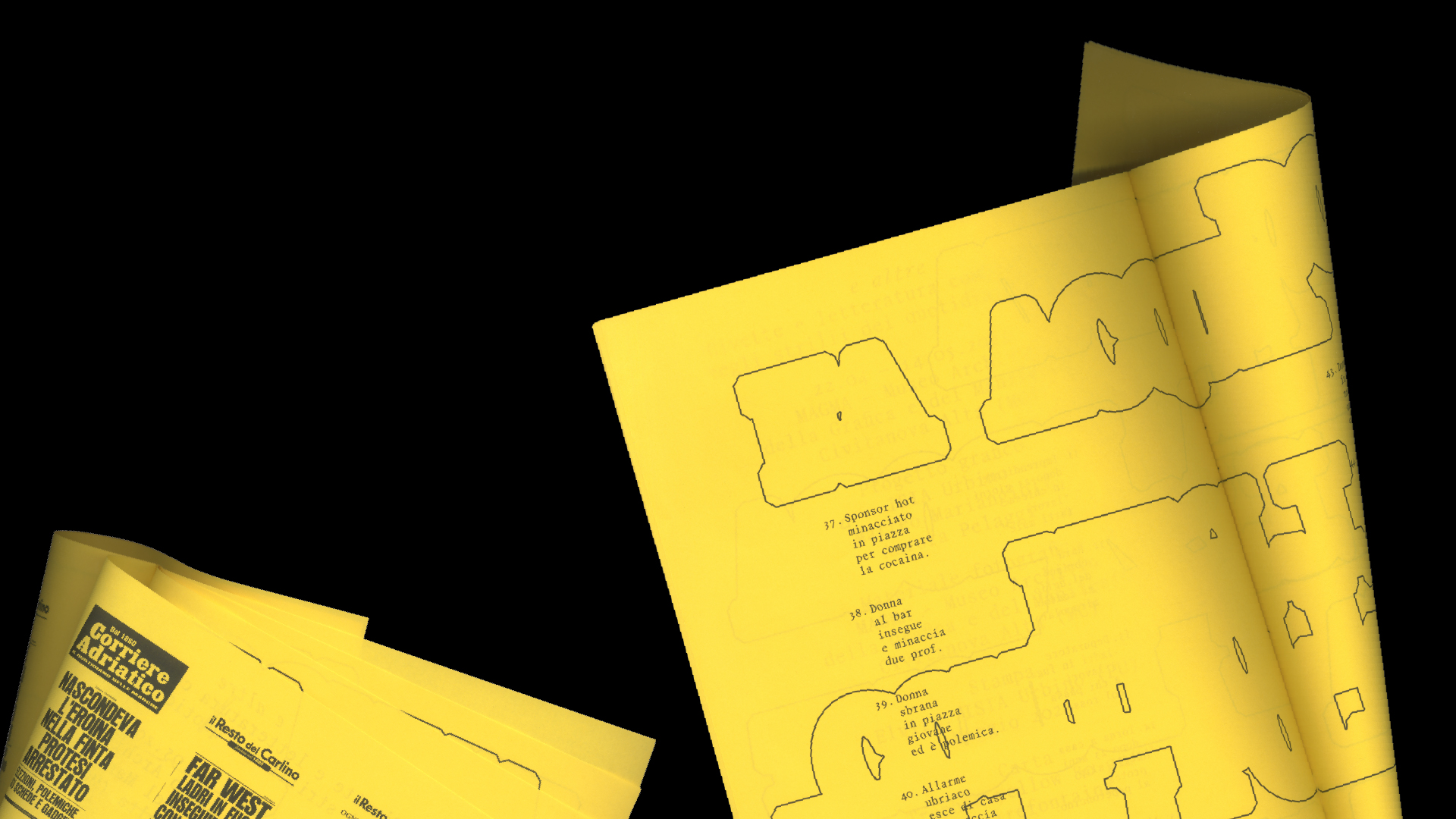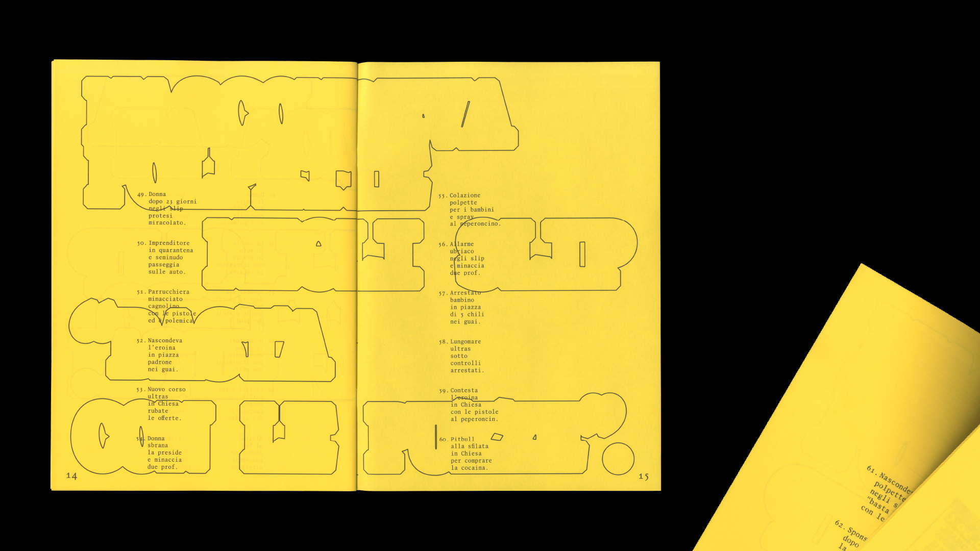 5 words, 5 news items associated with the respective term for each letter of the alphabet generated the 61250 “civette” that are the result of the computer code that exponentially increased the starting archive making these news items hypothetically all true, or almost all true. 61250 is thus the result of a starting selection that made the physical form of this object possible so that this volume, though not as its main intent, can be read.
