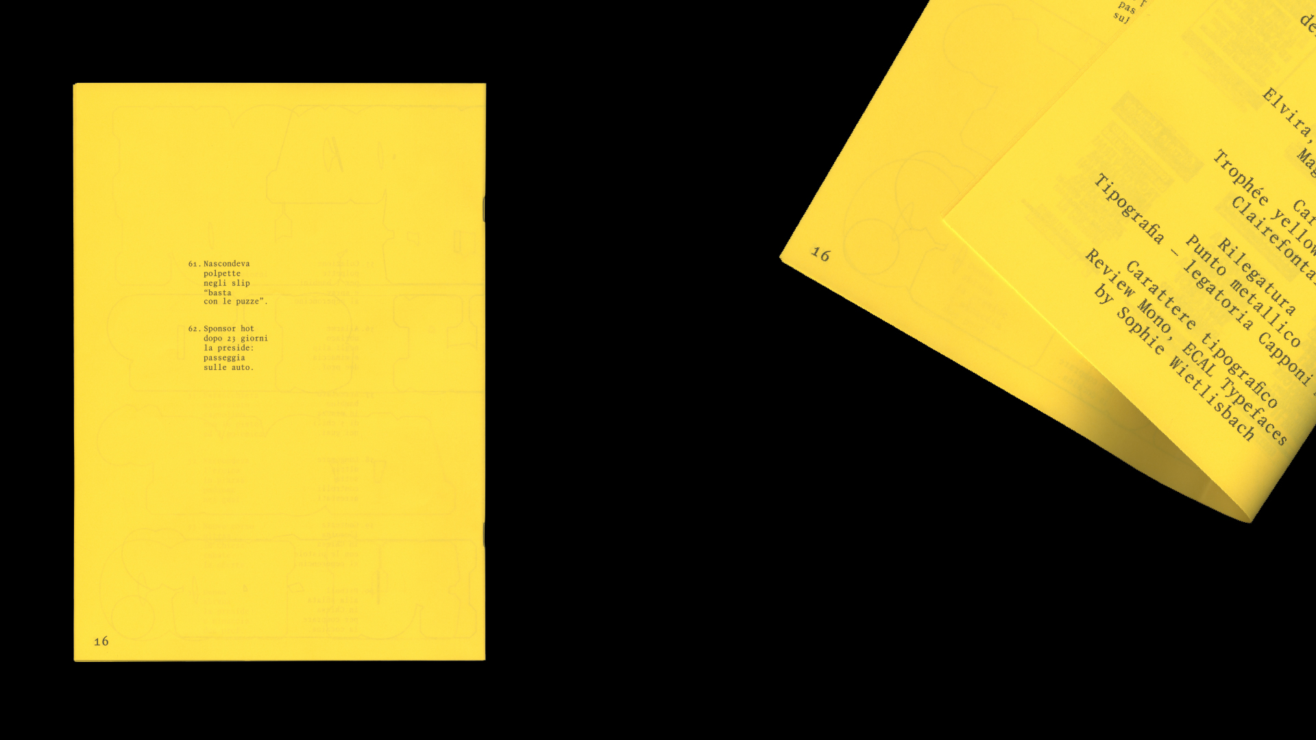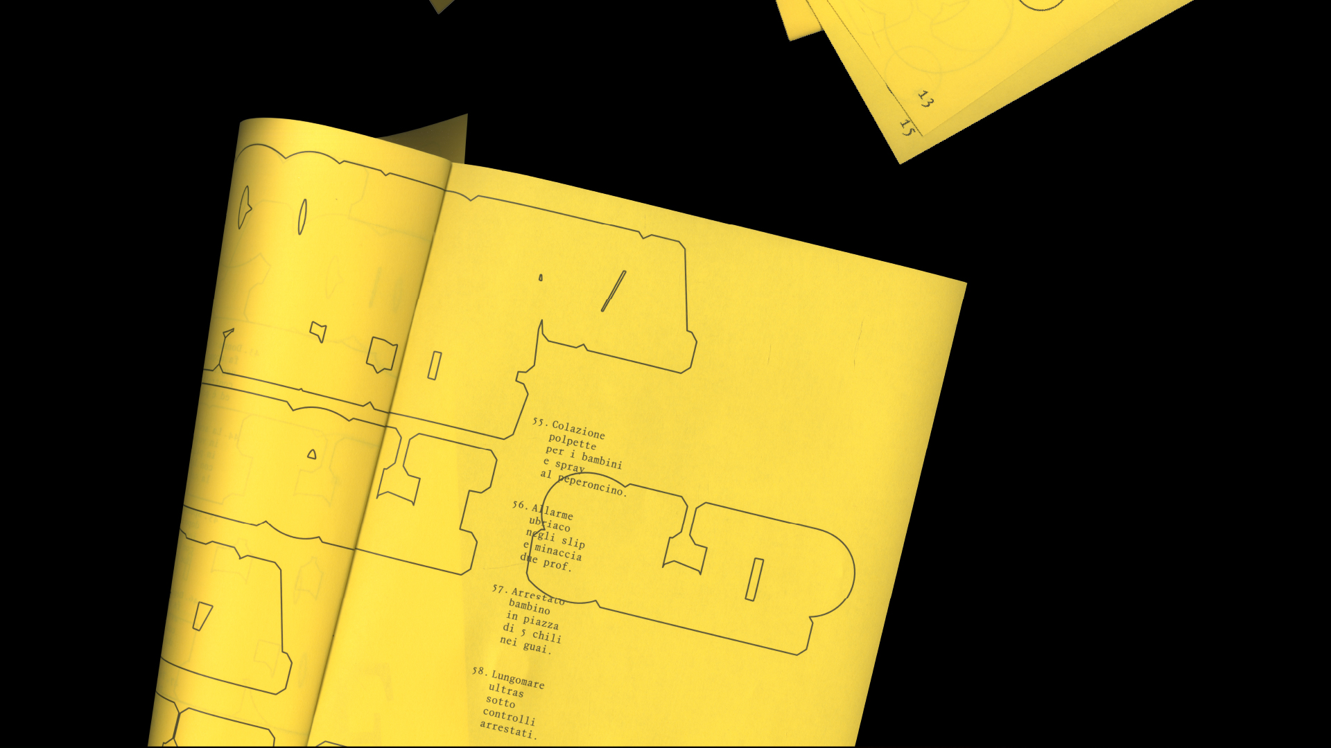 ABC 61250 e altre is the title of a project made by Aurora Pelaggi and Matteo Mariangioli, students of the MA in Communication and Design for Publishing at ISIA Urbino, during the course Graphic Image Design taught by Mauro Bubbico. It was included in Batti il primo cinque, a series of five exhibitions shown at the Magma Museum.