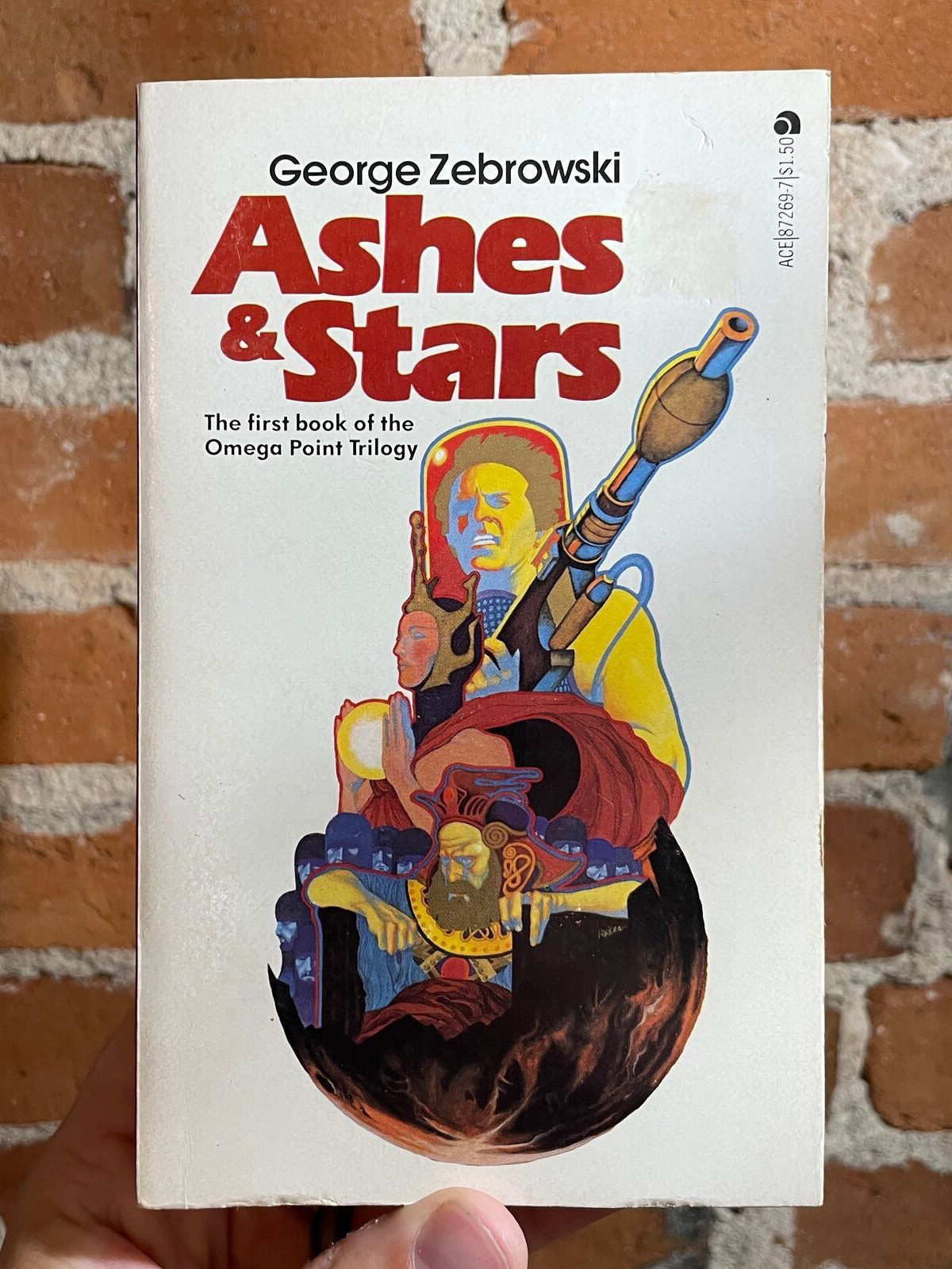 First edition of the first book in the Omega Point trilogy by George Zebrowski (b. 1945), published in 1977 as a prequel to The Omega Point (1972). The cover art for Ashes & Stars is by Bob Pepper.