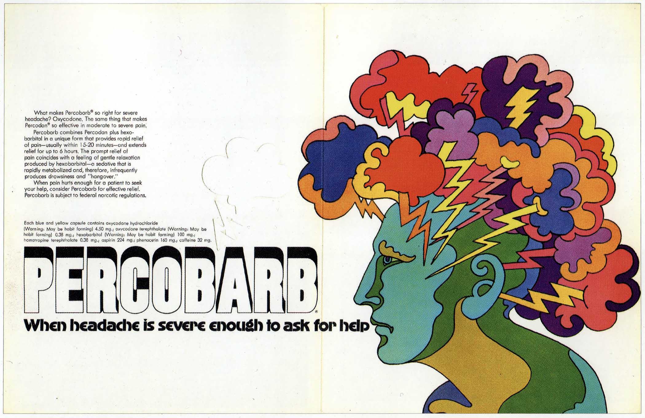 A 1969 double-page ad designed by Milton Glaser for Percobarb, Endo Pharmaceuticals’ brand name for oxycodone, an opioid used medically for treatment of moderate to severe pain.