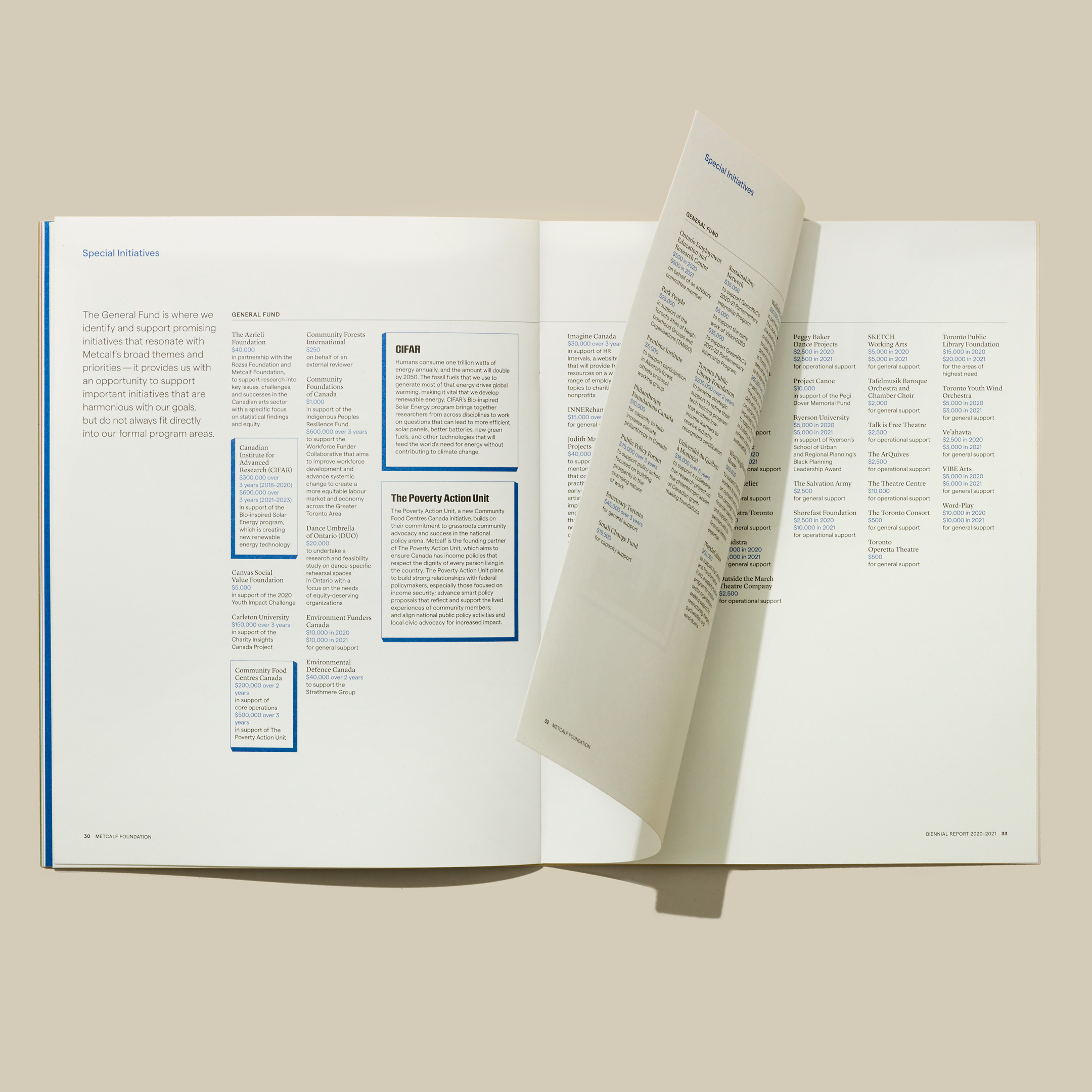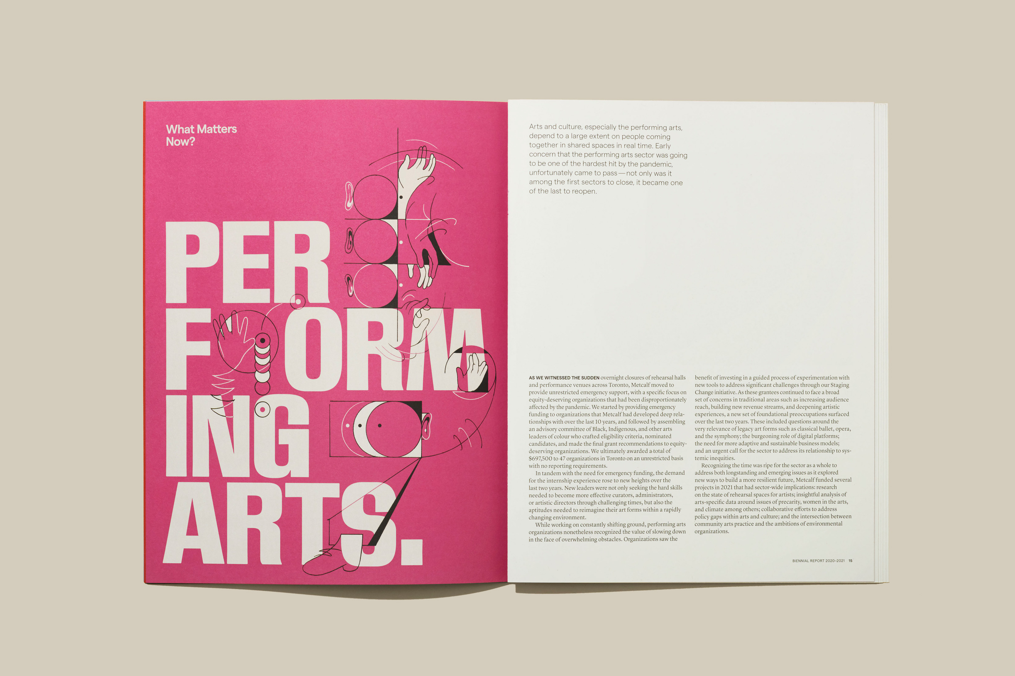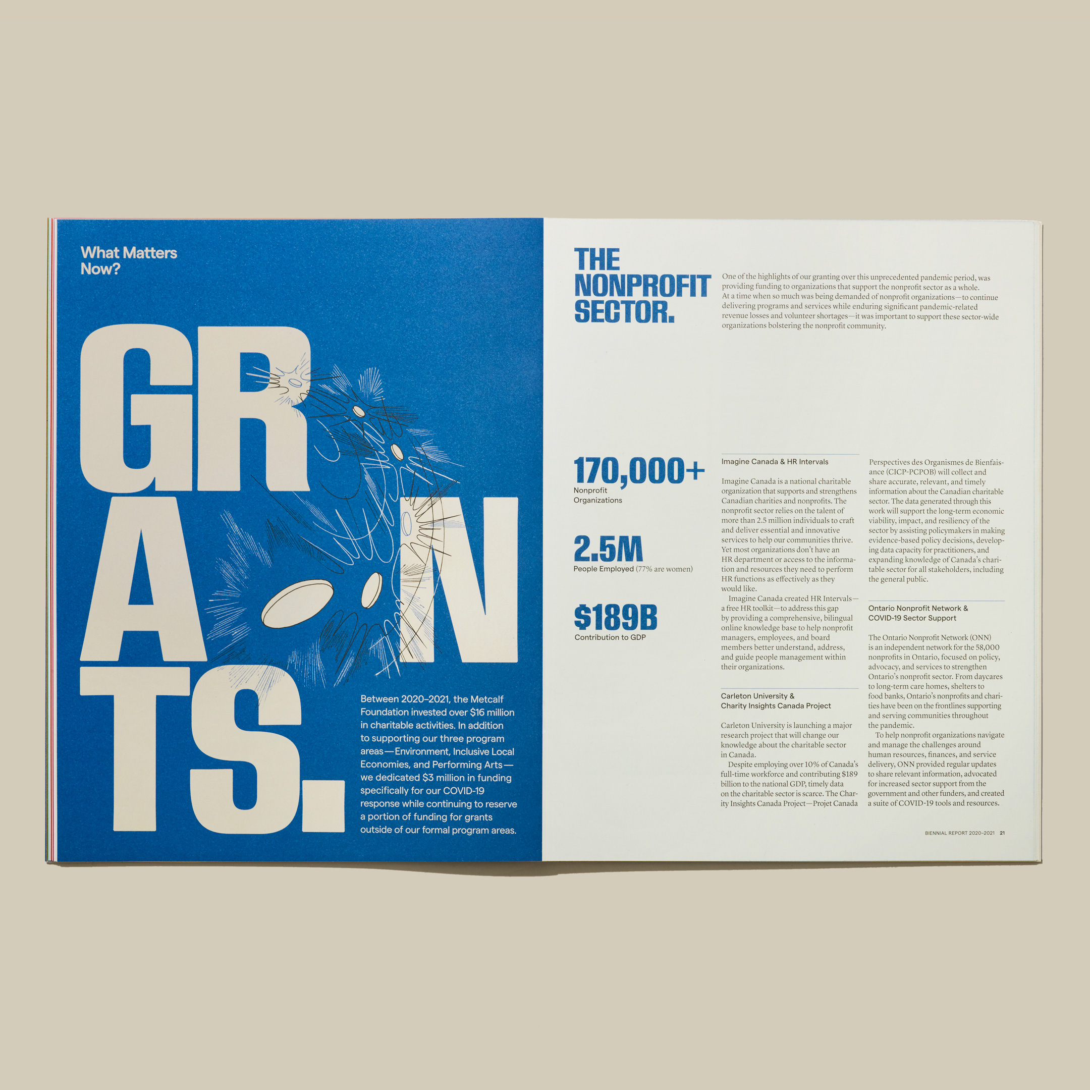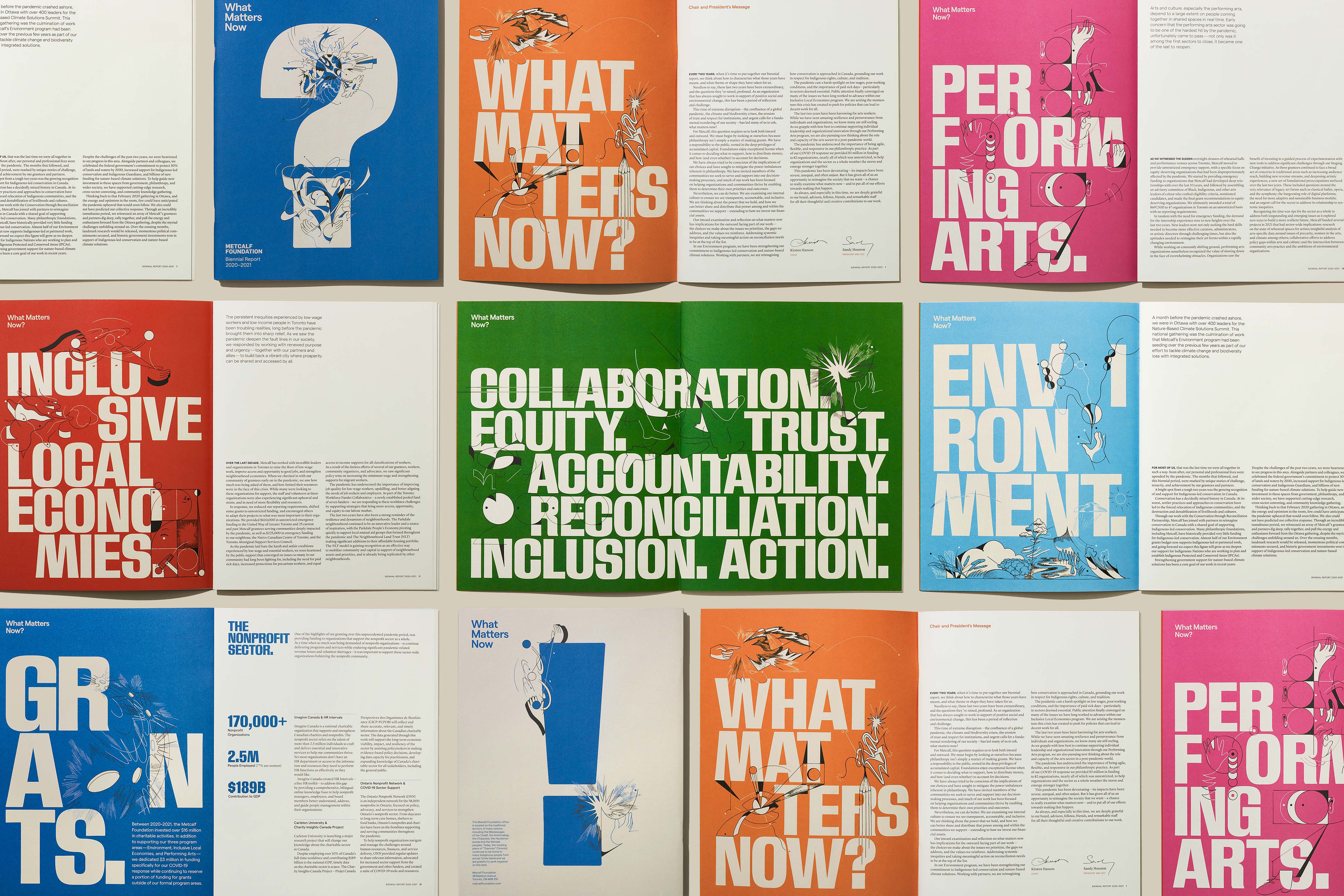 The Metcalf Foundation is highly respected for its philanthropy and support for research to inform public policy. Its latest biennial report published in 2022 addresses “What Matters Now” in the aftermath of the global pandemic. The designers collaborated closely with artist Dalbert B. Vilarino to intimately integrate their striking illustrations with their design’s bold typography and colours to amplify the urgency of Metcalf’s work over the past two challenging years. The theme is presented initially on the front cover as a question but is transformed into an emphatic statement on the back to leave readers with a message of hope and empowerment.