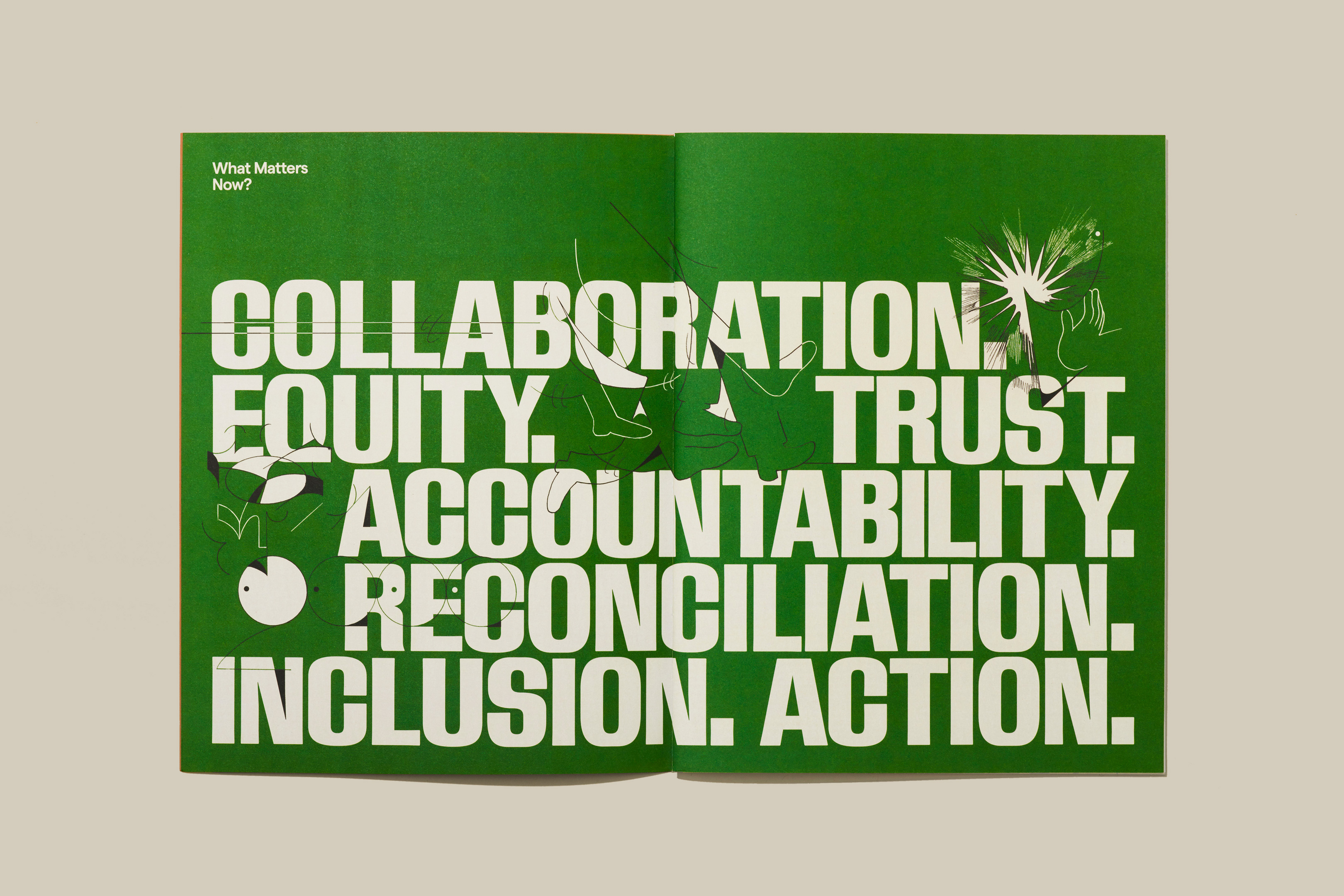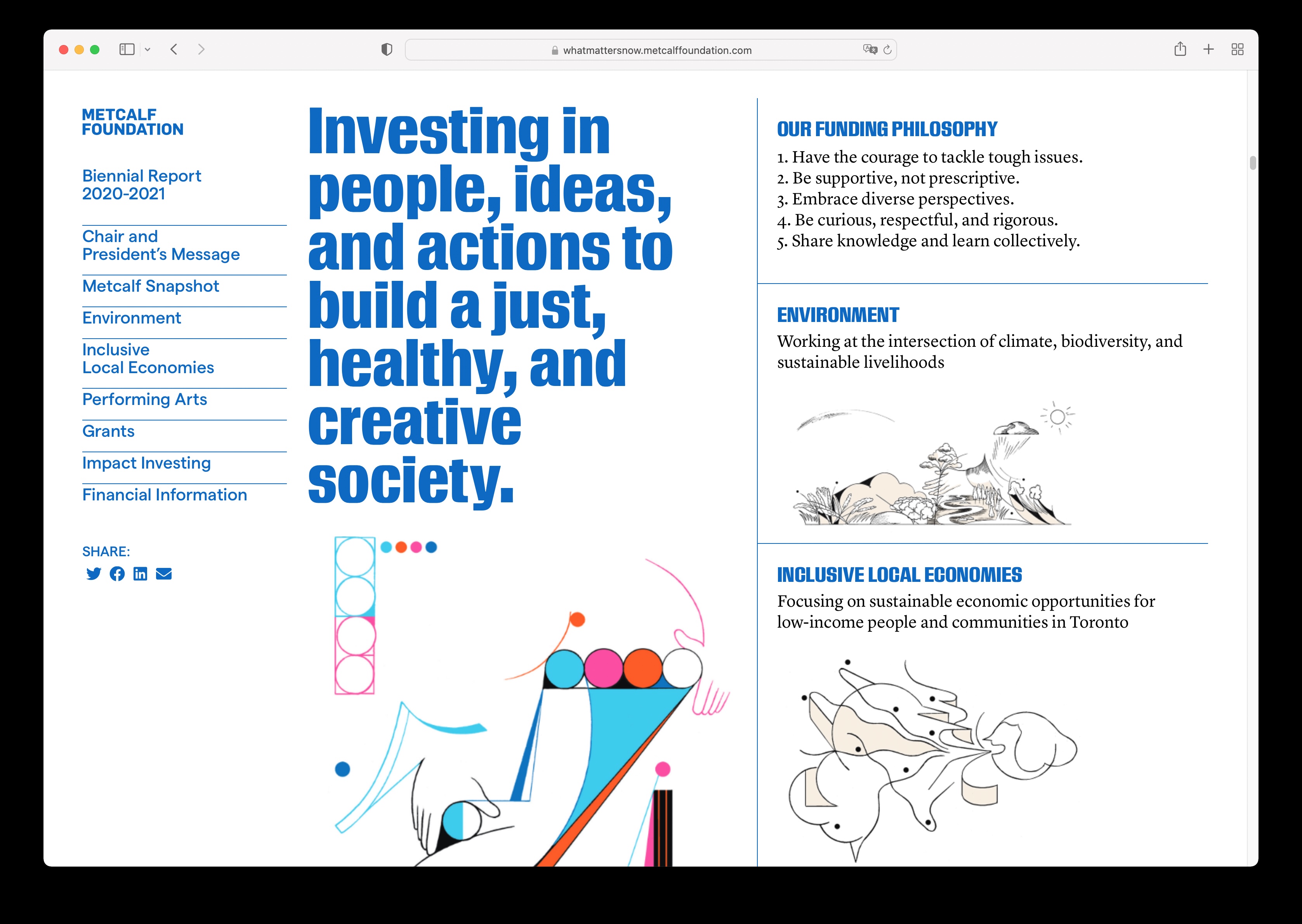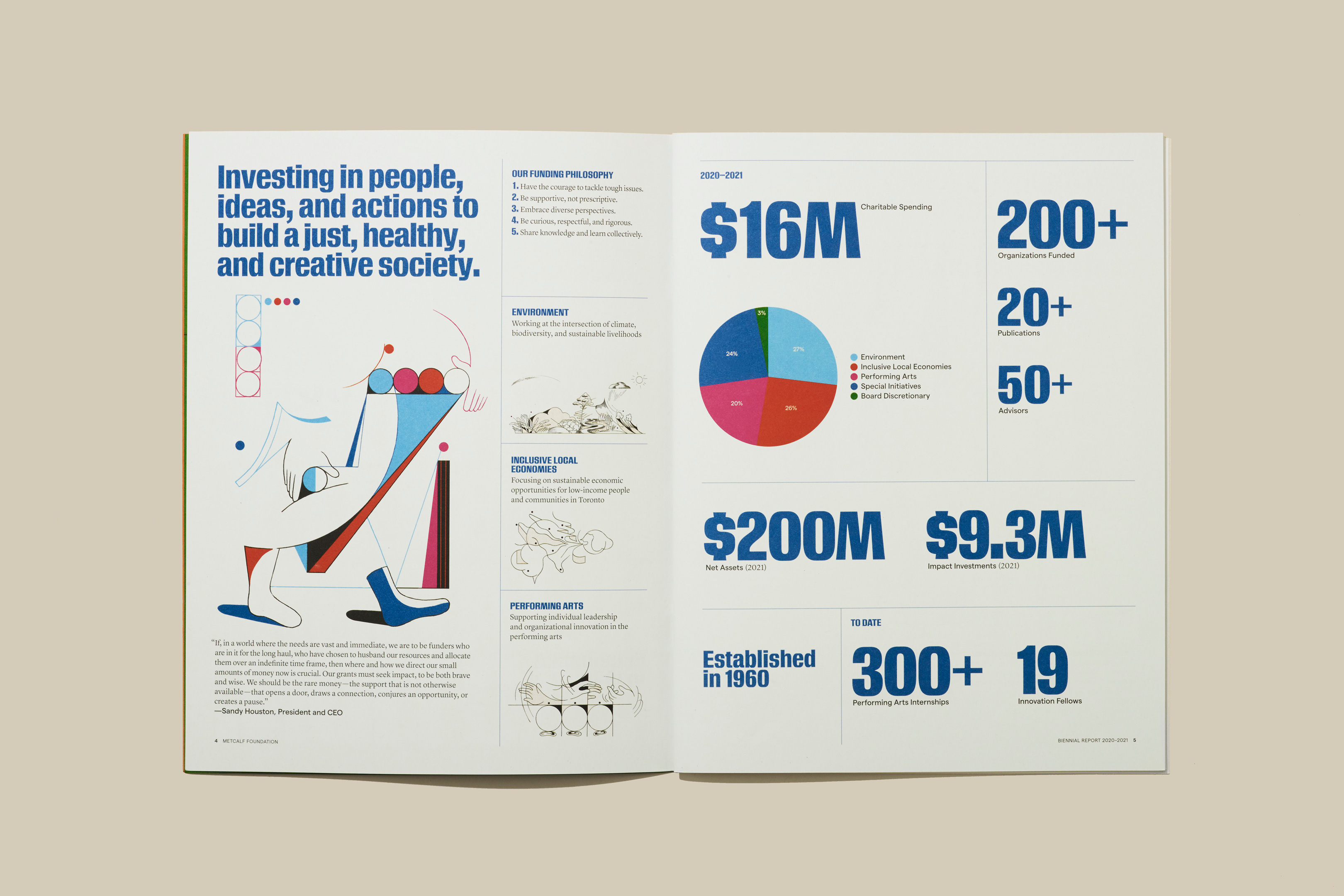 The Metcalf Foundation is highly respected for its philanthropy and support for research to inform public policy. Its latest biennial report published in 2022 addresses “What Matters Now” in the aftermath of the global pandemic. The designers collaborated closely with artist Dalbert B. Vilarino to intimately integrate their striking illustrations with their design’s bold typography and colours to amplify the urgency of Metcalf’s work over the past two challenging years. The theme is presented initially on the front cover as a question but is transformed into an emphatic statement on the back to leave readers with a message of hope and empowerment.