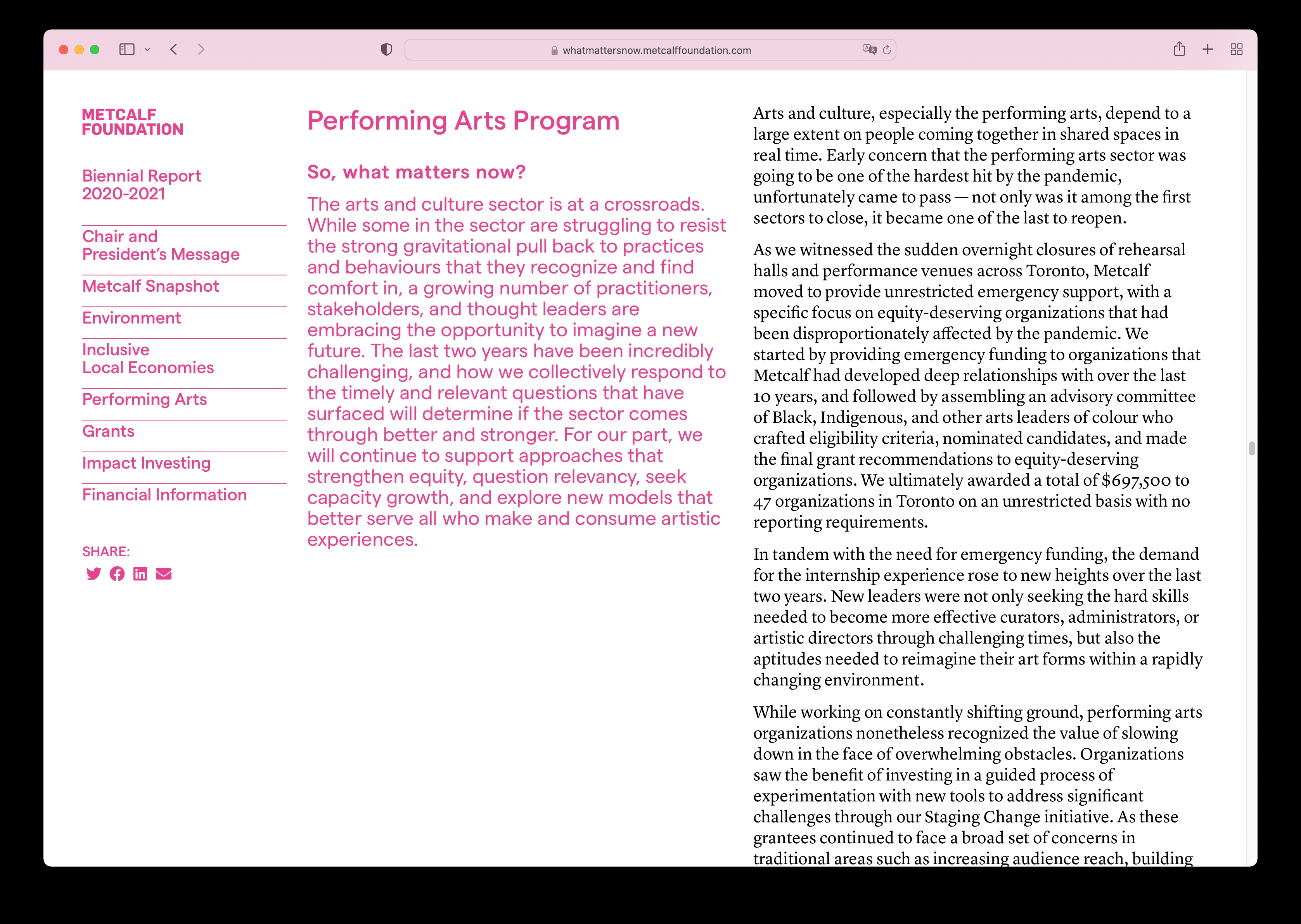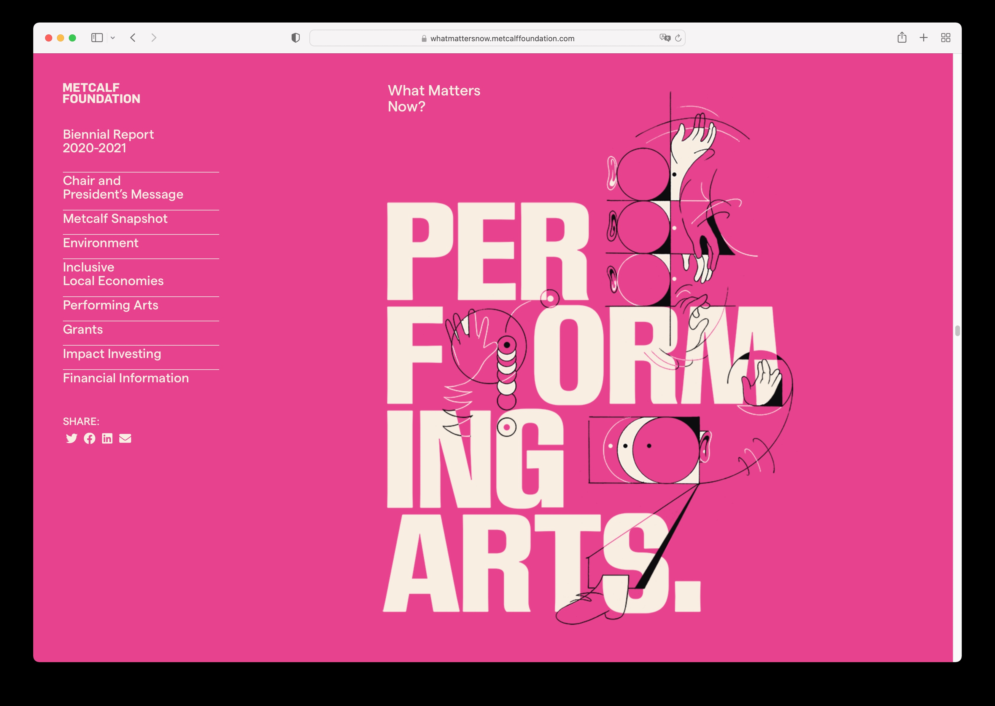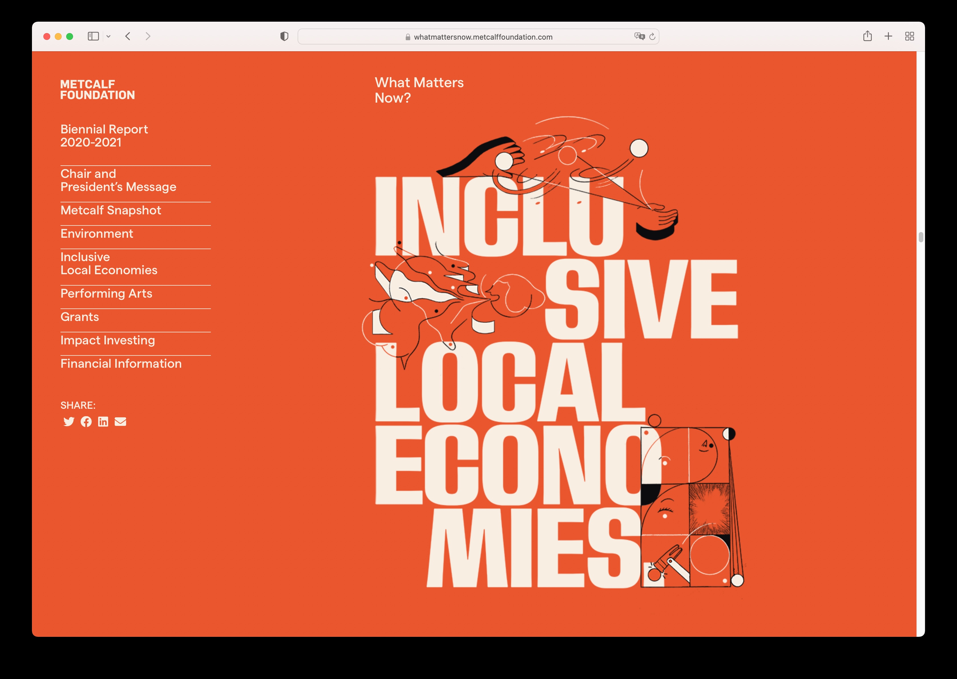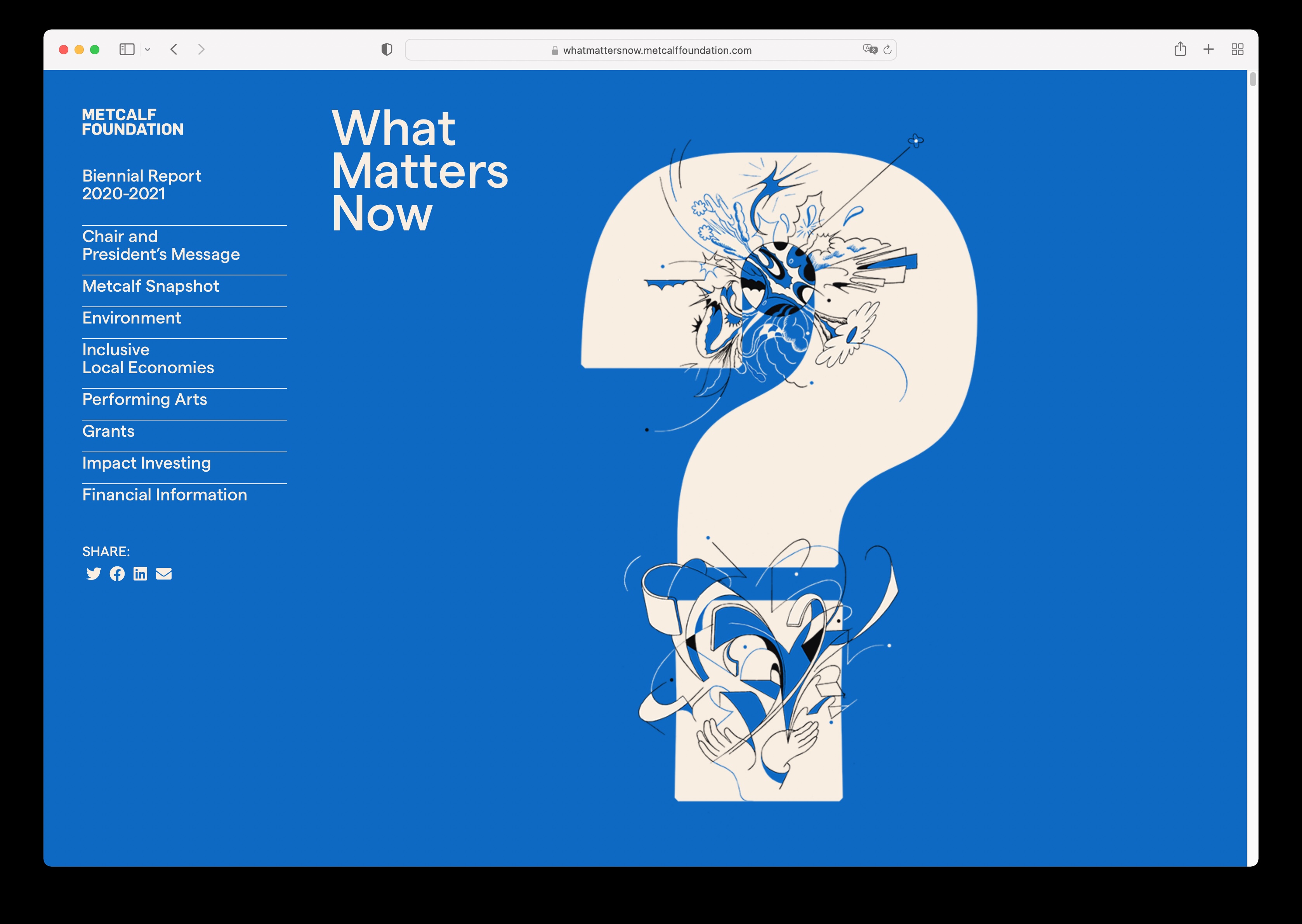 The Metcalf Foundation is highly respected for its philanthropy and support for research to inform public policy. Its latest biennial report published in 2022 addresses “What Matters Now” in the aftermath of the global pandemic. The designers collaborated closely with artist Dalbert B. Vilarino to intimately integrate their striking illustrations with their design’s bold typography and colours to amplify the urgency of Metcalf’s work over the past two challenging years. The theme is presented initially on the front cover as a question but is transformed into an emphatic statement on the back to leave readers with a message of hope and empowerment.