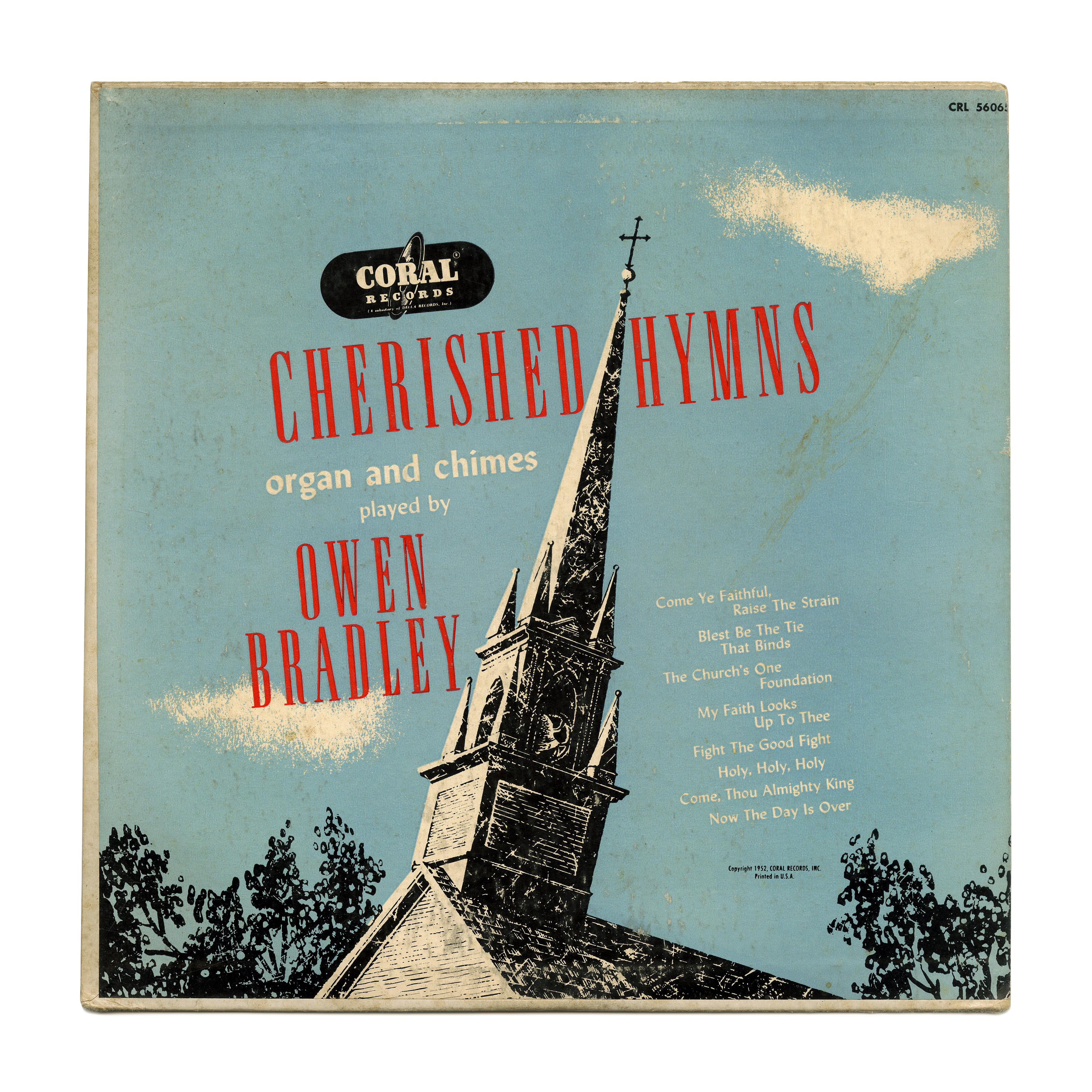 Two typefaces from the late 1930s, used together for an album of “cherished hymns” for organ and chimes, played by Owen Bradley (1915–1998) and released on Coral Records in 1952.
