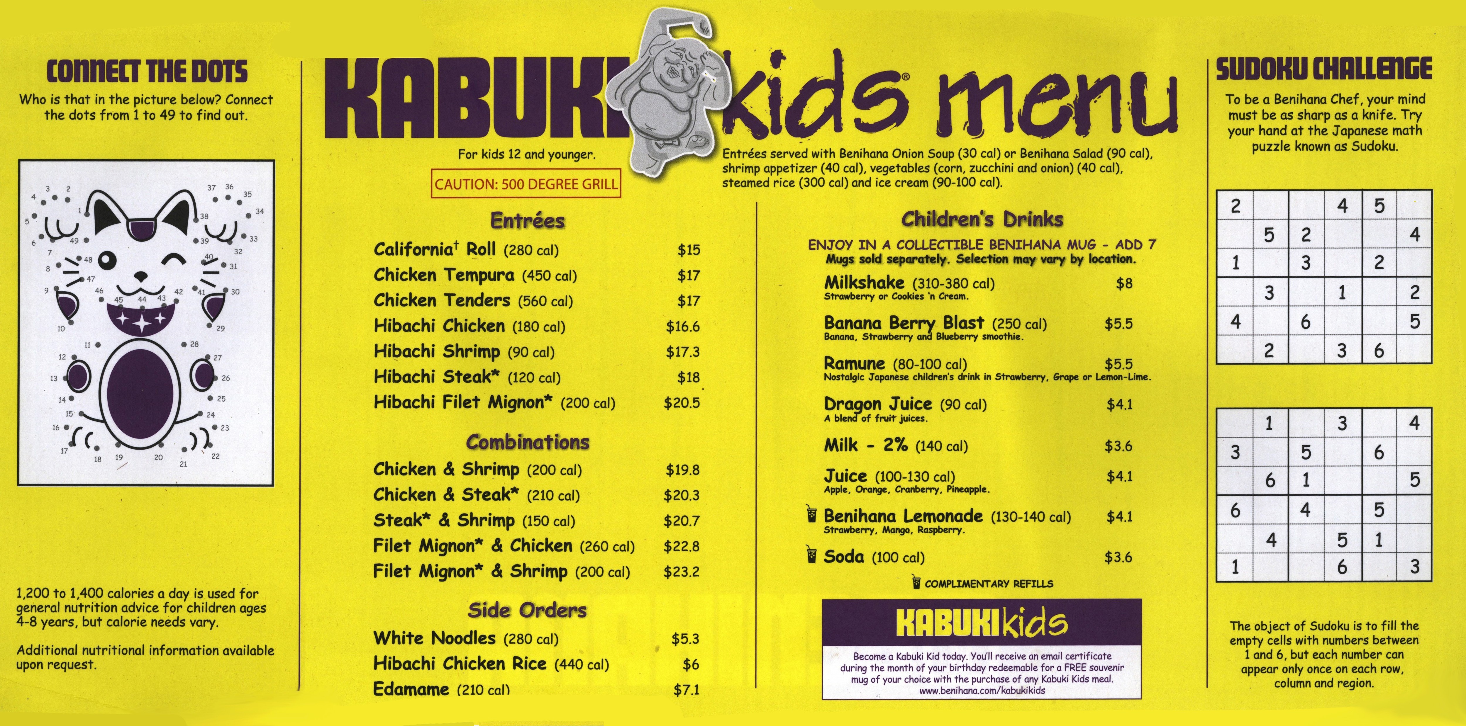 The current Kabuki Kids menu from Benihana, an American restaurant company that, according to Wikipedia, owns or franchises 116 Japanese-influenced restaurants around the world.