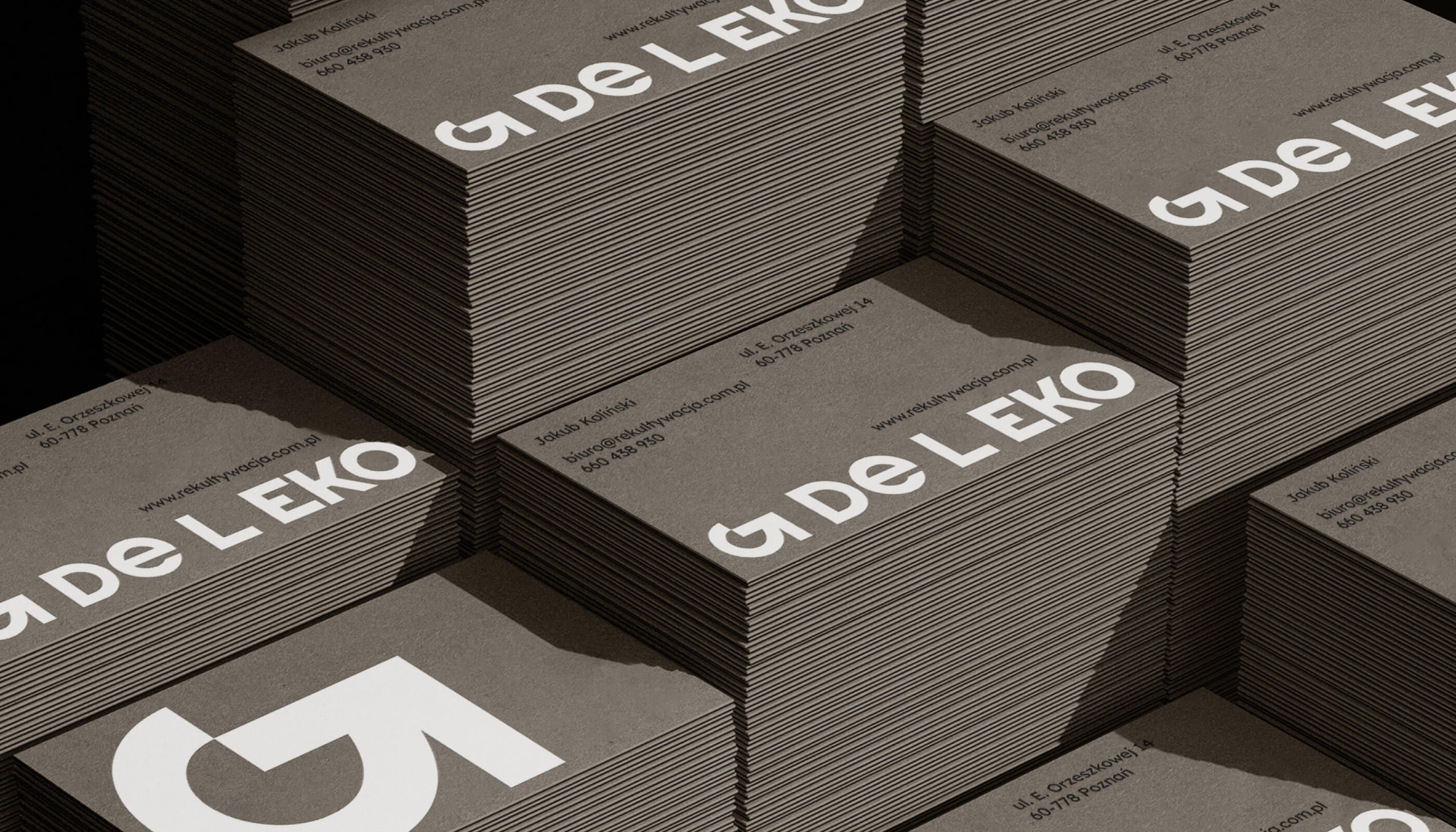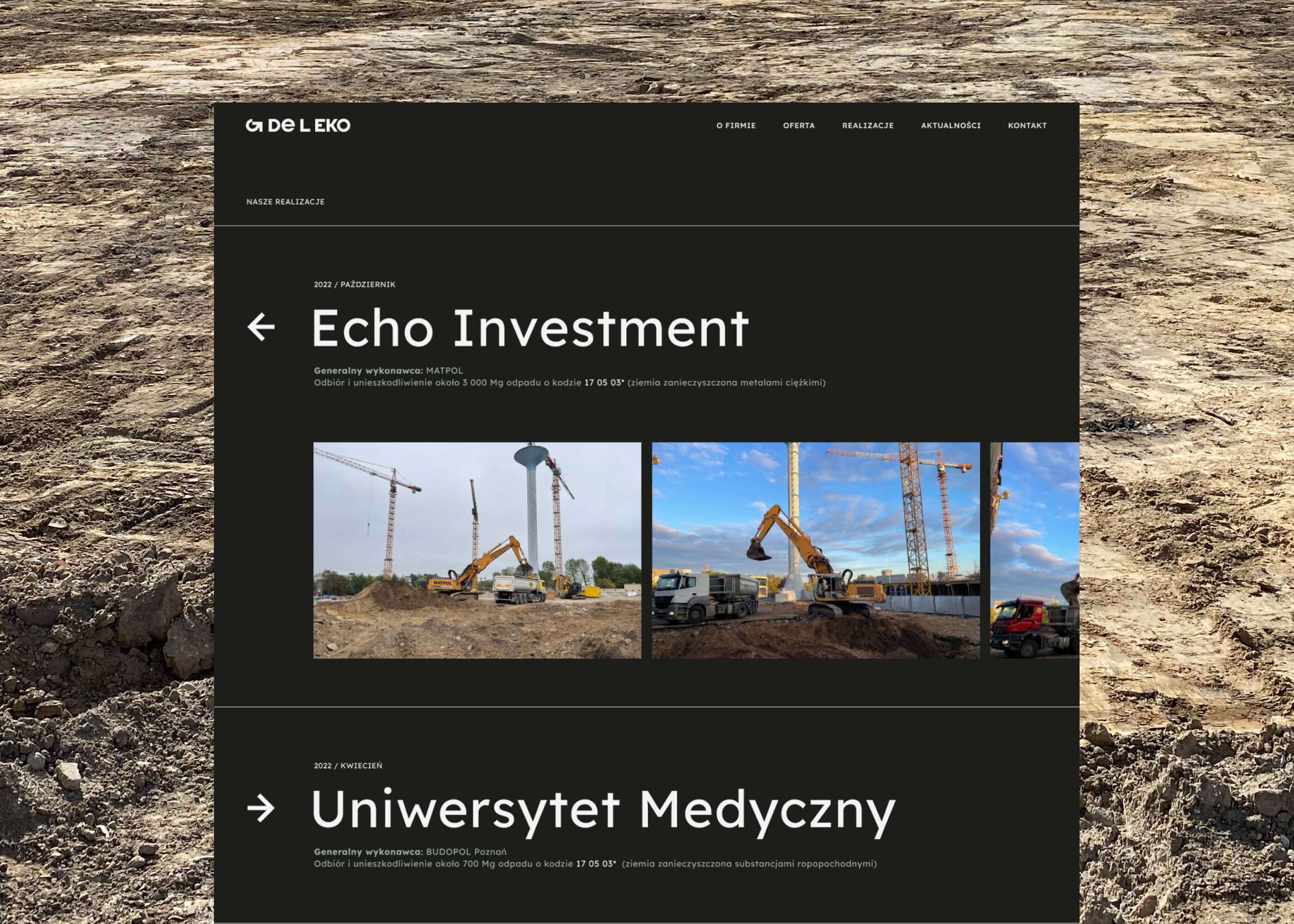 In the project, we focused on emphasizing ecology in the recultivation process. The signet ring is made of the letter G and an arrow, creating a sign associated with the processing of damaged material into usable material. Nevertheless, we also wanted to illustrate the type of activity of the company, i.e. heavy industry. We adjusted the website to the aesthetics of the photos and focused on the transparency of information – it is easy to find here the most important information about the company and waste codes that it can deal with. We used broken black and green and brown referring to the lands and lands closely related to reclamation.