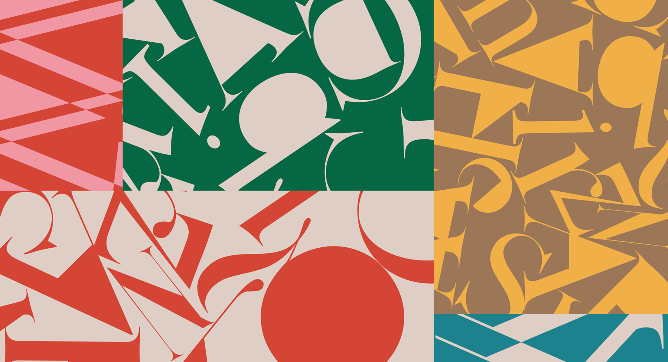 The wordmark is custom drawn. It’s combined with colorful patterns made from glyphs found in Baskerville PT. See more images on my portfolio website.