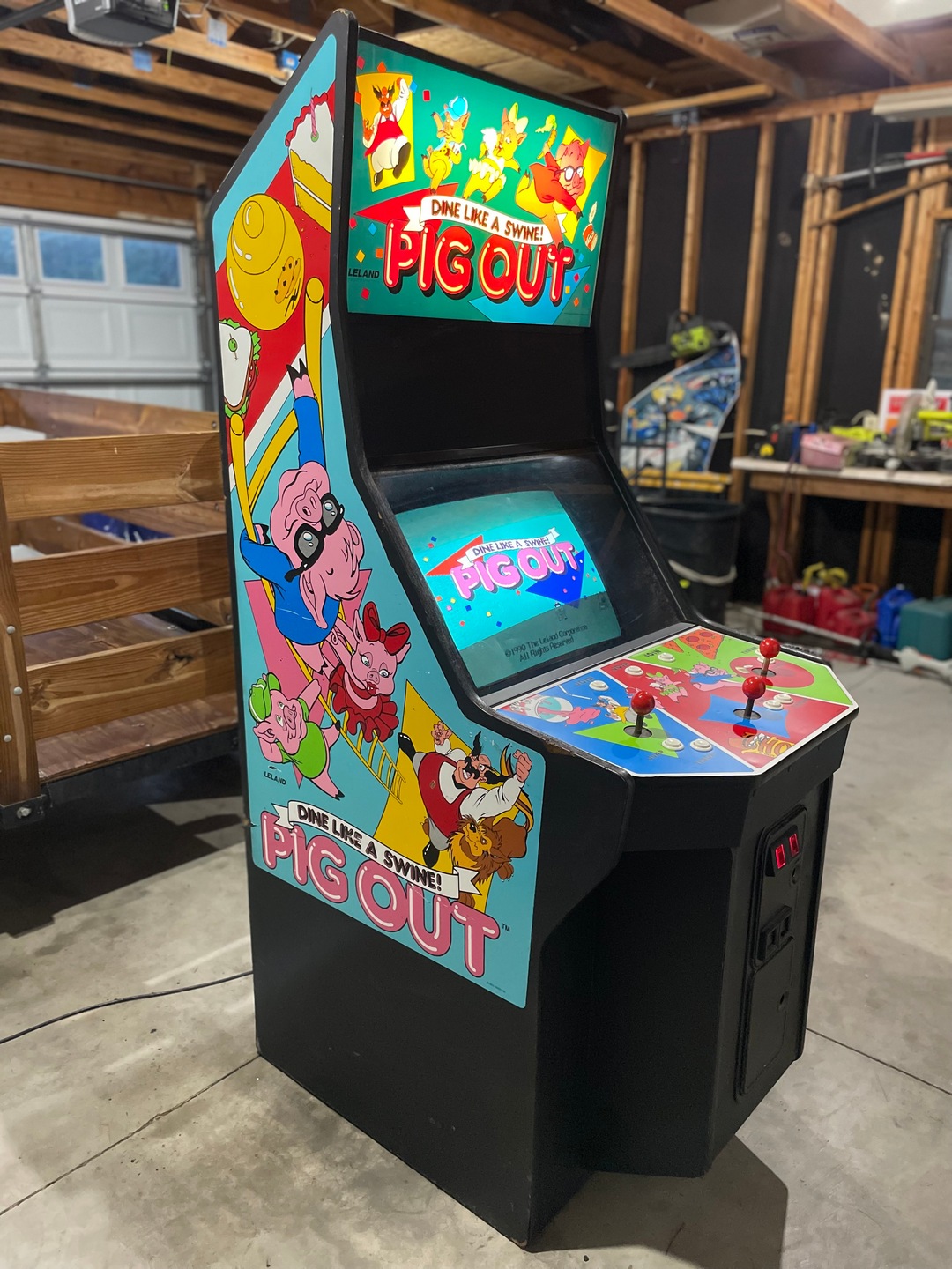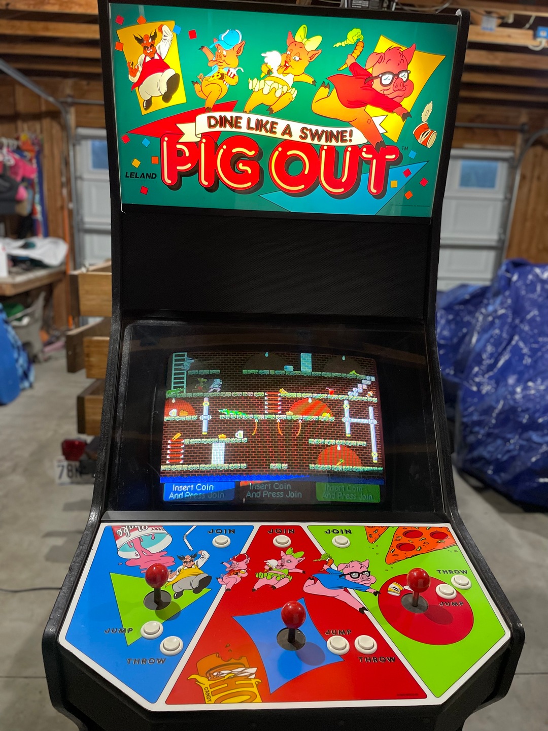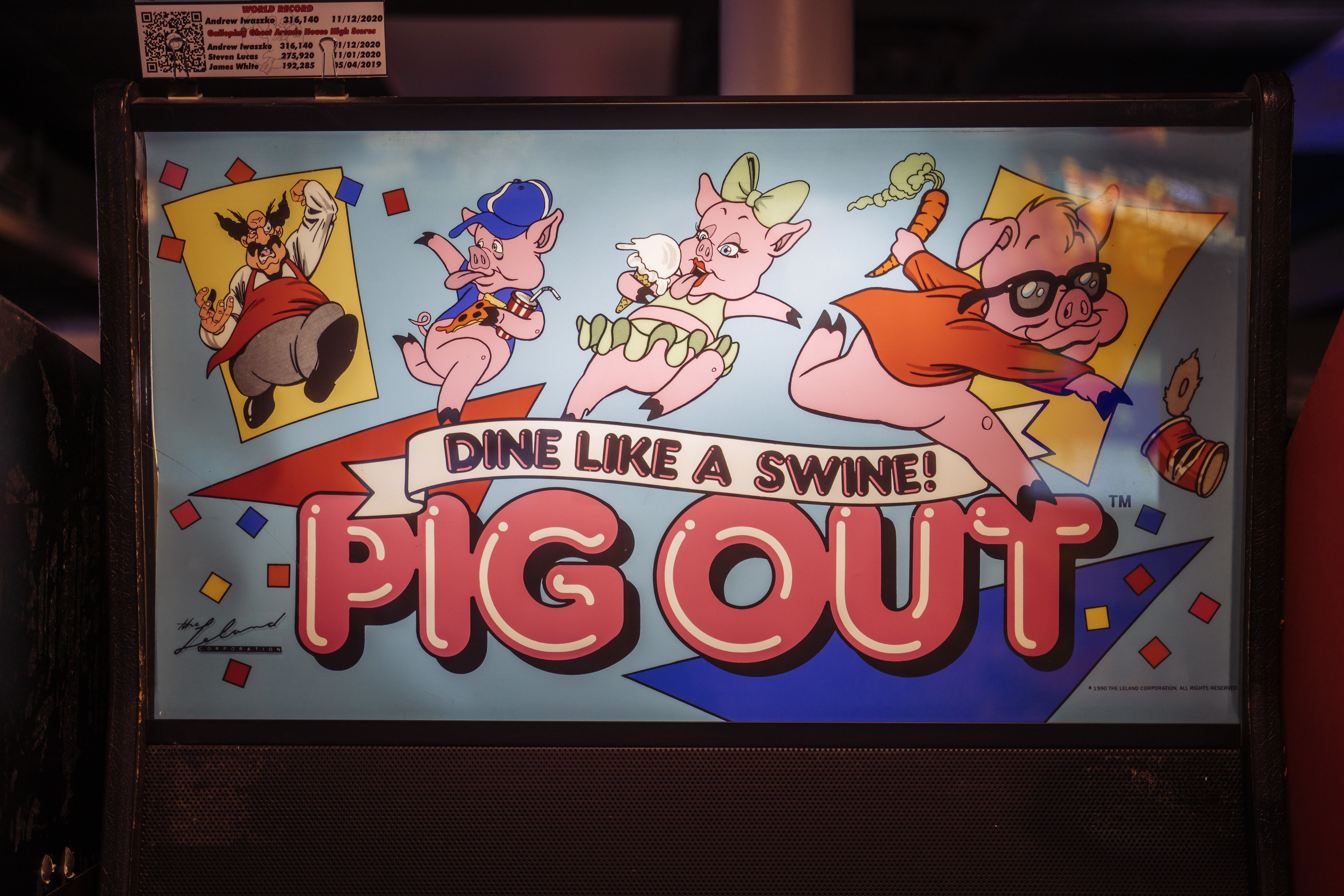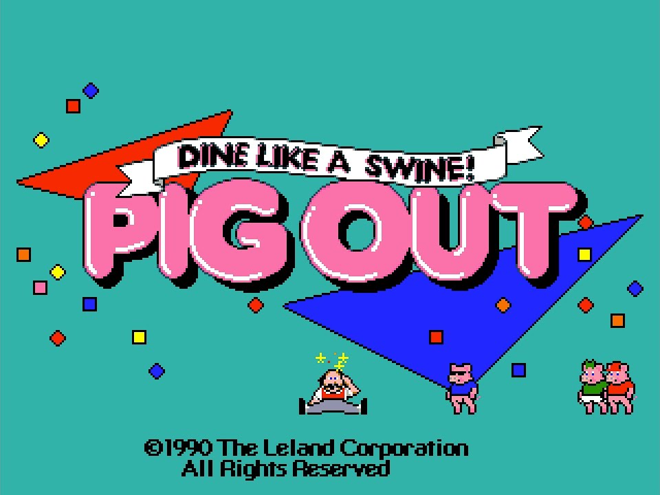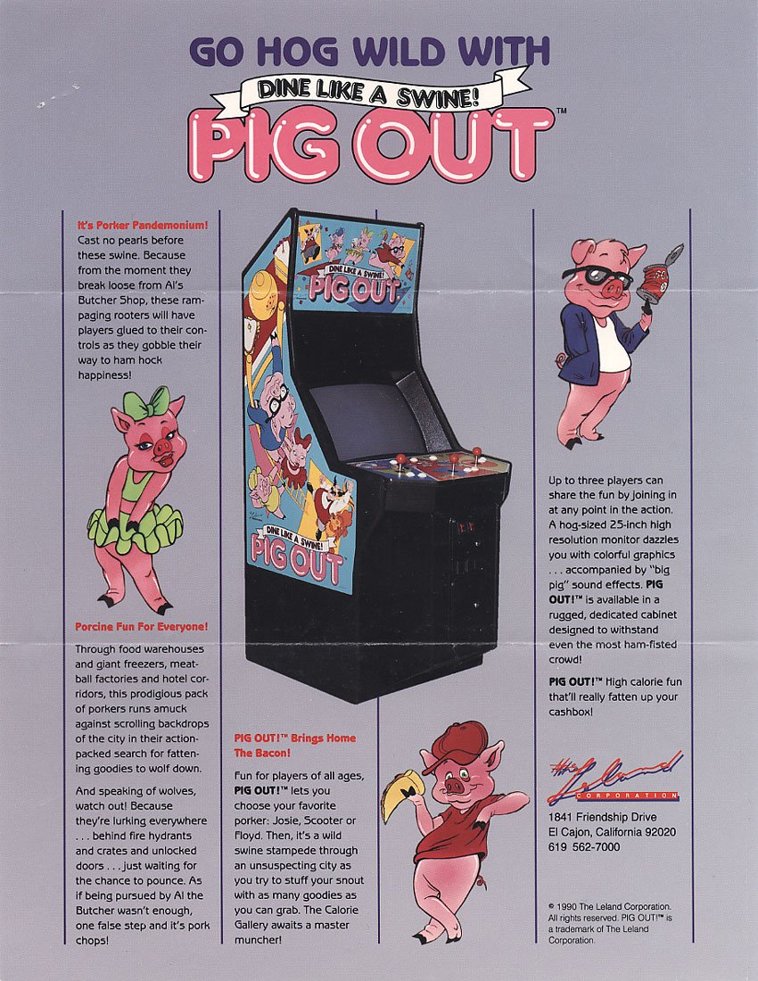 Pig Out is an arcade game produced by the Leland Corporation in 1990. The title including the slogan “Dine like a swine” use Frankfurter Highlight, Nick Belshaw’s 1978 extension of Letraset’s original Frankfurter from 1970.
