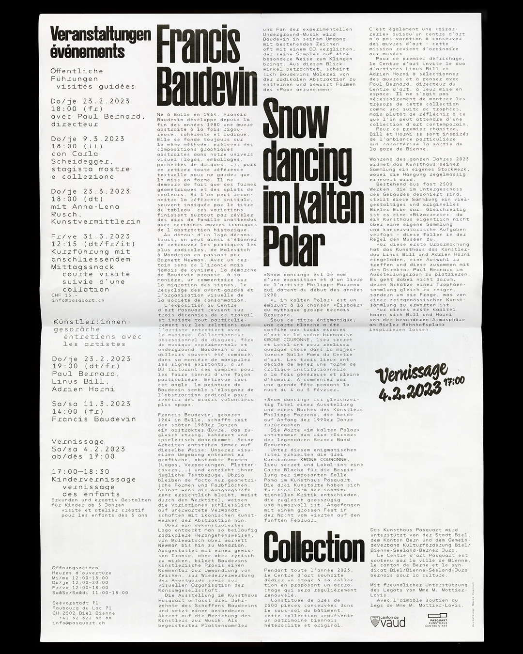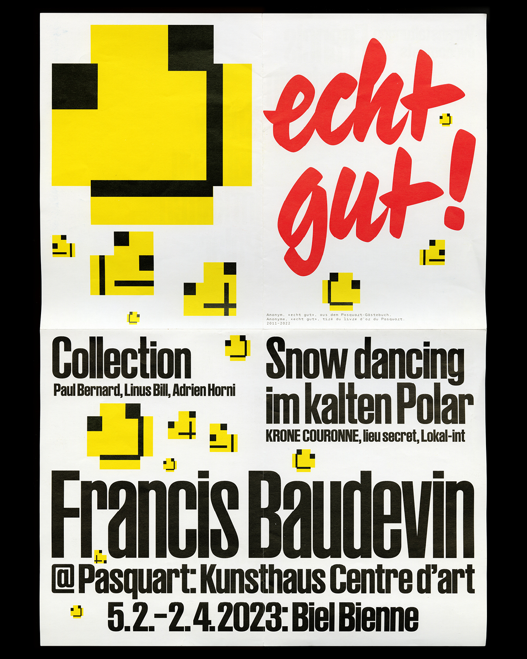 The change of the direction and program of the Kunsthaus Centre d’art Biel Bienne was visualized through a series of posters with visitor comments. We decided together with the new director, Paul Bernard, to bring excerpts from the guestbooks of the past 10 years into the streets of the city of Biel. LL Blankenhorn was chosen to suggest a spontaneous and authentic voice.
