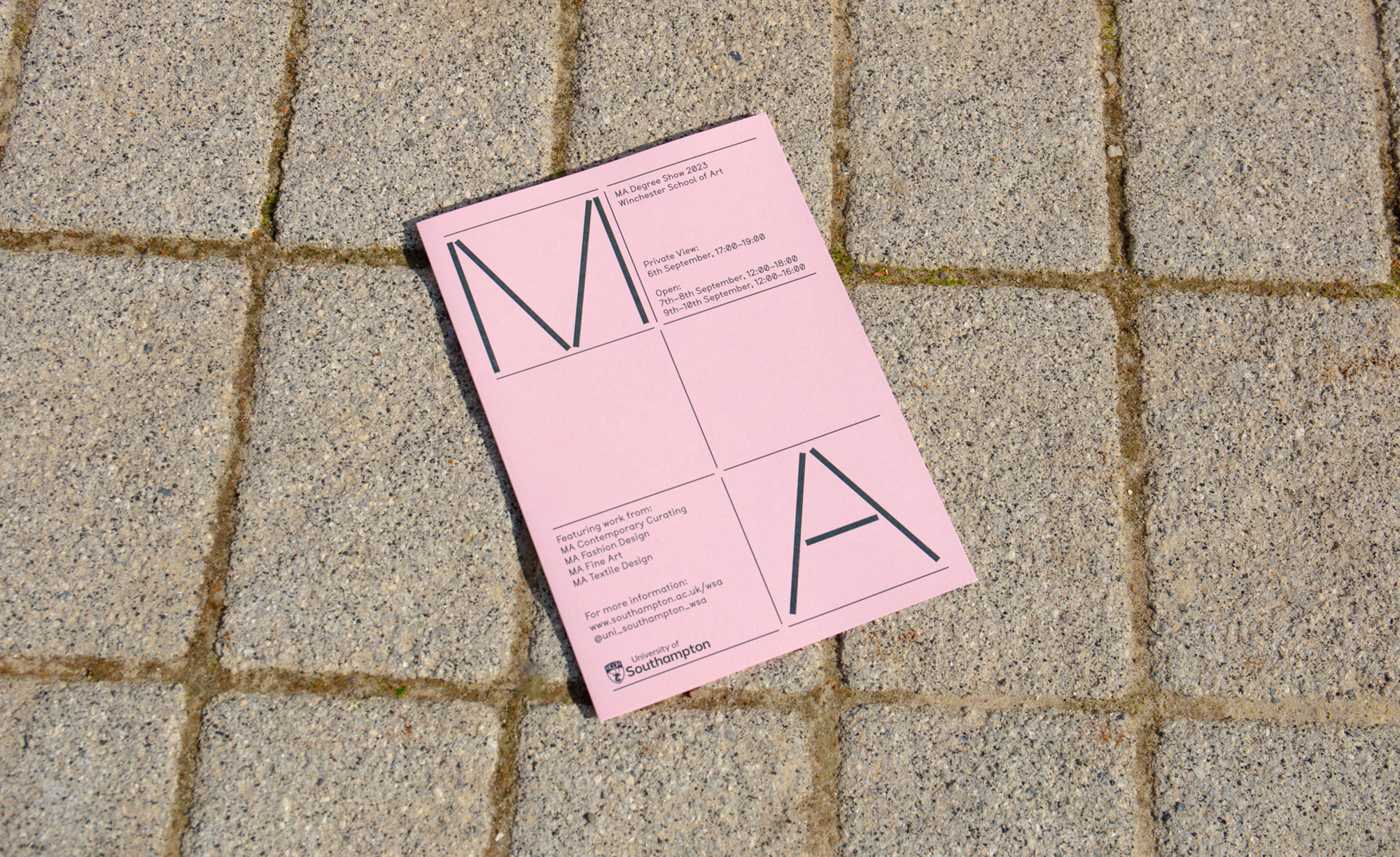 Studio 3015 designed the identity system for Winchester School of Art’s MA Degree Show in 2023 that celebrated the cohort of students graduating from their studies and showcased their work from our postgraduate programmes; MA Contemporary Curating, MA Fashion Design, MA Fine Art and MA Textile Design.