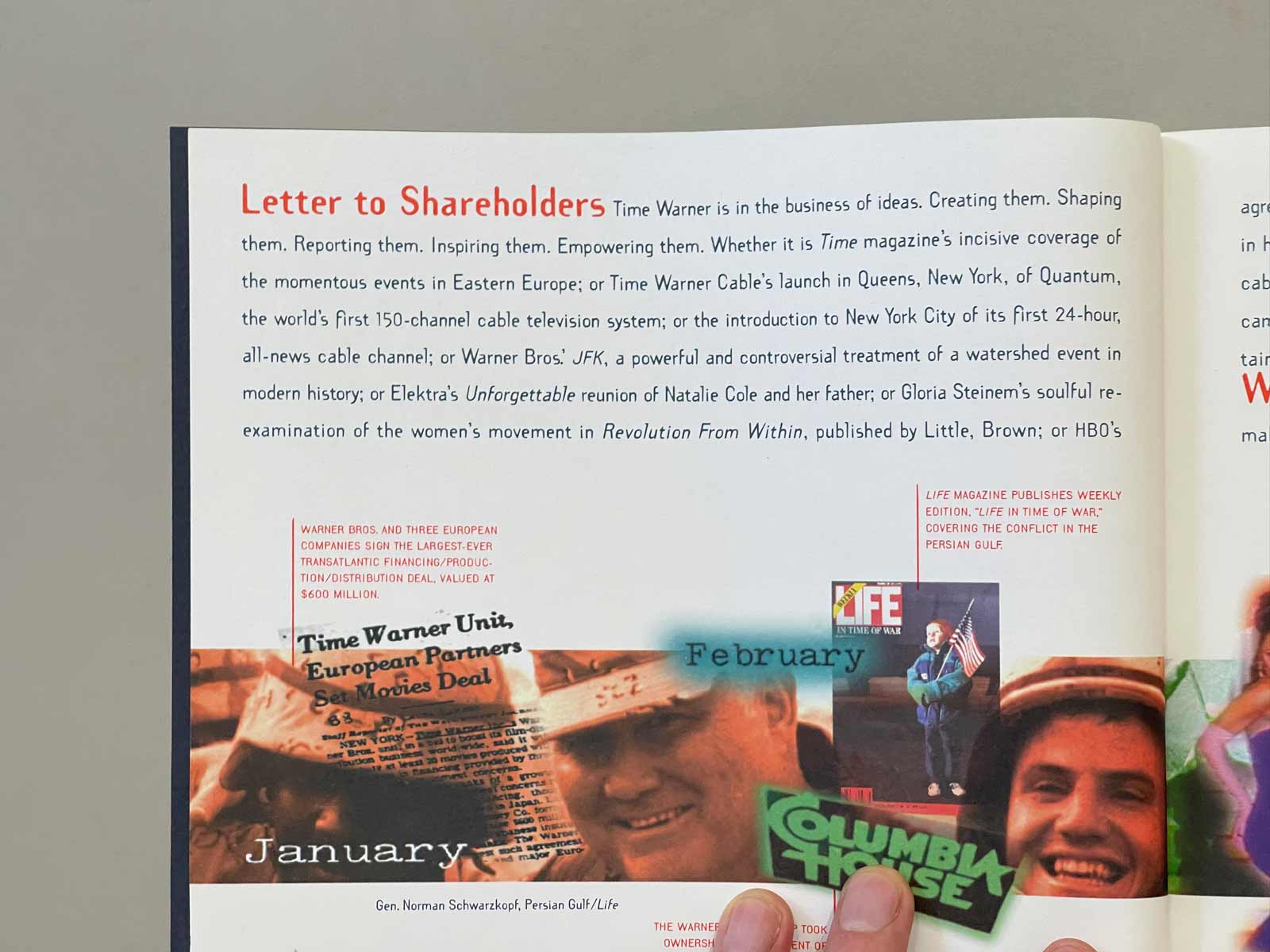 In addition to – indeed lots of – Template Gothic, there is Futura Extra Bold for TimeWarner and an unidentified Japanese font for “リーダーシップ” on the cover. The third image features a stretched typewriter style for the months. It’s not Trixie, and while Smithy XT and Typo Writer come close, those didn’t exist yet at the time.