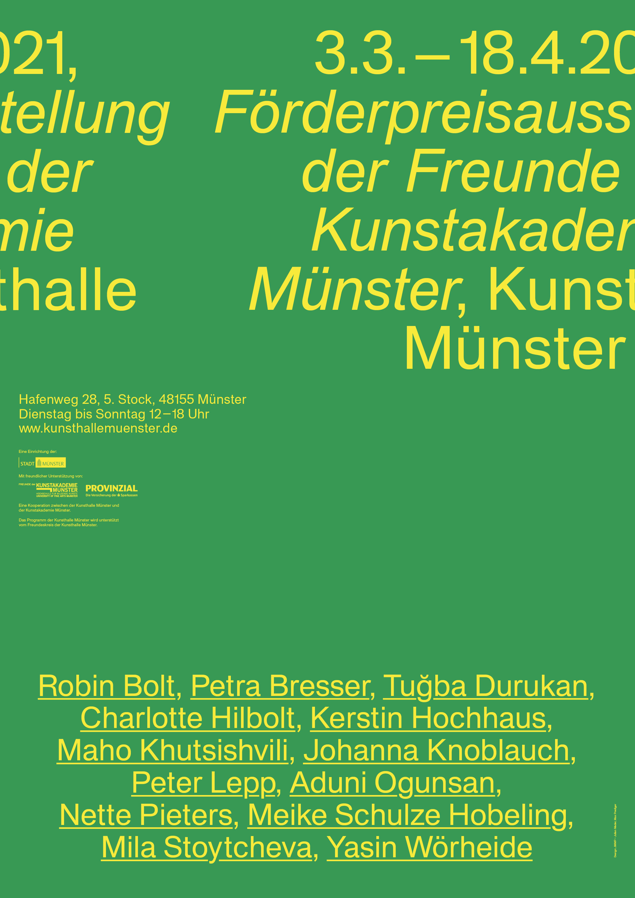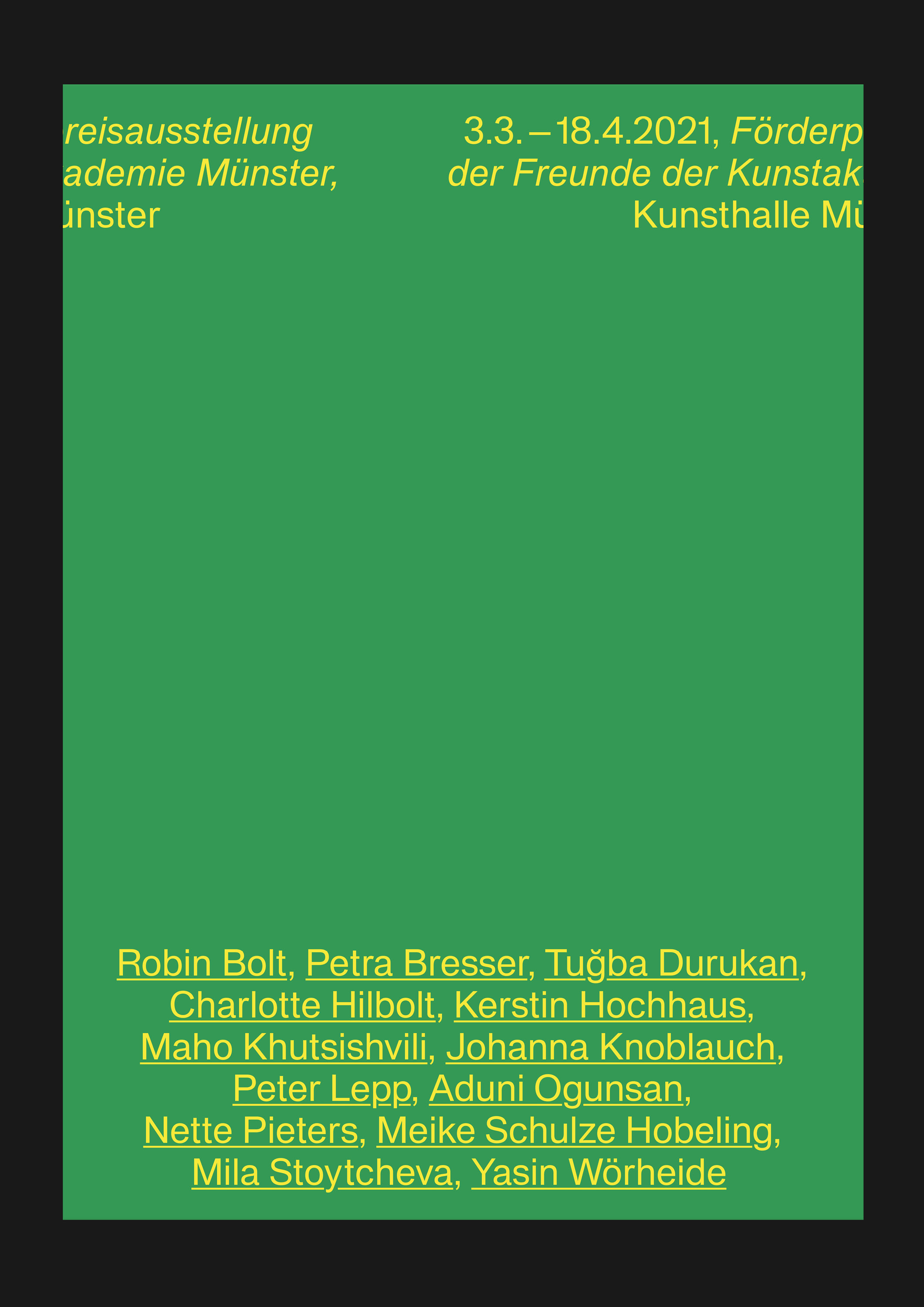Beautiful and consistent use of Syndicat Grotesk Regular since 2018 for Kunsthalle Münster’s visual identity designed by Julian Mader and Max Prediger known under the name of JMMP.