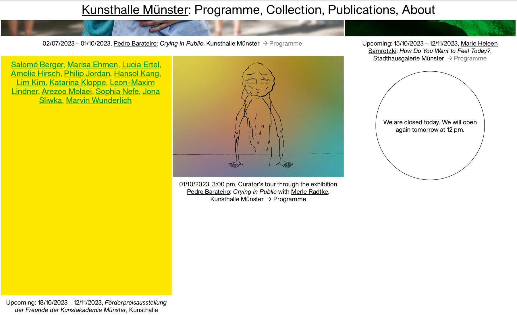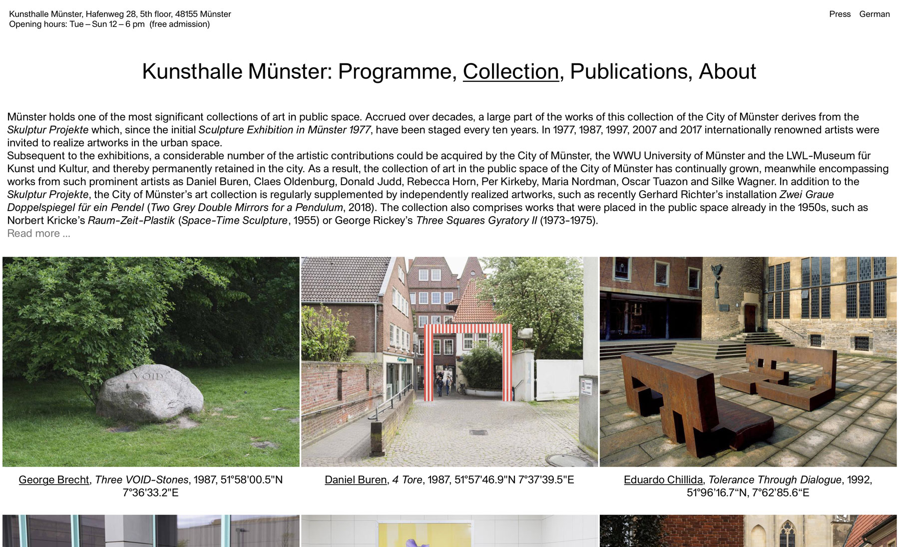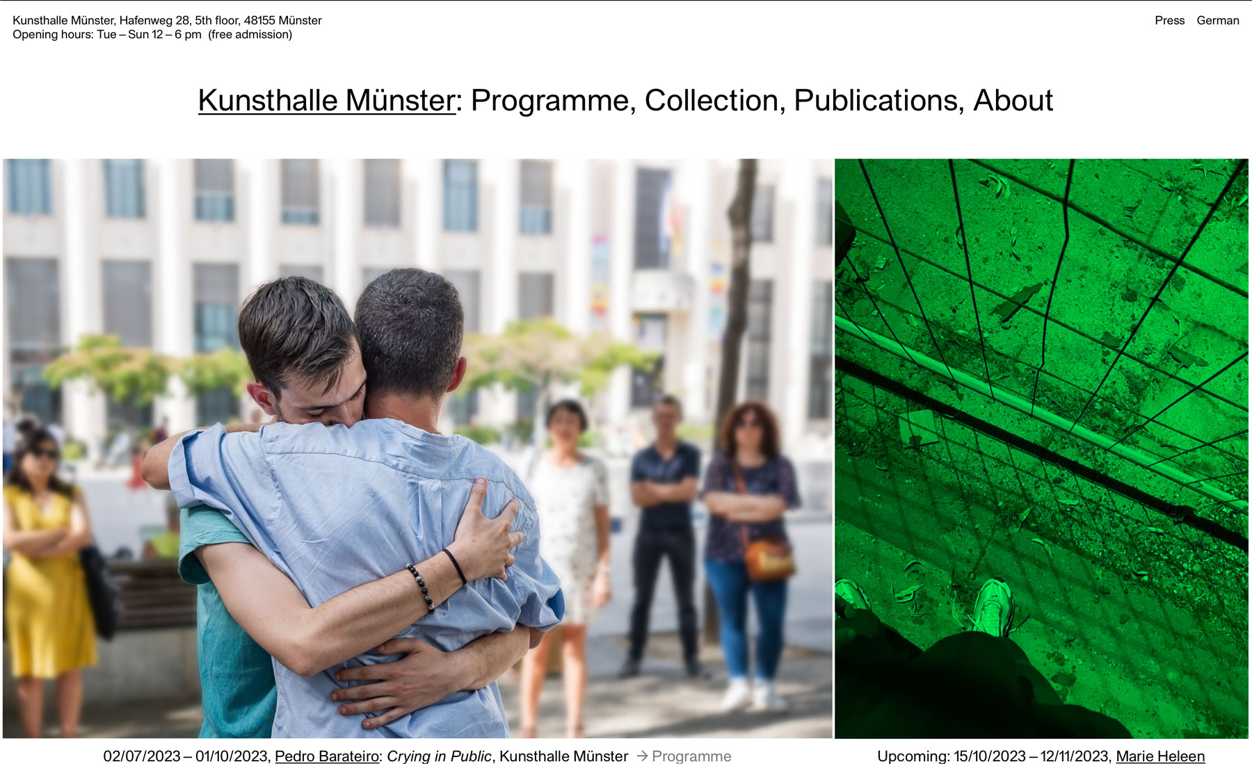 The Kunsthalle Münster has presented national and international contemporary art since its opening in 1991. The institution focusses on current trends and socially relevant themes in alternating exhibitions. It regards itself as a production centre and laboratory. Solo and group exhibitions reflect the world of art on the local, national and international level. The Kunsthalle Münster is a place for experiencing art sensually, but also for engaging in an exchange of ideas and theoretical reflexion. A diversified programme of talks, lectures, guided tours, film screenings, symposia and performances supplements the exhibitions. The Kunsthalle thus promotes and inspires an intensive and controversial debate on contemporary art and topical issues of social interest.