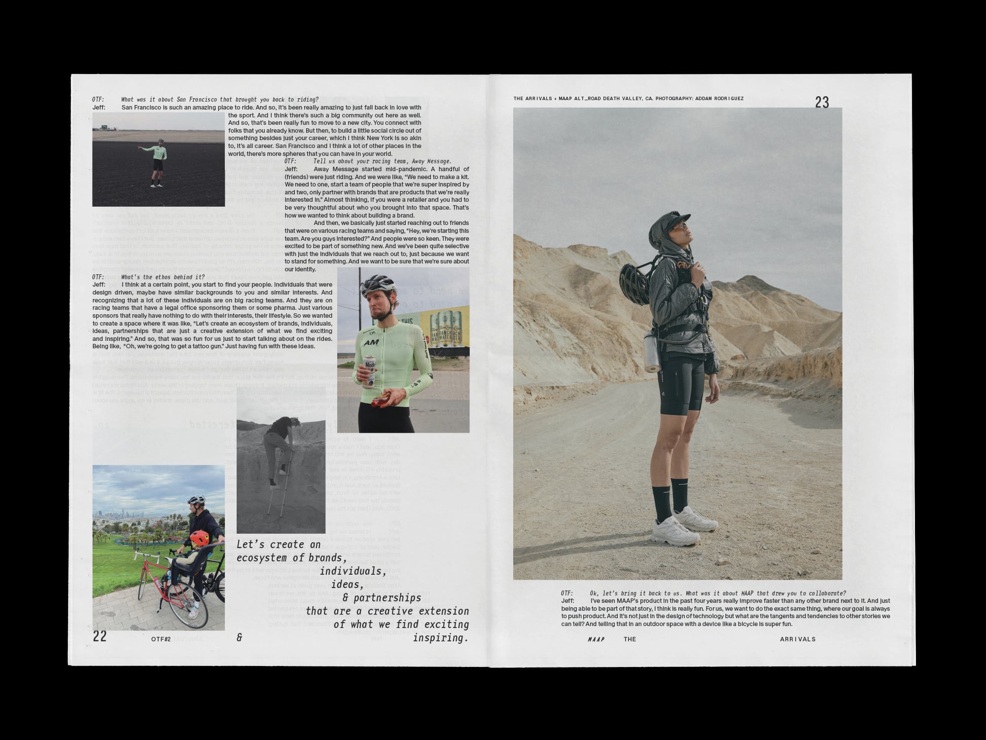 As an extension of the LaB brand, TRiC incorporated the typefaces ABC Synt and ABC Oracle by Dinamo and Base Monospace by Emigre to bring a new dimension to the publication. These typefaces were employed within a dynamic, flexible grid system, referencing concrete poetry and early desktop publishing layouts. The energy, movement and pace of the publication reinforce MAAP’s position as a leader in design and innovation within the global cycling industry.