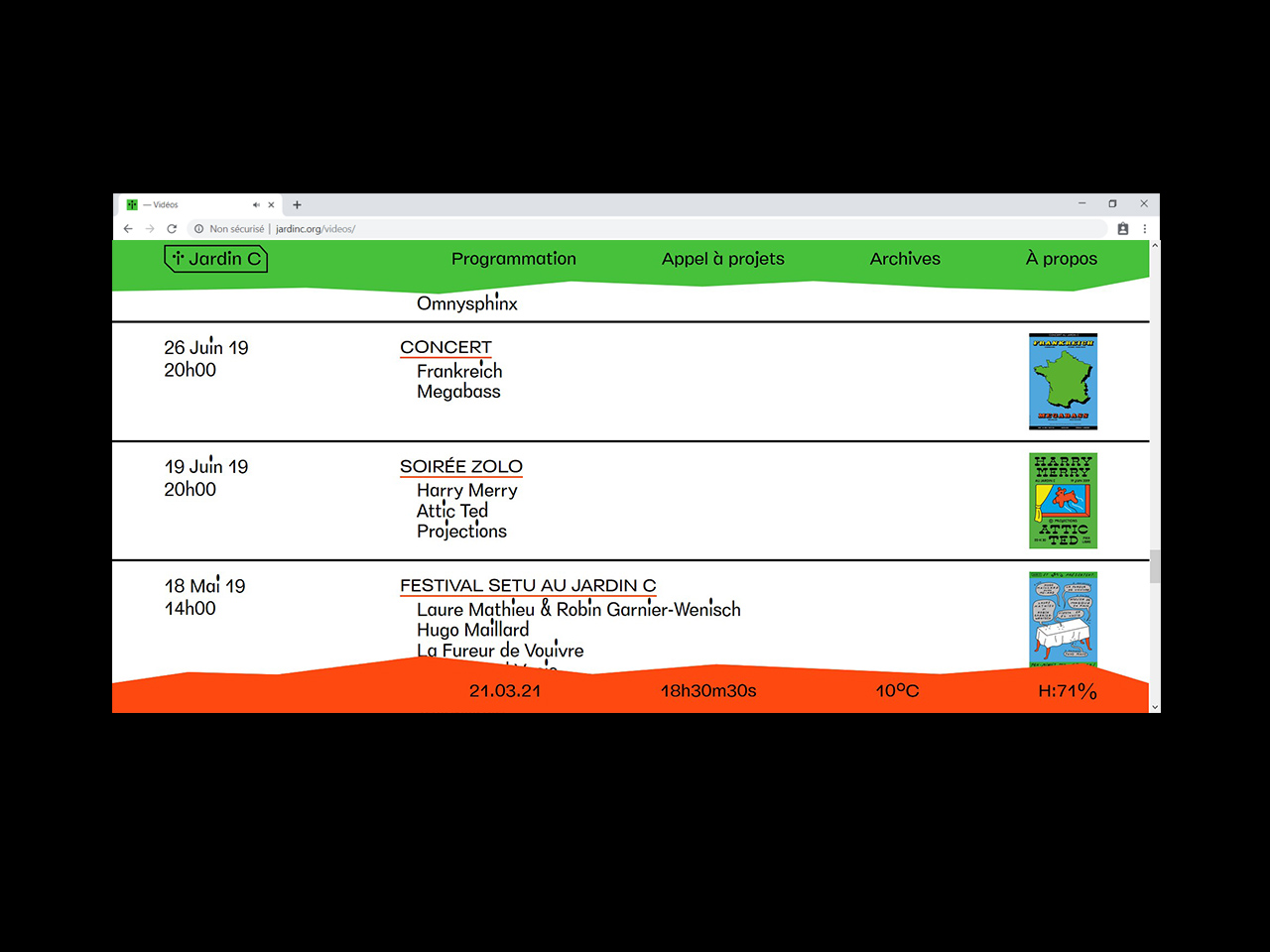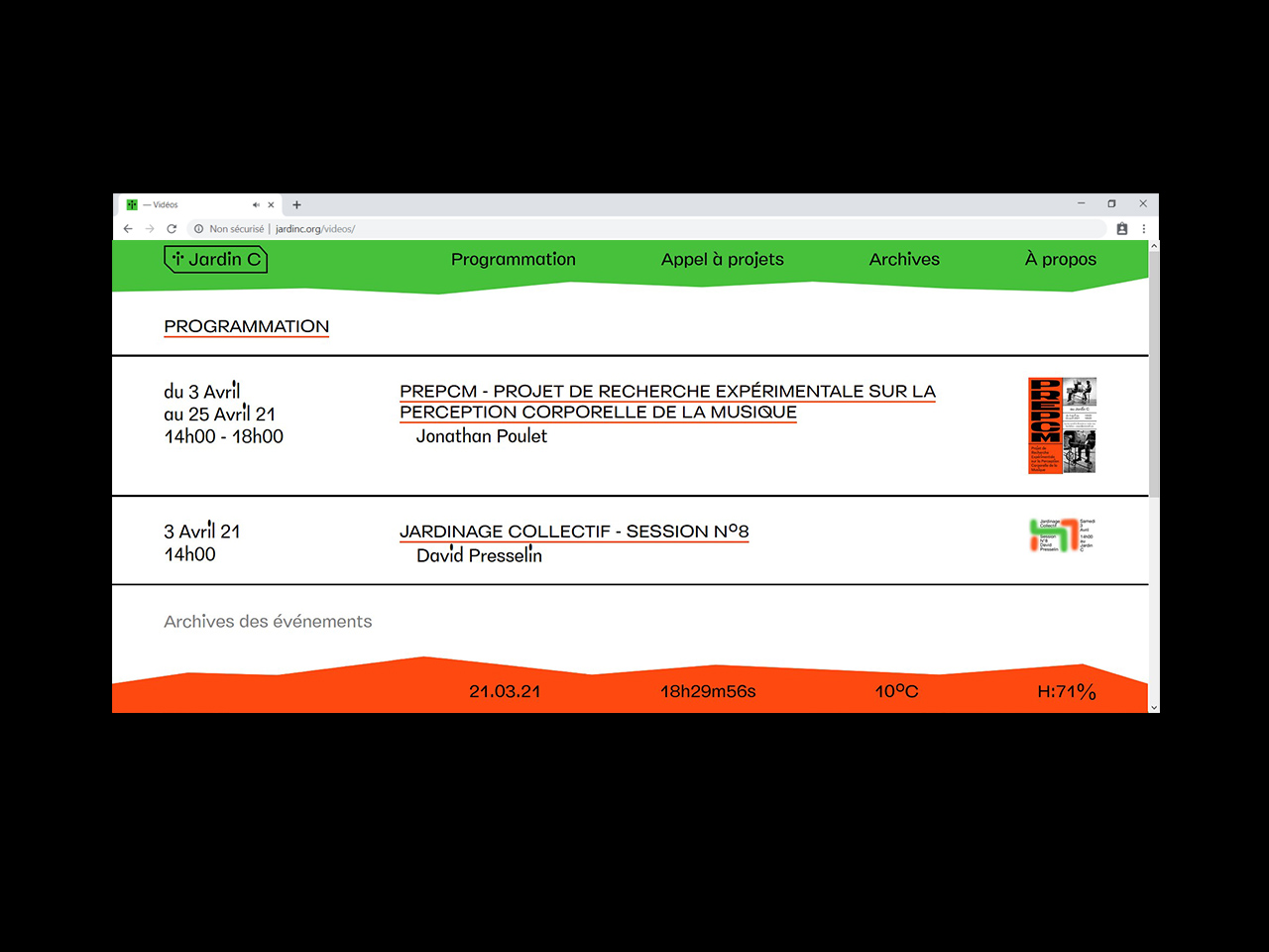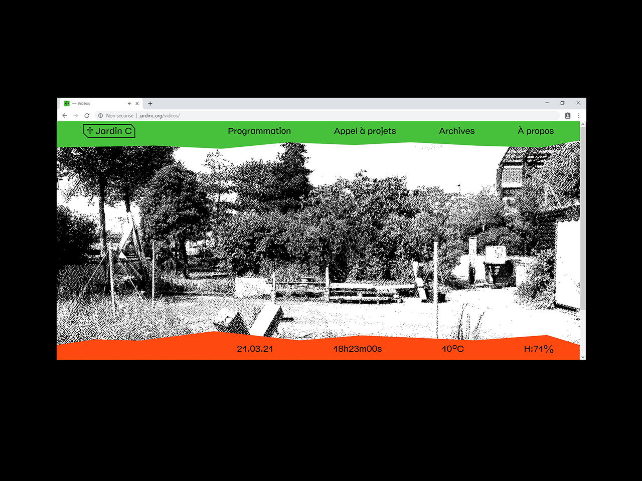 Visual identity and website for Jardin C, an outdoor place in Nantes dedicated to experimental culture. As the garden is an outside venue, every event organized there is very sensitive to the weather. The website has indicators for the current time, temperature and humidity.