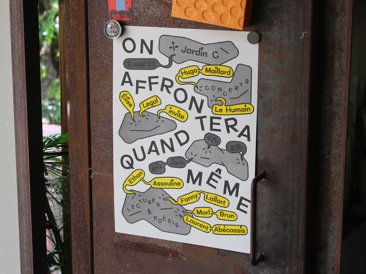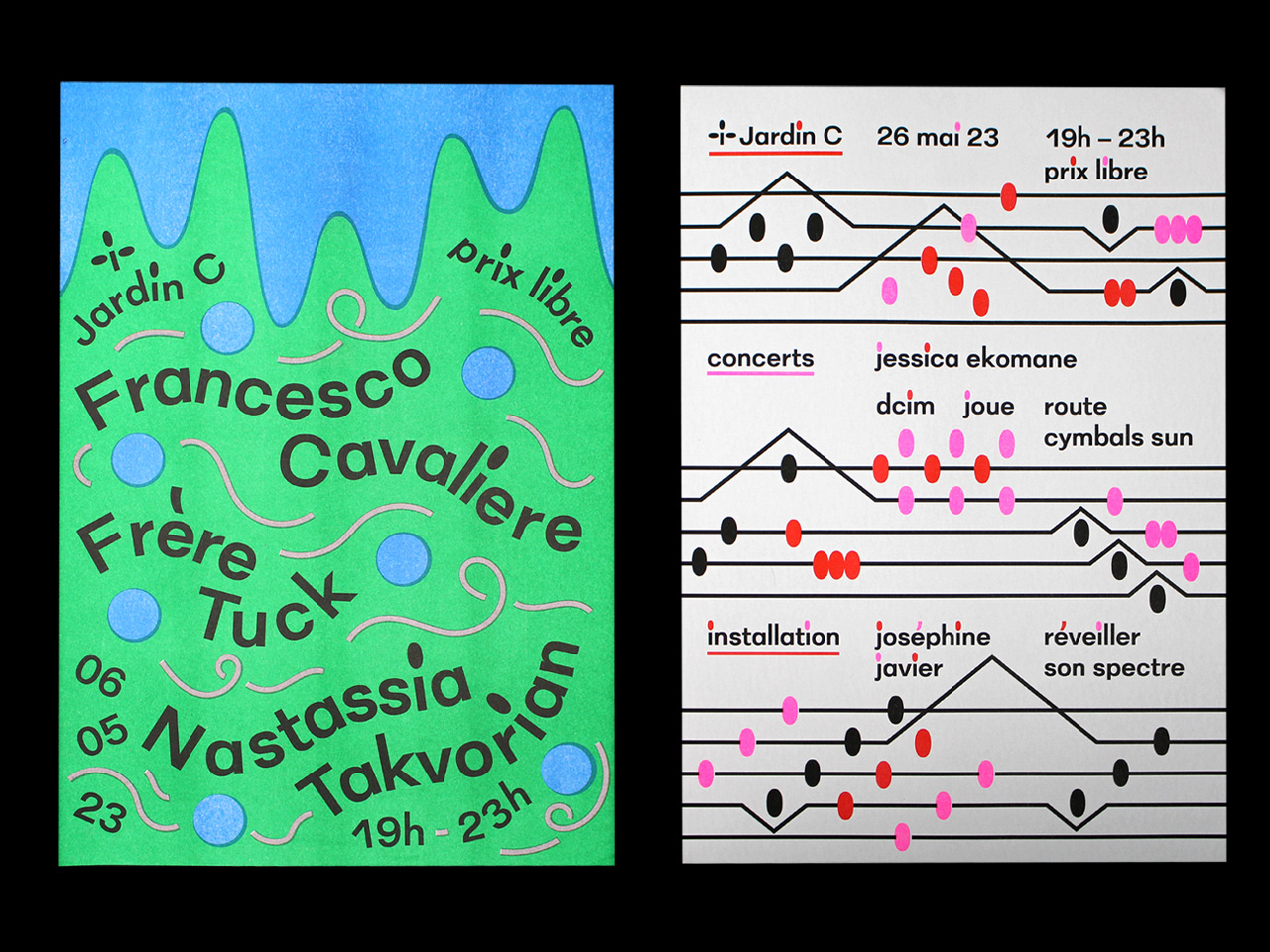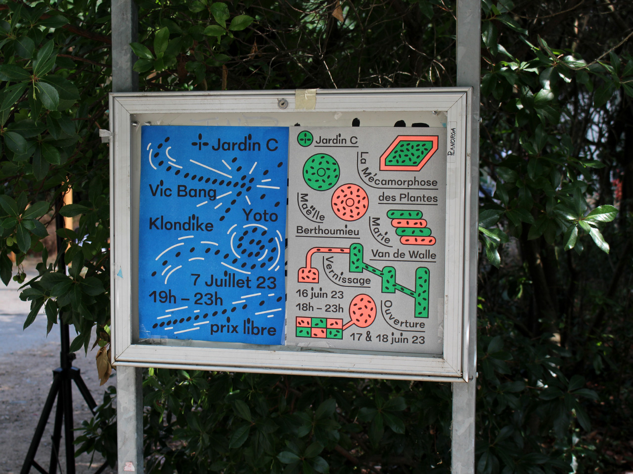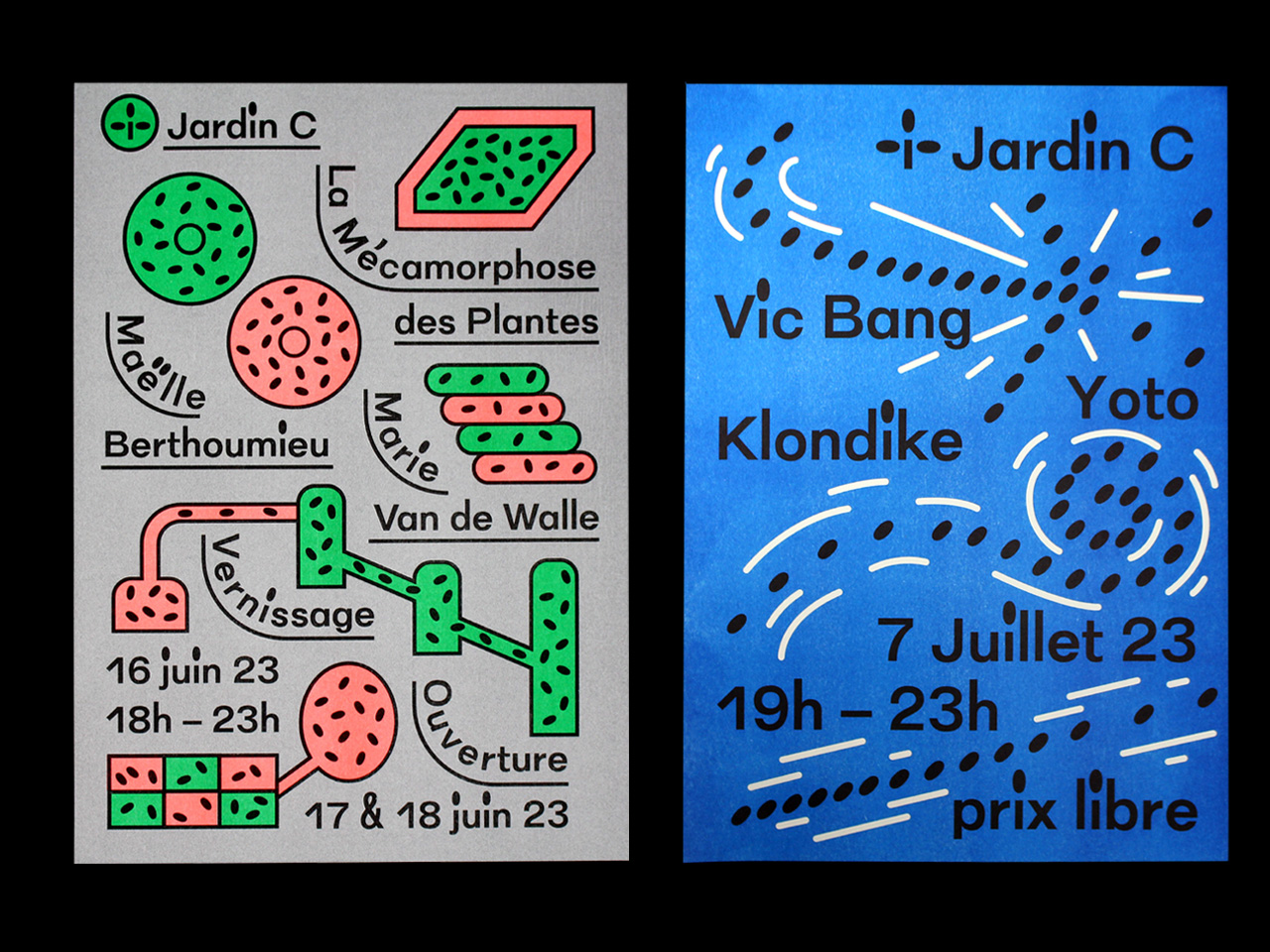 Visual identity and website for Jardin C, an outdoor place in Nantes dedicated to experimental culture. As the garden is an outside venue, every event organized there is very sensitive to the weather. The website has indicators for the current time, temperature and humidity.