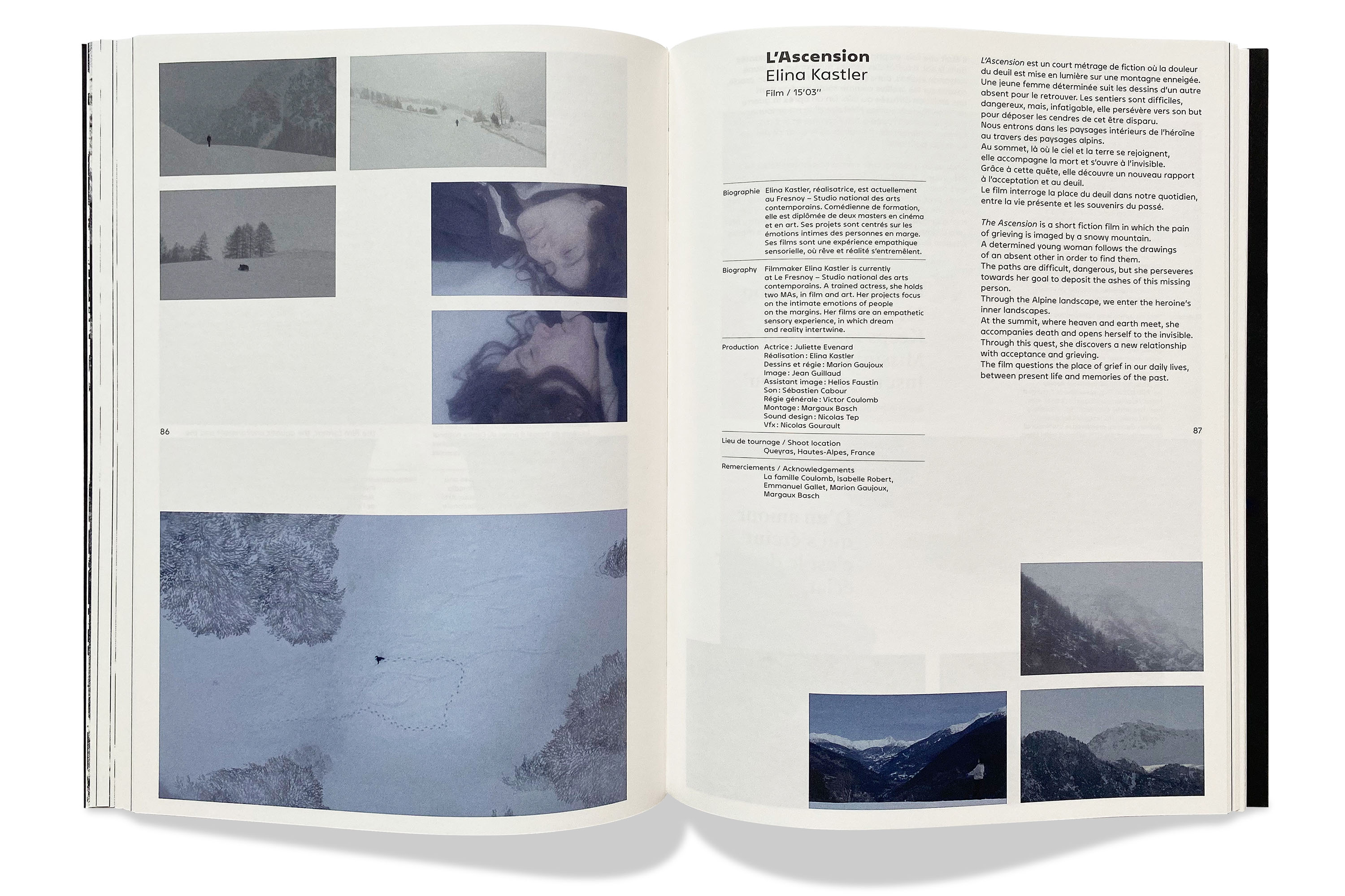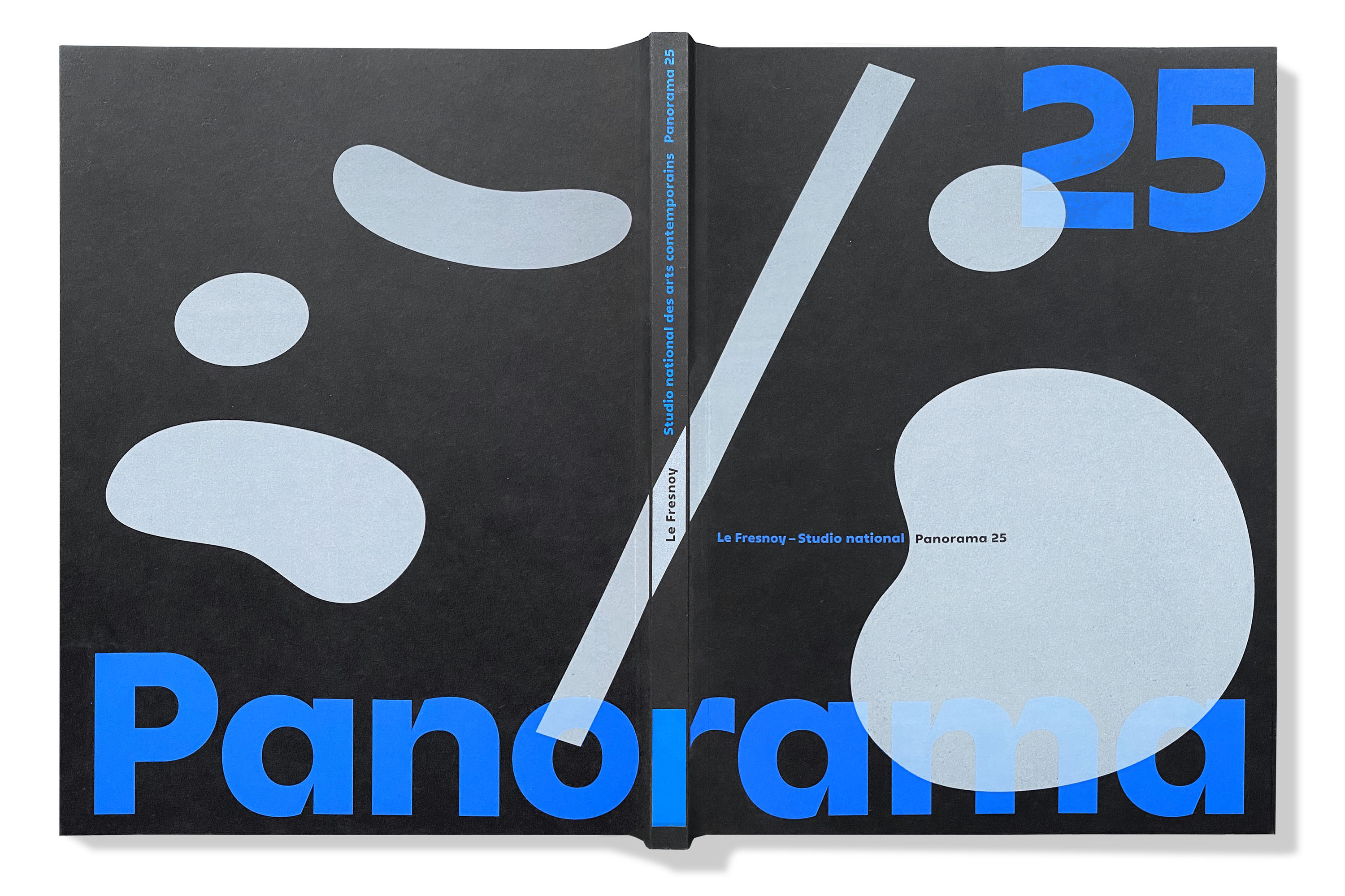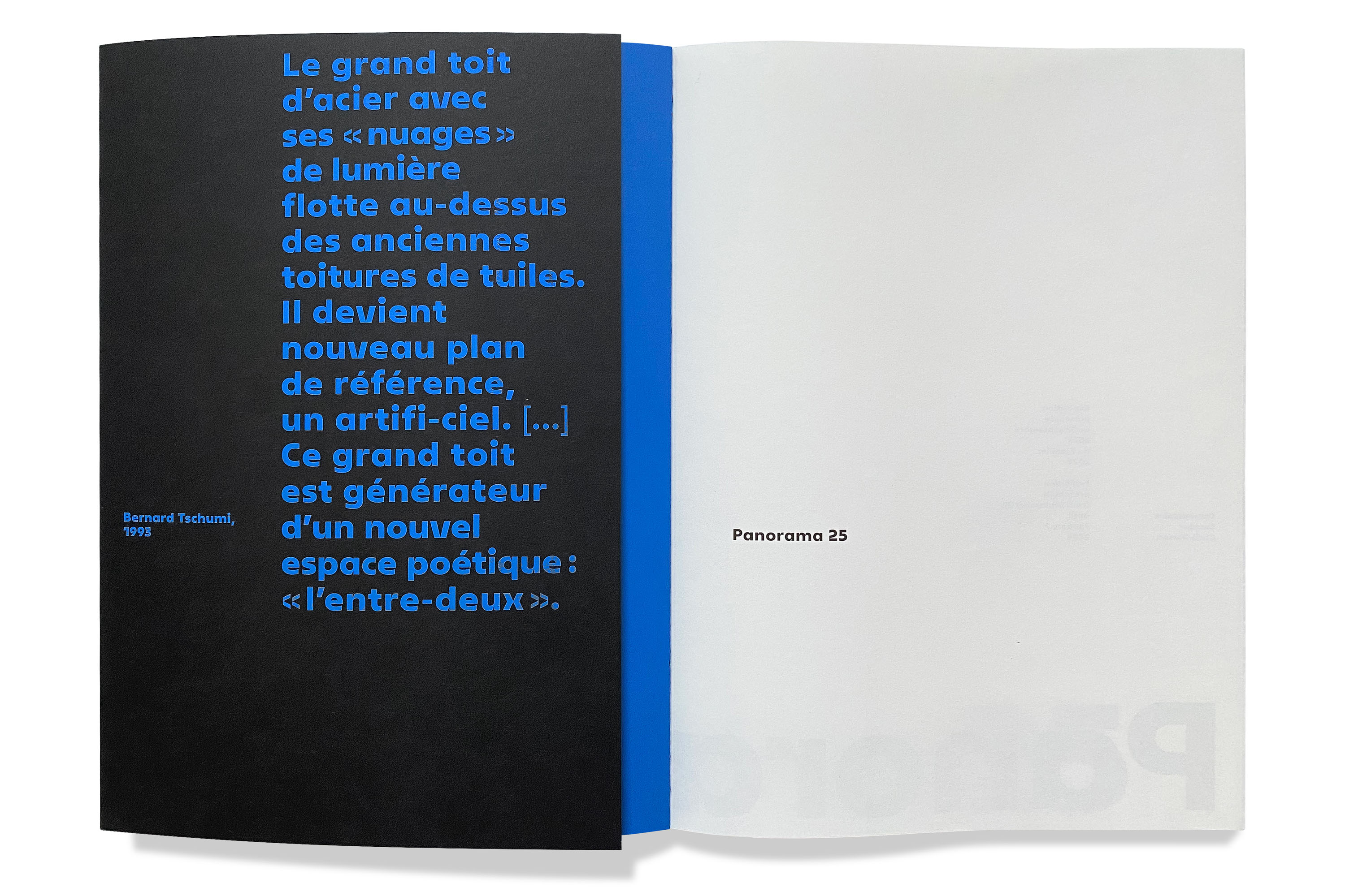 The cover is a tribute to the architecture of Bernard Tschumi, and in particular to the “clouds”, as he called the shapes cut out in the roof. The white shapes, printed in screen printing, partially cover the title, like spots of light projected onto the cover. The blue is a nod to the dominant color of Fresnoy, wanted by Tschumi. Published under the direction of Chris Dercon, curator of the exhibition, with essays by Cord Riechelmann and Wouter Davidts.