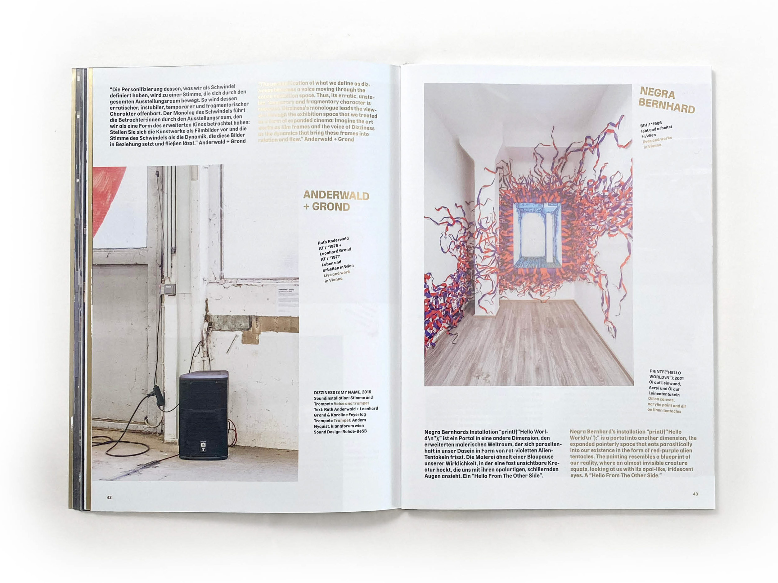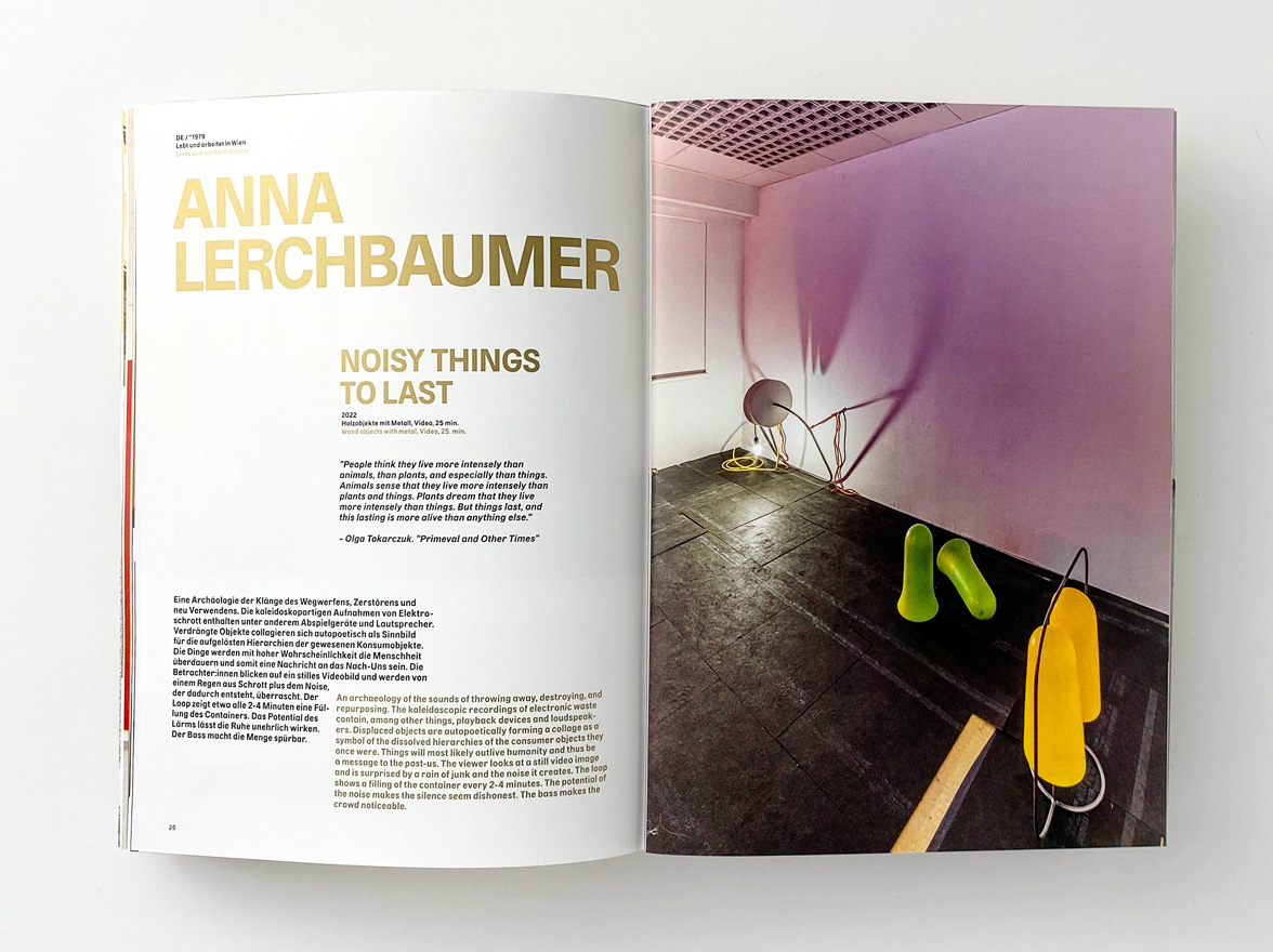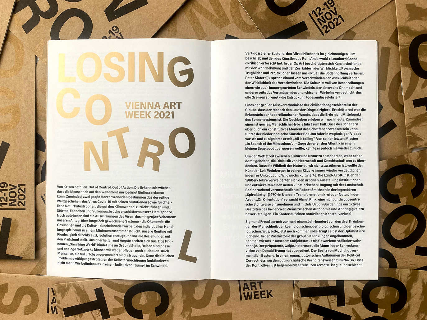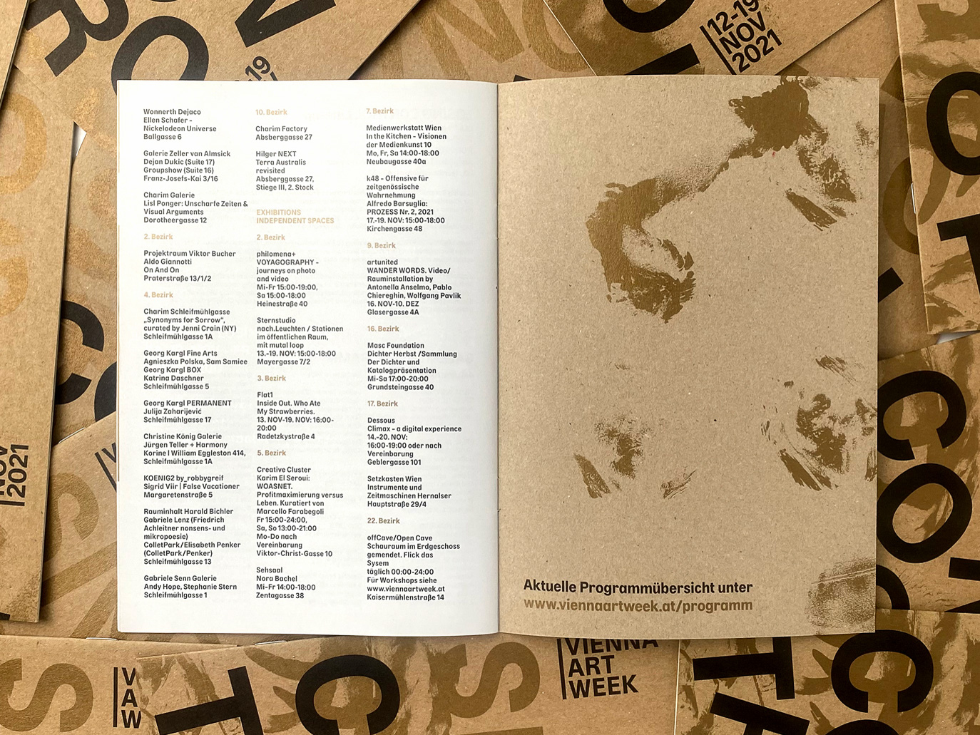 For each annual edition, Vienna Art Week publishes a festival brochure. They come in high-quality cardboard packaging and are printed with a golden Pantone spot color. The program booklets contain all important information on the individual exhibitions as well as the participating artists. The publications are set exclusively in different styles of the Delphia font family, in sizes ranging from display to tiny footnotes.