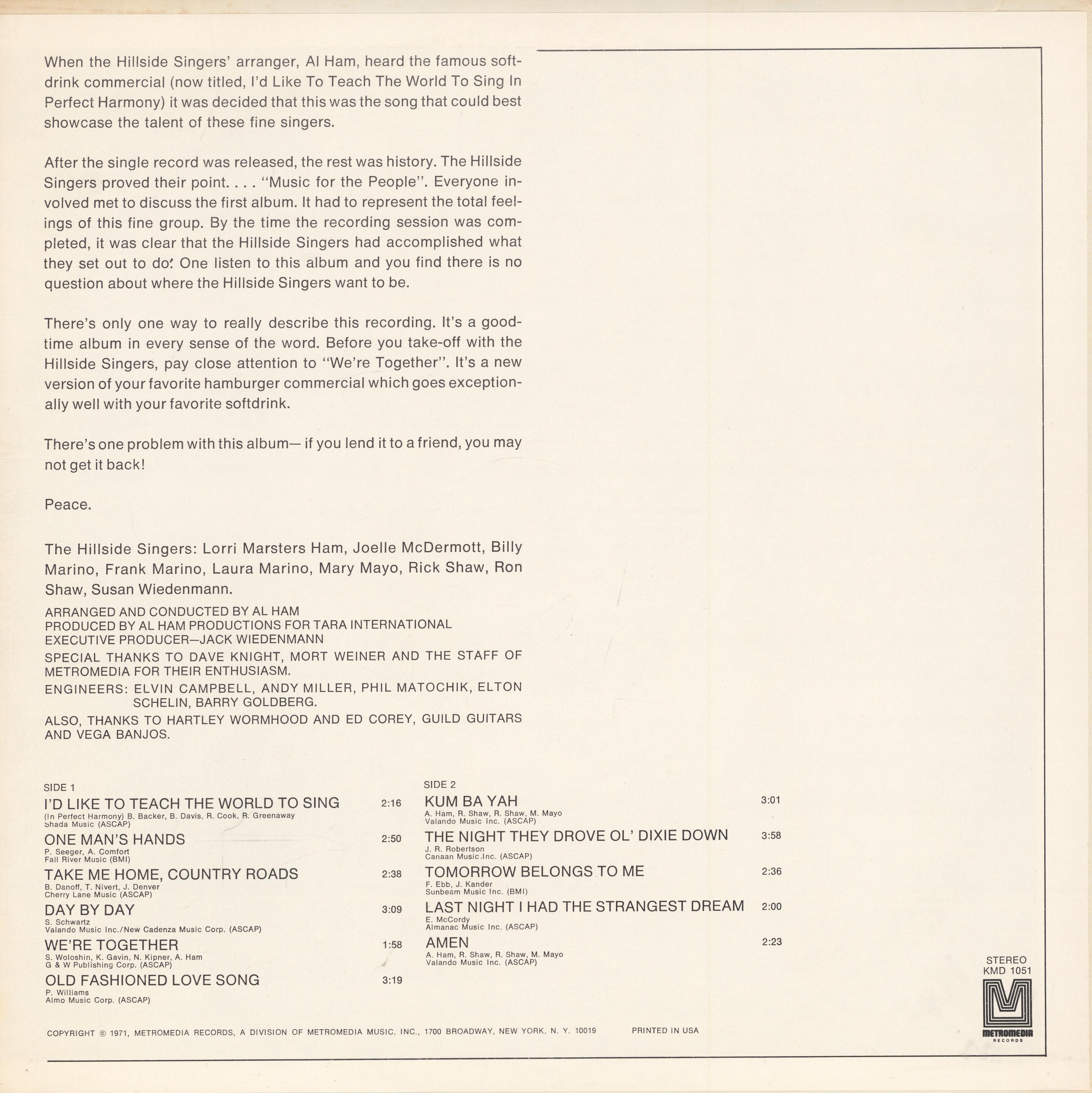 The Hillside Singers were an American folk group. The ensemble was created by advertising agency McCann Erickson to sing in a television commercial. McCann Erickson had written the jingle “I’d Like to Teach the World to Sing (In Perfect Harmony)” for Coca-Cola, and had sought to have The New Seekers sing it, but that group could not fit the project into their schedule and turned it down. McCann Erickson then got in touch with producer Al Ham, who put together a group of singers for the project (including his wife, Mary Mayo, and their daughter Lorri). The commercial began airing in July 1971 and was extremely popular, convincing Ham to rewrite the song as “I’d Like to Teach the World to Sing” and to record an album and a Christmas record. The single hit No. 13 on the Billboard Hot 100 chart, No. 5 on the Adult Contemporary chart, and No. 58 in Canada, which convinced The New Seekers to issue it as a single as well. The Hillside Singers version of the song sold a million copies, earning a gold certification from the Recording Industry Association of America.