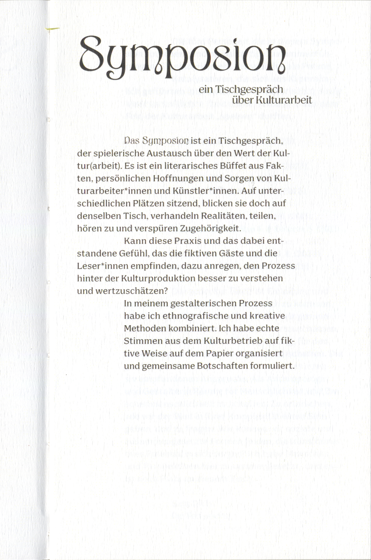 The symposium is a table talk, a playful exchange about the value of cultural work. It is a literary buffet of facts, personal hopes, and concerns of cultural workers. Coming from different places, yet sitting at the same table, those working in culture negotiate realities, share and listen, and feel a sense of belonging. Can this practice, and the feeling it creates for the fictional guests and readers, give rise to a better understanding and appreciation of the process behind cultural production? In my creative process, I combine ethnographic and creative methods. I have organised real voices from the cultural sector in a fictional way on paper and formulated prominent common demands and messages. The table setting is both an invitation and a call: to enter into conversation about what culture creates and what we could create together; to value the efforts it takes to cultivate occasions for encounter, for collective and sensual consumption.