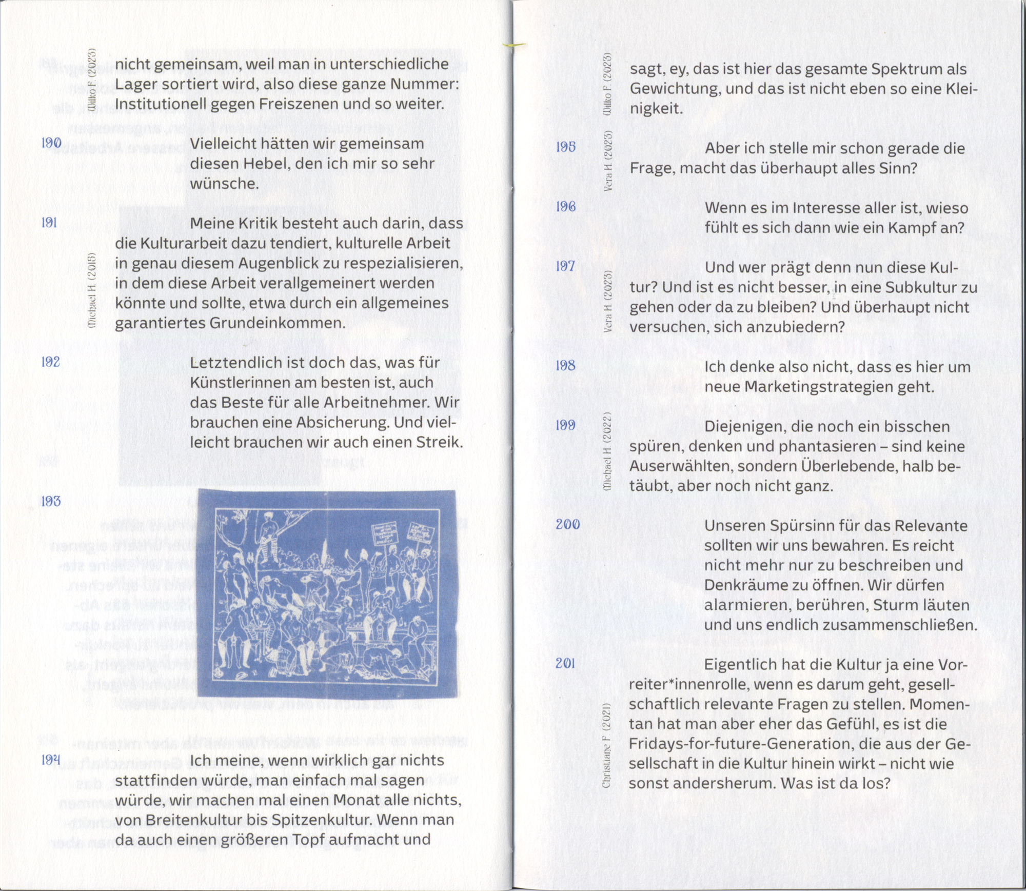 The five people who speak in this symposium are mosaic-like assemblages. They are perspective rather than person. Catalysts who were allowed to “feed” on ten personally conducted interviews and ten literary and academic discussions from the field of cultural work.