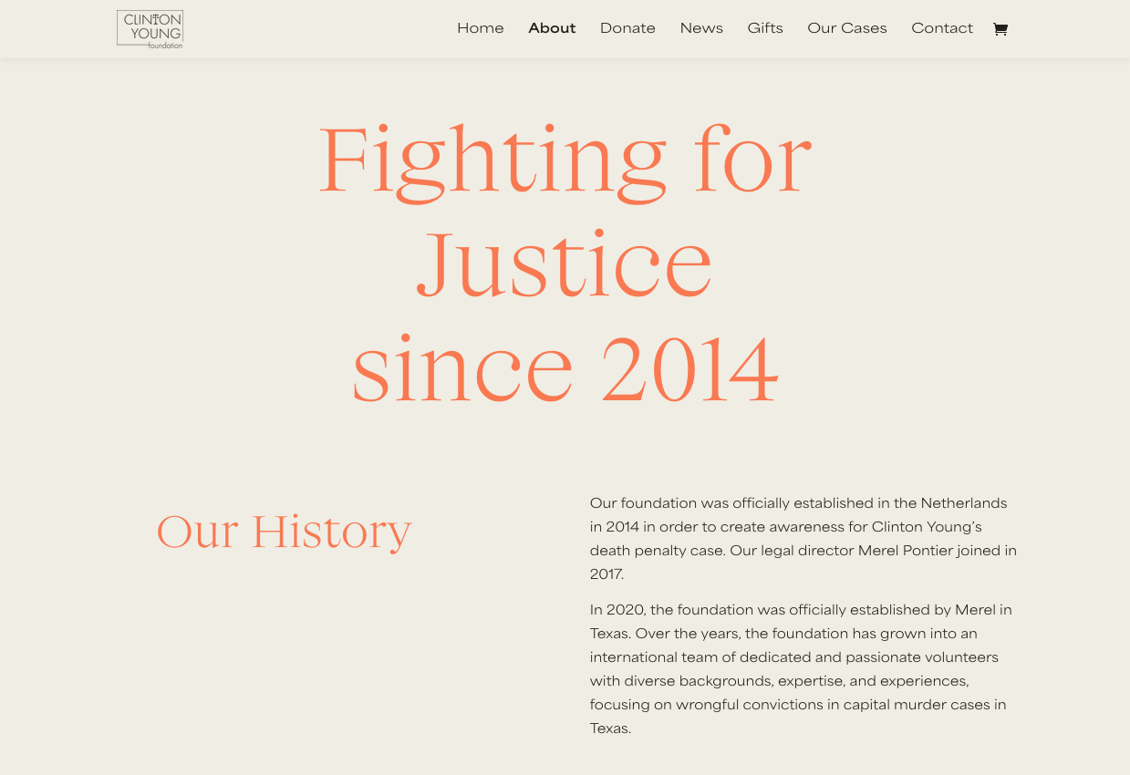 The Clinton Young Foundation was first established in 2014 in the Netherlands with the target to raise public awareness of the legal case of Clinton Young who had wrongly been sentenced to death penalty in 2003. In 2020 the foundation officially opened a second office in Austin, Texas. In 2021 Clinton’s case was vacated by the Texas Court of Criminal Appeals and in 2022 he finally was released from jail on bond. While, after twenty years on death row, his case eventually found a good ending, the foundation broadens its scope and keeps on working for all those wrongfully convicted of capital murder in Texas.