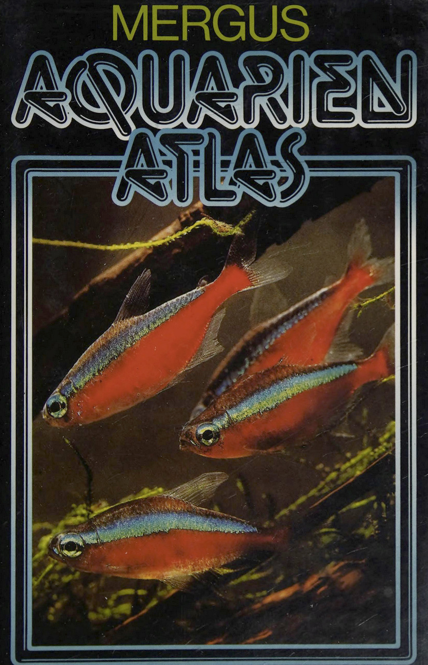 In fact, Quicksilver is the typeface used for all books by Mergus. Founded in 1977 by Hans Baensch (1941–2016) in Melle, Germany, Mergus brought out the first volume of the Aquarien Atlas in 1982. The jacket design and typography is credited to Braun-Design, Werther. Quicksilver is used with contoured and overlapping letters, and often with its alternate narrow S. The rounded border echoes the typeface design.