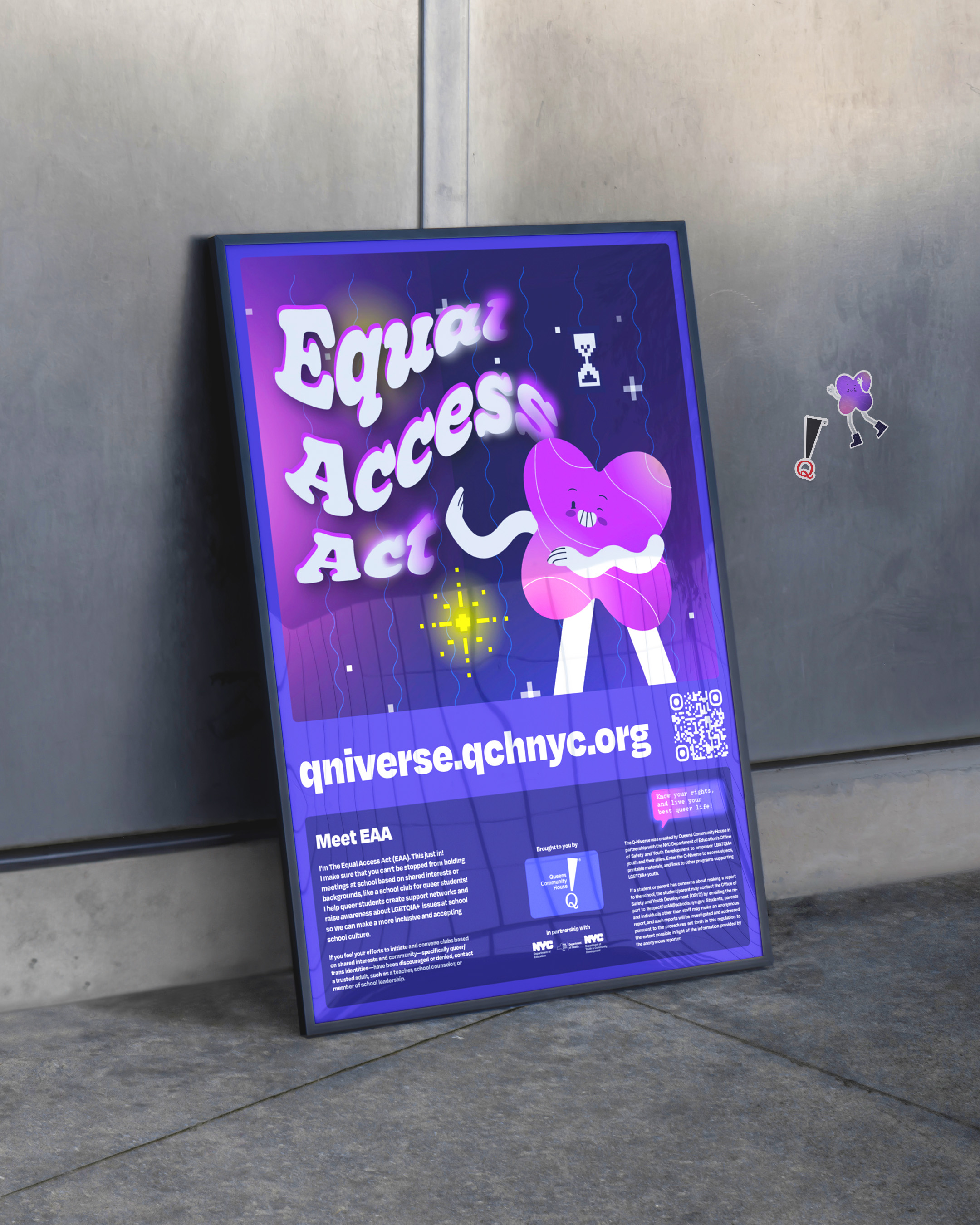 The Q-Niverse is a know-your-rights educational campaign that creates awareness for the laws protecting LGBTQIA+ Youth in New York City Public Schools. Created with Queens Community House, the New York Department of Education and JOAN Studios, the campaign consists of an educational video of each law personified, a minisite, downloadable posters for schools, and more.