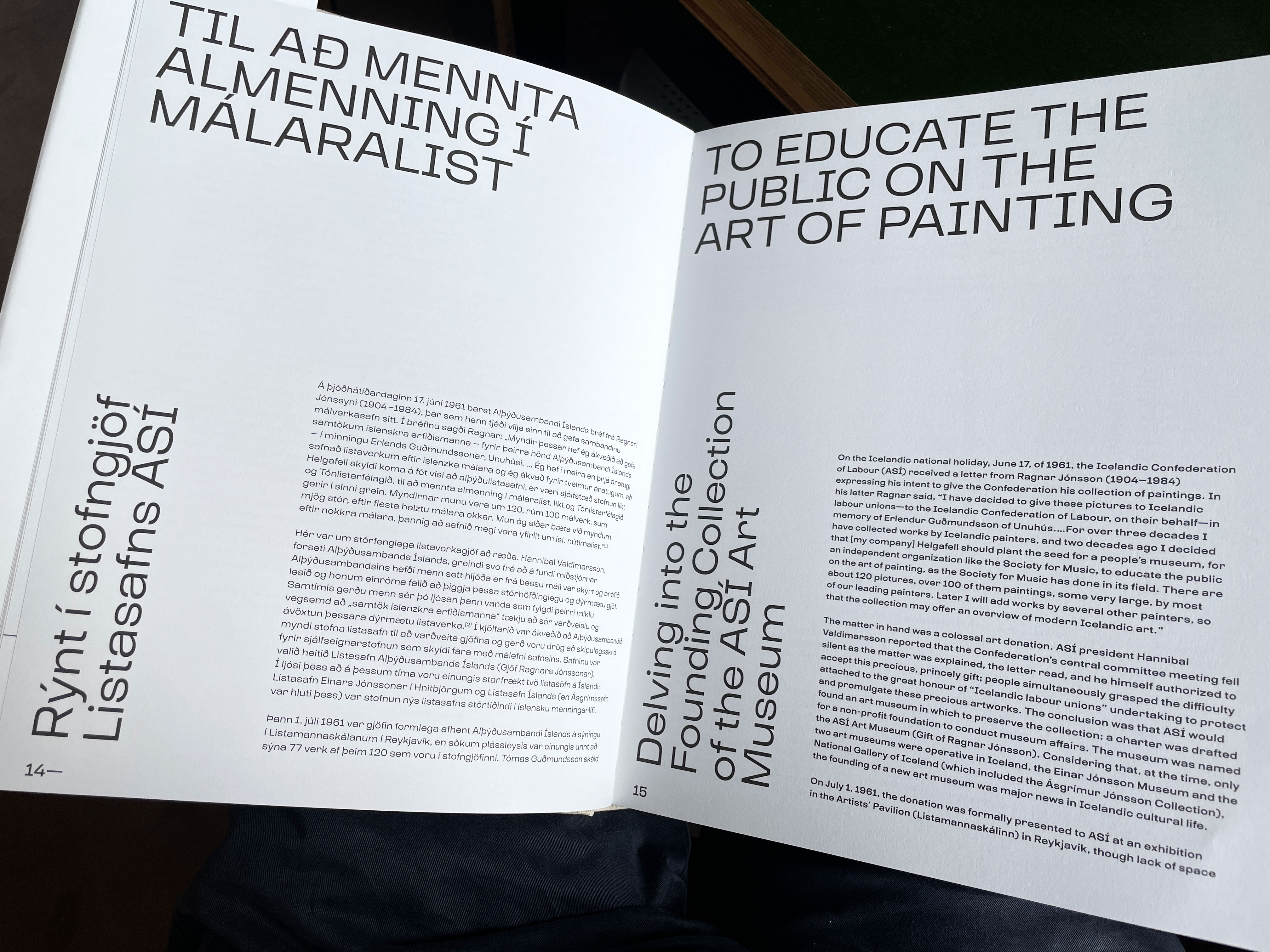 Gjöfin til Íslenzkrar Alþýðu / The Gift to the People was published in 2019, coinciding with the opening of an exhibition of the same name at the ASÍ Art Museum. This comprehensive publication includes all 147 works donated by collector Ragnar í Smára. Featuring pieces by many of the nation’s most renowned artists, the collection was the driving force behind the establishment of the ASÍ Art Museum. Ragnar’s vision was to create an art museum that would make art accessible to Iceland’s working class.