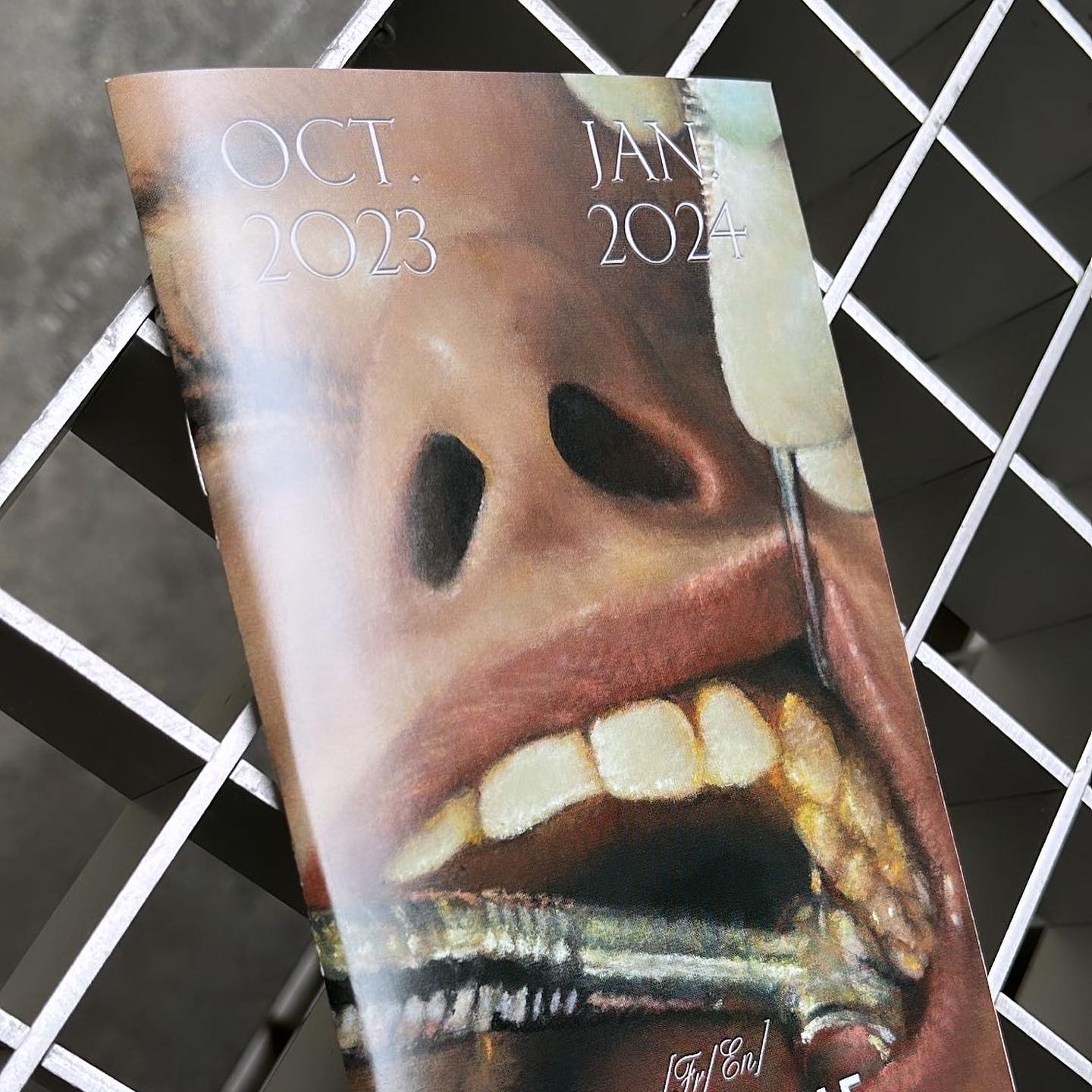 Curator Rebecca Lamarche-Vadel commissioned Pierre Vanni with the visual identity of the exhibition. Among the items designed by Vanni are the exhibition poster, subway ads, and a bilingual booklet. The selected artwork is an unnerving one, certainly for those of us who are dreading our next dentist’s appointment. It’s titled Study for Wednesday (oil on linen, 2022; © Issy Wood, courtesy the artist; Carlos/Ishikawa, London; and Michael Werner, New York. Photographer: Stephen James).