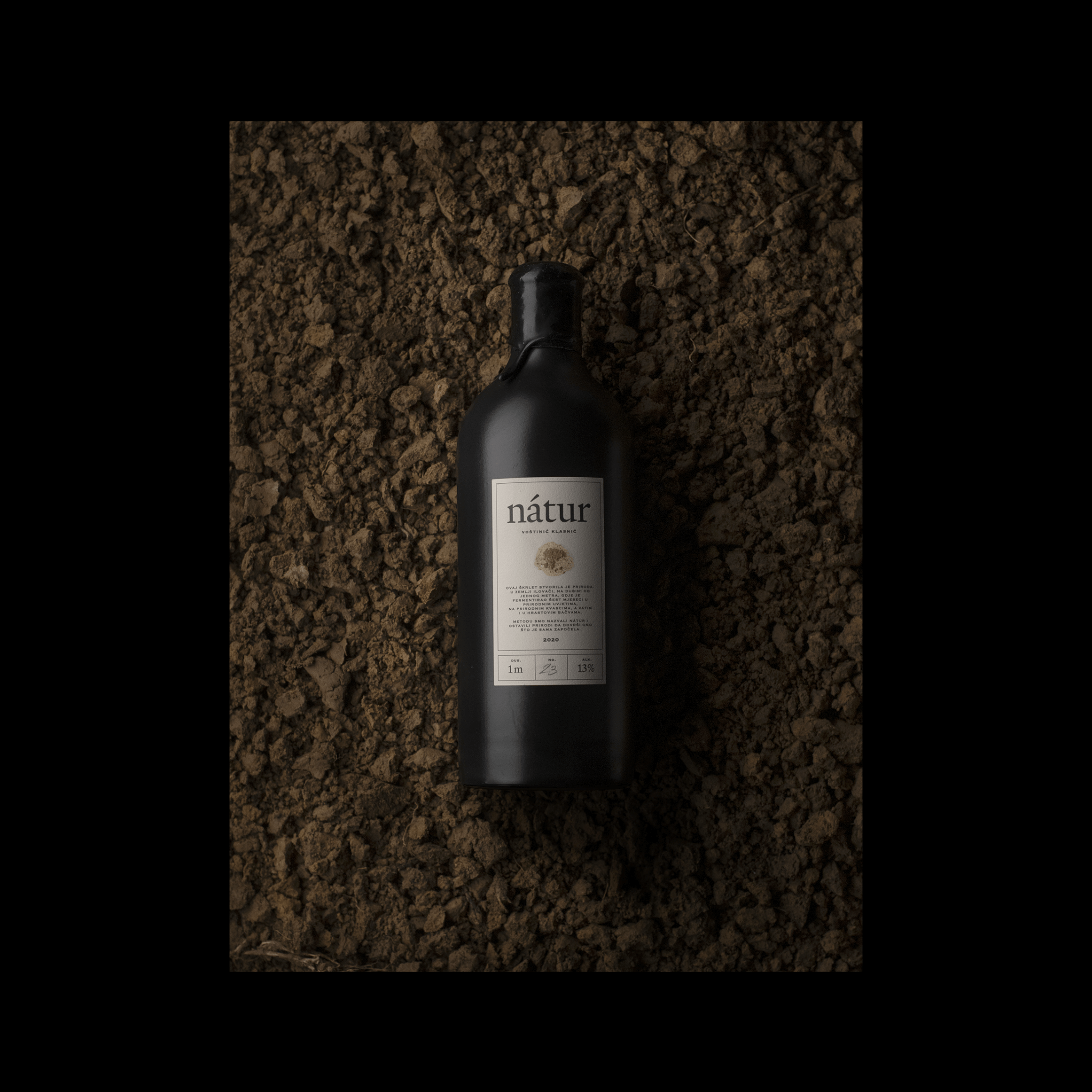 The term “terroir” comes from the French word for turf or soil, and it refers to the natural flavor and aroma specific to the habitat of the vineyard. Inspired by this insight, Studio Size created a creative concept that influenced both the product and the packaging. A wooden barrel filled with Nátur was buried one meter deep and left it to age for a month. Wooden barrels absorb scents from their environment, so the “terroir” was literally infused in the wine.