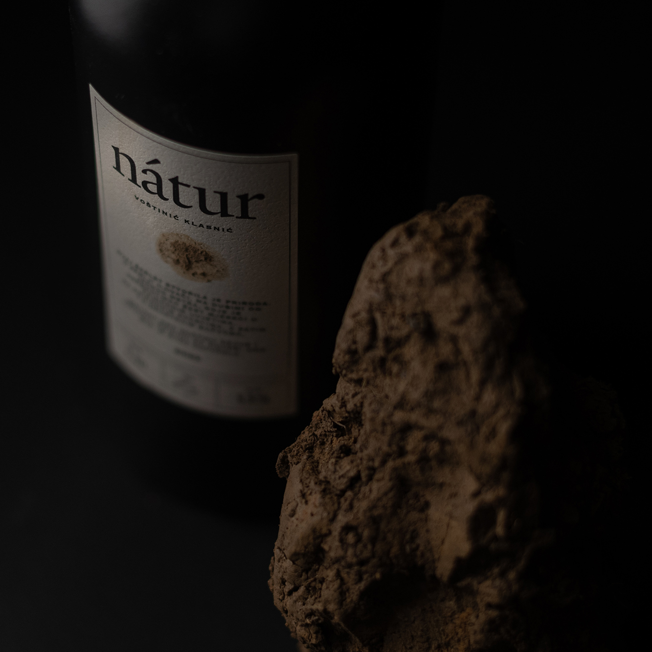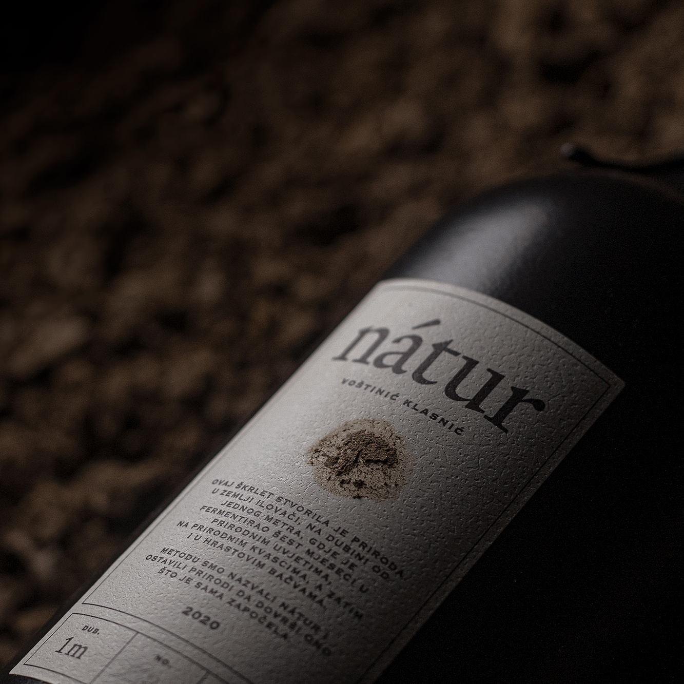 Instead of using typical glass bottles, the aged wine is filled in clay bottles. They symbolize the soil, but clay bottles also affect the taste of wine. Hence the wine was again influenced by the element of earth. Finally, the winemaker leaves his muddy fingerprint on the bottle label, symbolizing the creators of Nátur: his hands and the soil.
