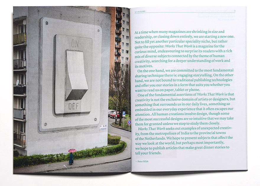 Works That Work is an “international magazine for the curious mind, intending to surprise its readers with a rich mix of diverse subjects connected by the theme of unexpected creativity that improved our lives.” It was launched in February 2013 by Peter Biľak, publisher and typeface designer in The Hague, NL. In an article about the project on his company’s website Typotheque, Bilak says “and as strange as it may seem, one of the first things that I started working on was its typeface.” Well, this doesn’t sound surprising at all, at least not if you know Biľak just a little bit. He continues: